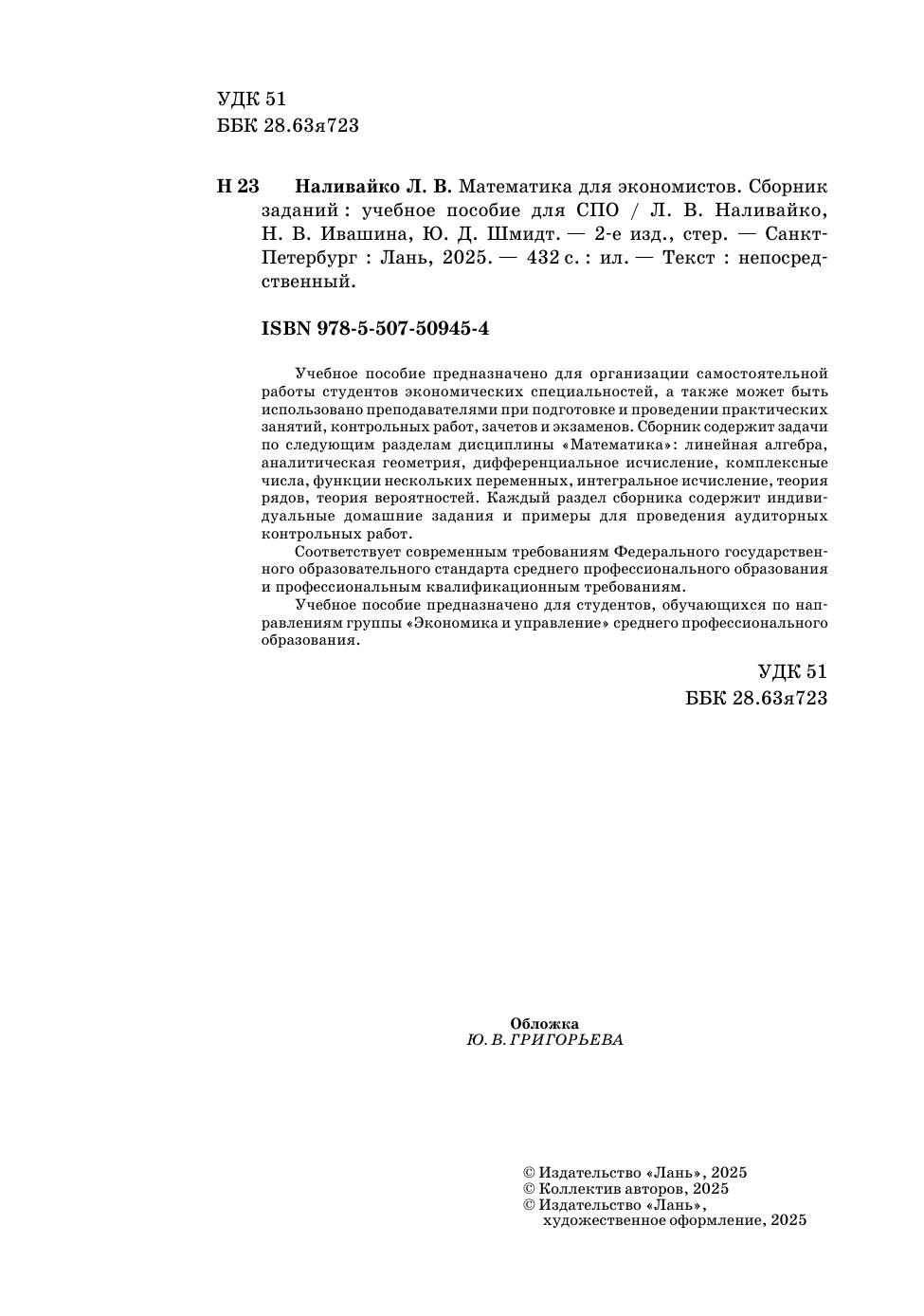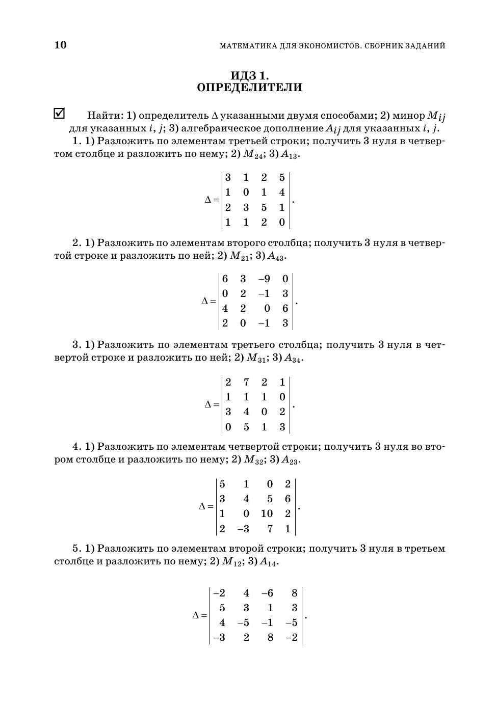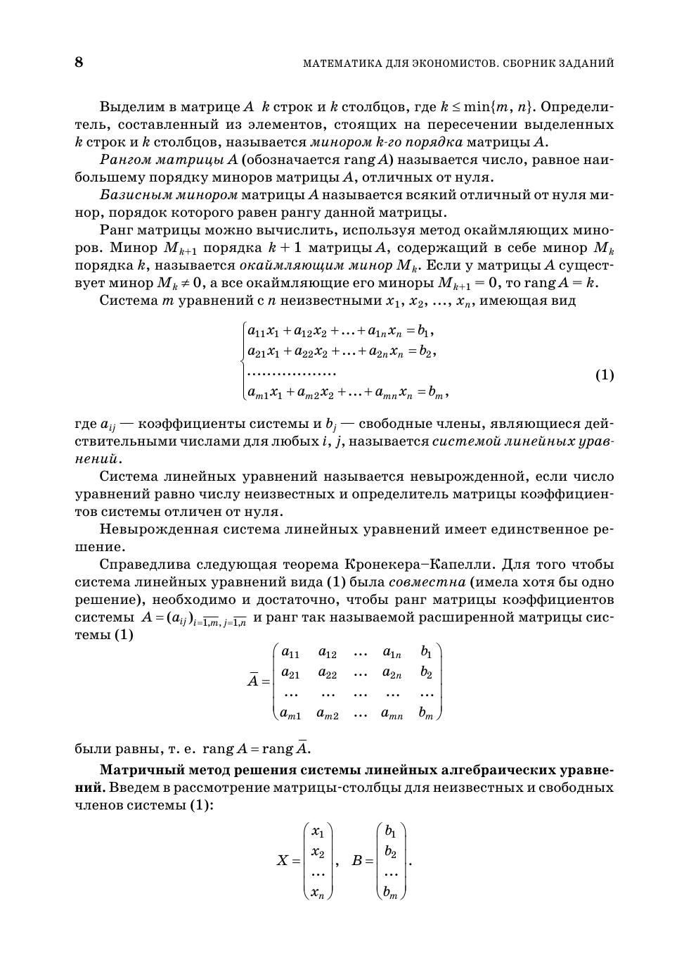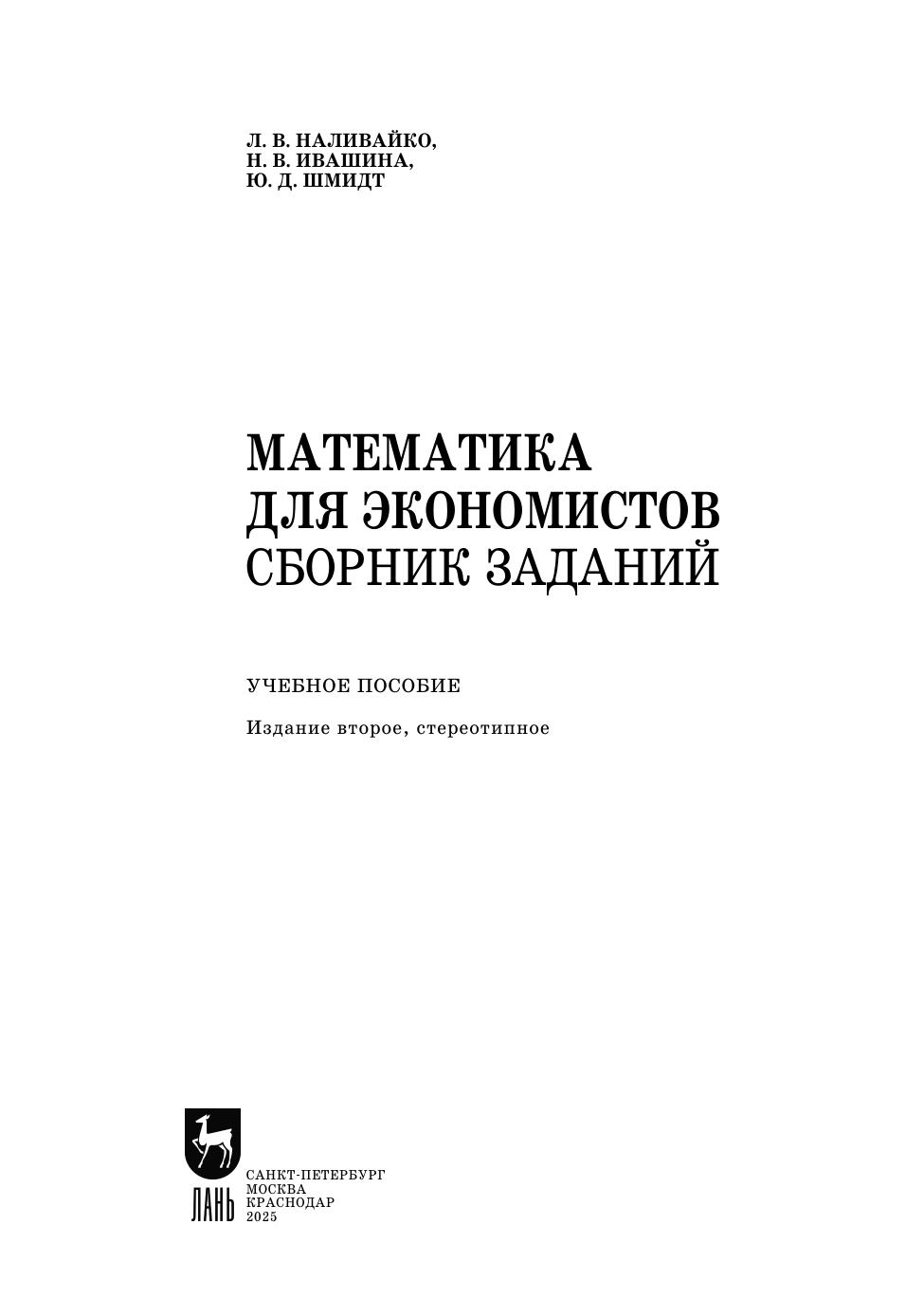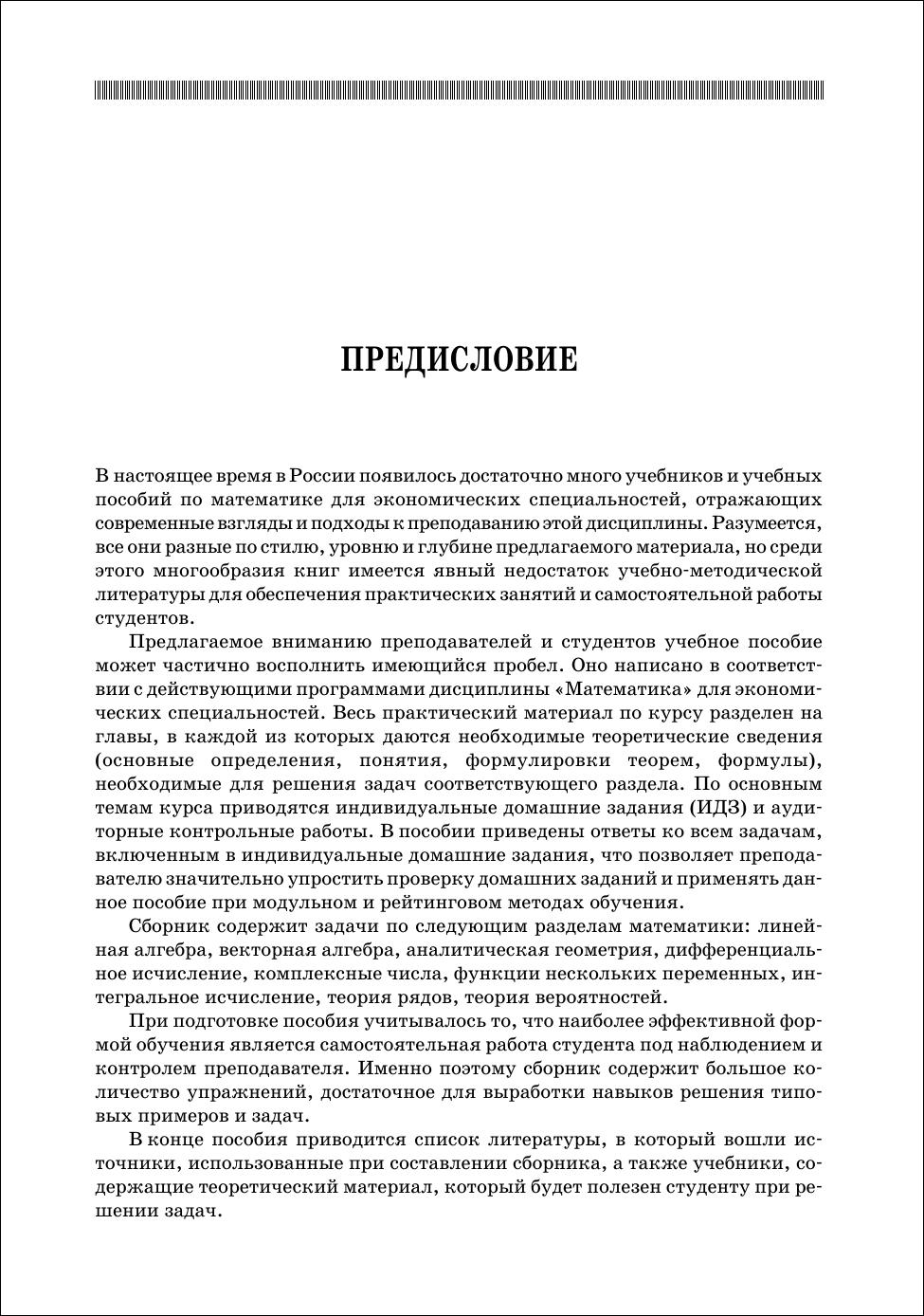 Учебное пособие предназначено для организации самостоятельной работы студентов экономических специальностей, а также может быть использовано преподавателями при подготовке и проведении практических занятий, контрольных работ, зачетов и экзаменов. Сборник содержит задачи по следующим разделам дисциплины «Математика»: линейная алгебра, аналитическая геометрия, дифференциальное исчисление, комплексные числа, функции нескольких переменных, интегральное исчисление, теория рядов, теория вероятностей. Каждый раздел сборника содержит индивидуальные домашние задания и примеры для проведения аудиторных контрольных работ. Соответствует современным требованиям Федерального государственного образовательного стандарта среднего профессионального образования и профессиональным квалификационным требованиям. Учебное пособие предназначено для студентов, обучающихся по направлениям группы «Экономика и управление» среднего профессионального образования.