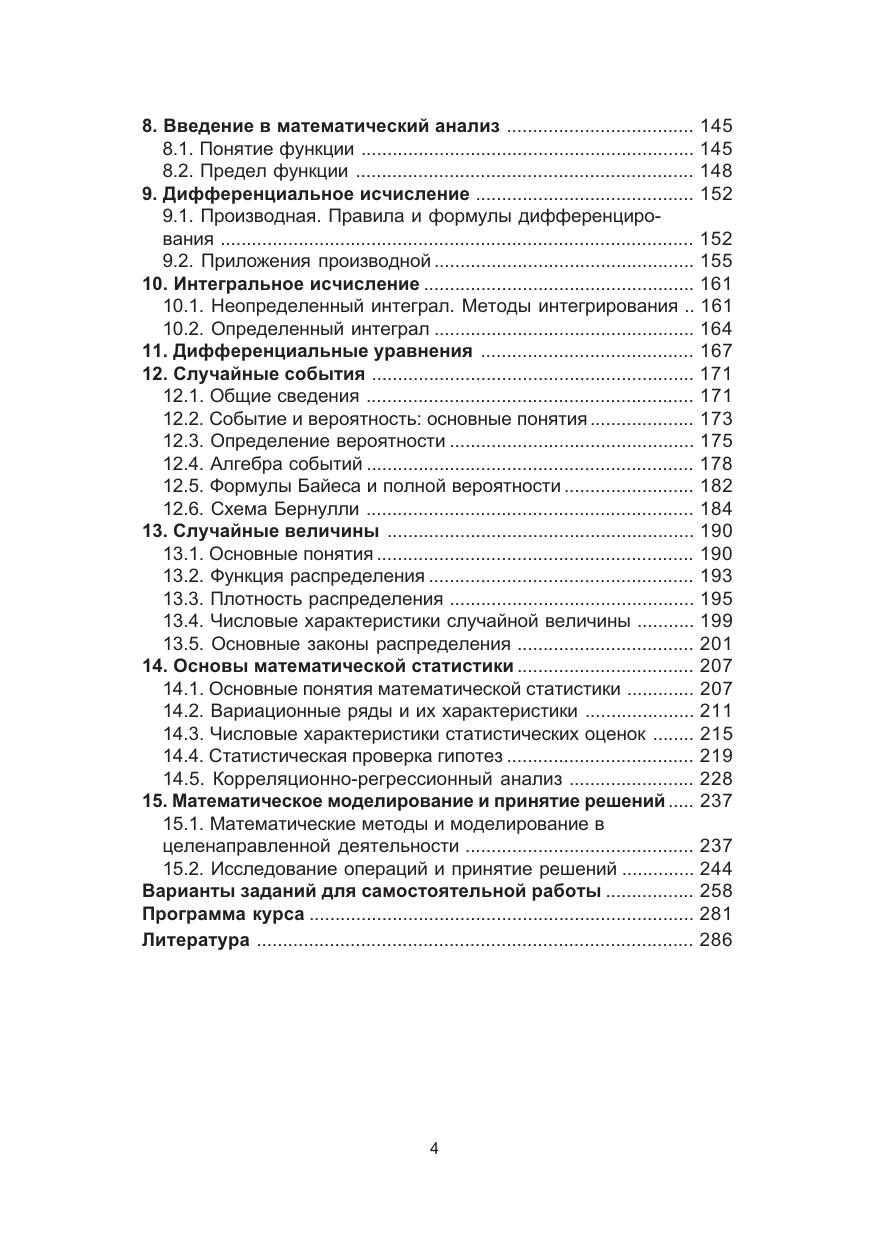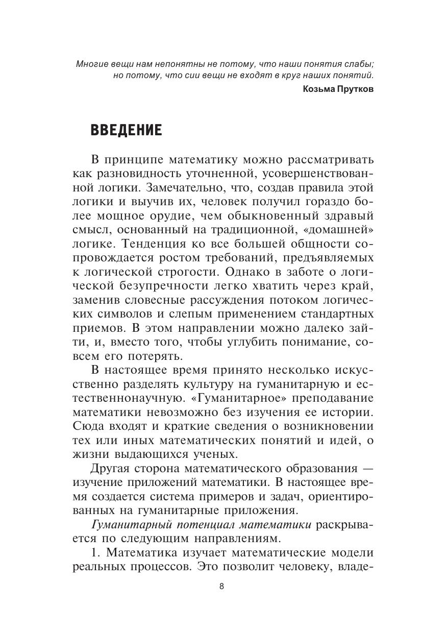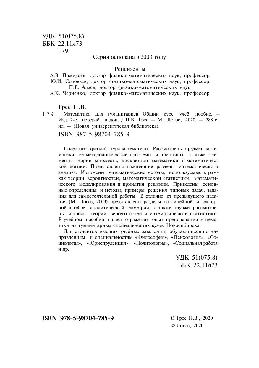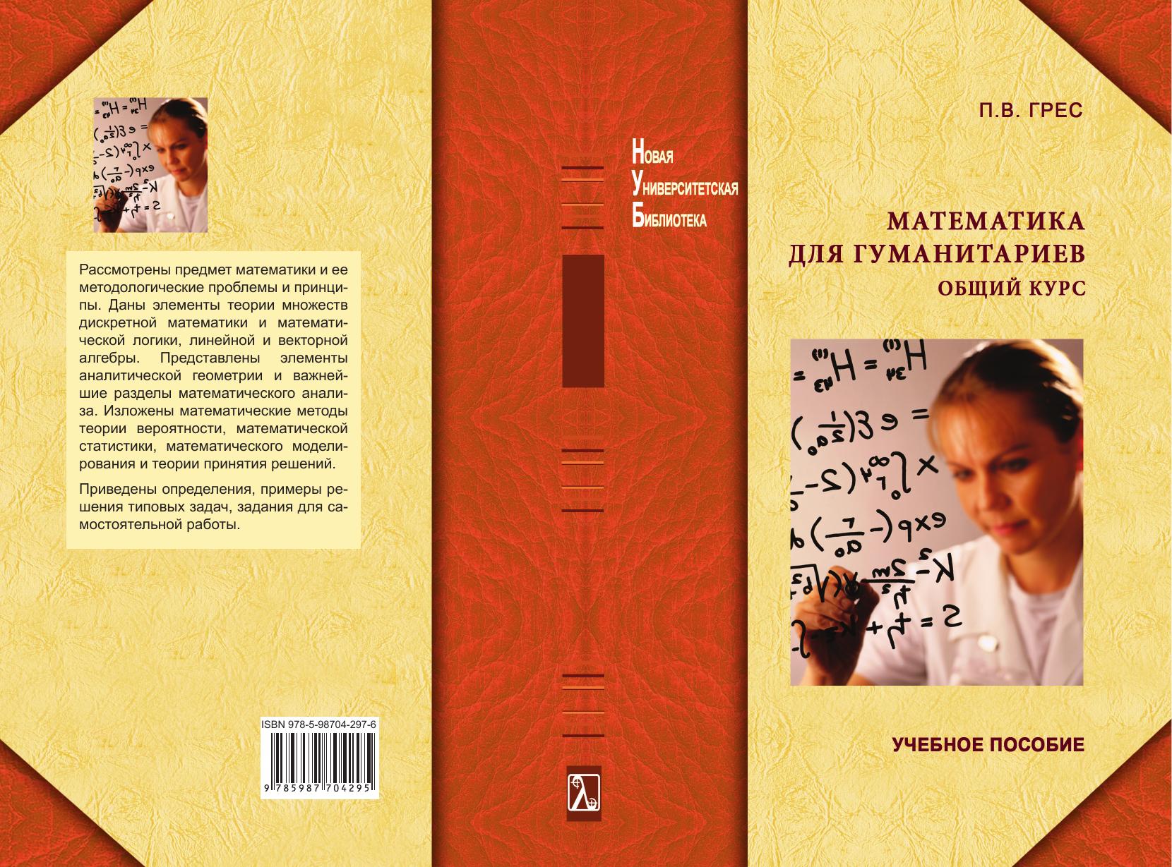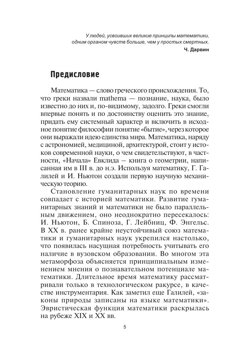 Содержит краткий курс математики. Рассмотрены предмет математики, ее методологические проблемы и принципы, а также элементы теории множеств, дискретной математики и математической логики. Представлены важнейшие разделы математического анализа. Изложены математические методы, используемые в рамках теории вероятностей, математической статистики, математического моделирования и принятия решений. Приведены основные определения и методы, примеры решения типовых задач, задания для самостоятельной работы. В отличие от предыдущего издания (М.: Логос, 2003) представлены разделы по линейной и векторной алгебре, аналитической геометрии, а также глубже рассмотрены вопросы теории вероятностей и математической статистики. В учебном пособии нашел отражение опыт преподавания математики на гуманитарных специальностях вузов Новосибирска. Для студентов высших учебных заведений, обучающихся по направлениям и специальностям «Философия», «Психология», «Социология», «Юриспруденция», «Политология», «Социальная работа» и др.