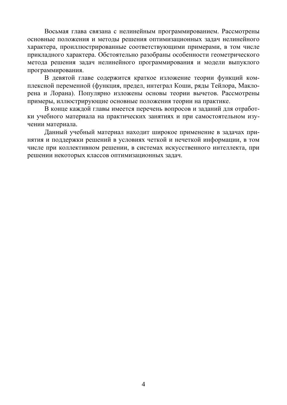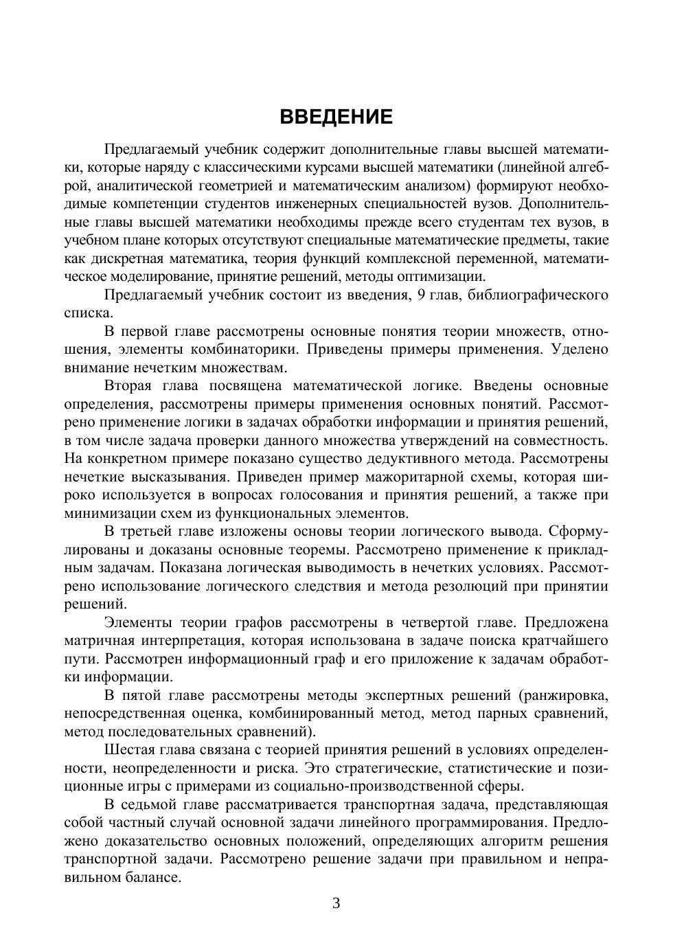 Учебник предназначен для студентов инженерных специальностей вузов. Он содержит дополнительный учебный материал, который наряду с классическими курсами высшей математики (линейной алгеброй, аналитической геометрией и математическим анализом) способствует освоению необходимых компетенций студентами инженерных специальностей. Учебник содержит введение, 9 глав, библиографический список. Рассмотрены разделы математики, посвященные теории множеств, математической логике, теории логического вывода, теории графов, экспертным методам, теории принятия решений, нелинейному программированию, транспортной задаче и теории функций комплексной переменной. Теоретические положения проиллюстрированы примерами, в том числе прикладного характера. В конце каждой главы приведены задачи для самостоятельного решения. Учебник может быть также полезен магистрам, аспирантам и преподавателям вузов.