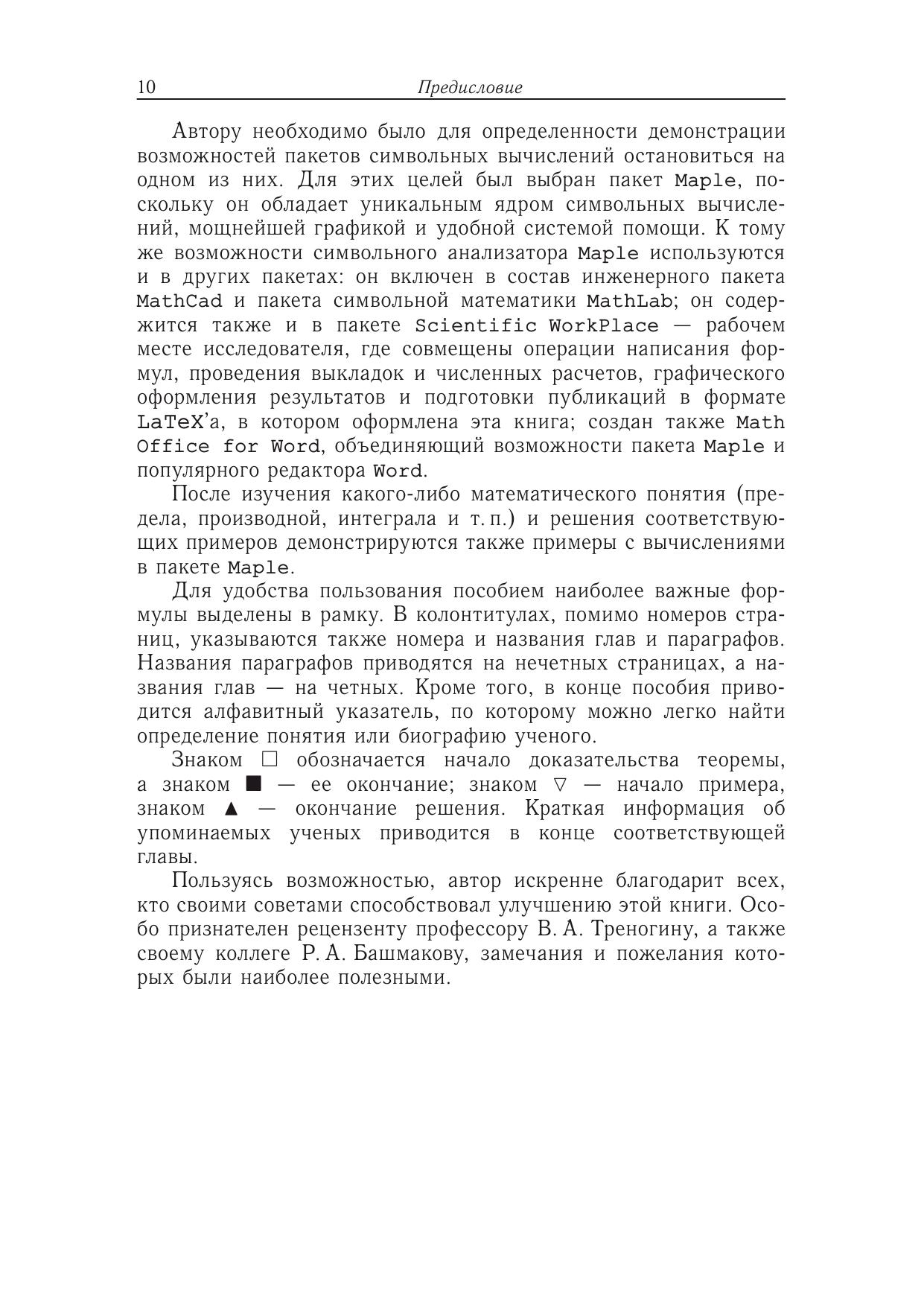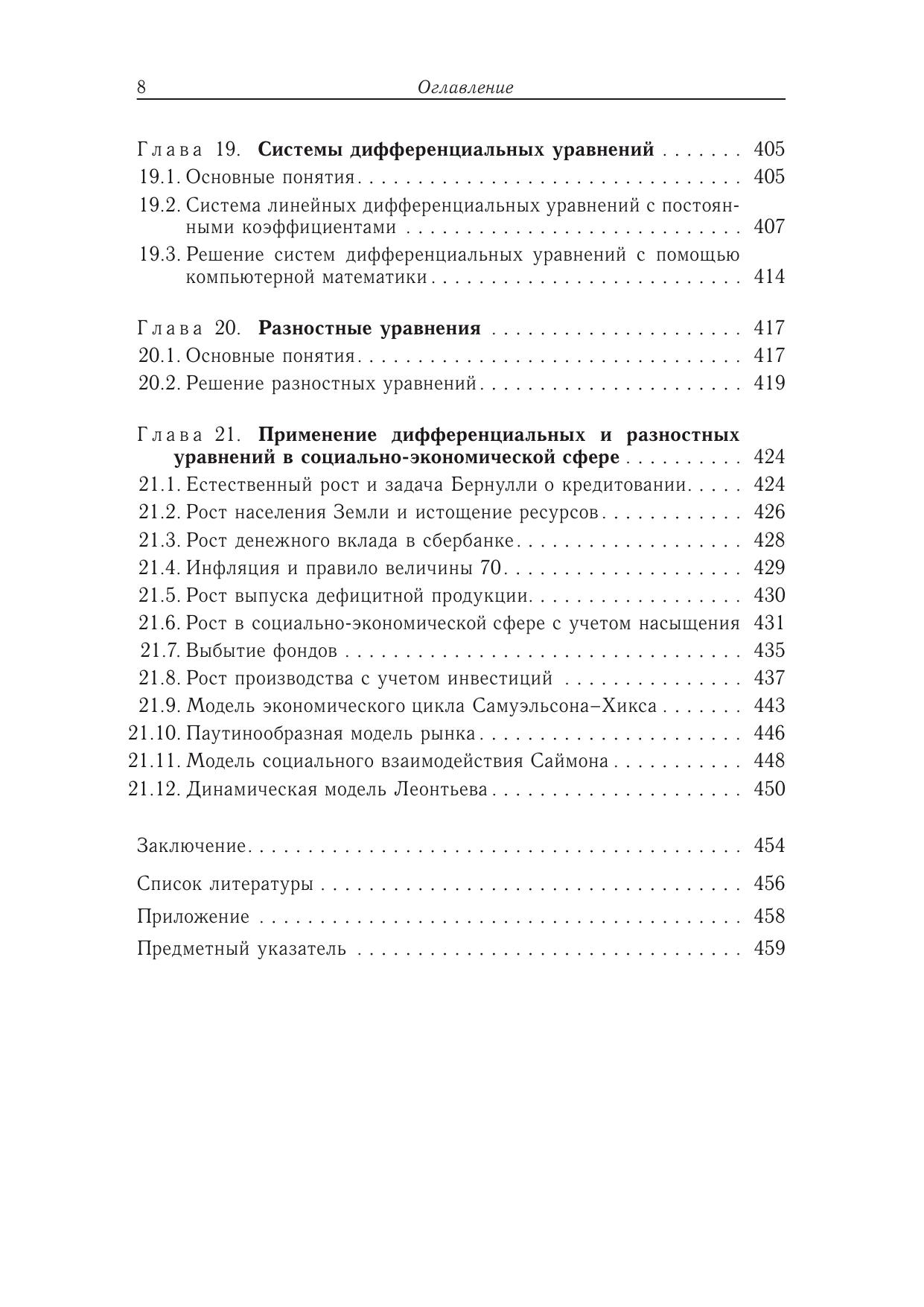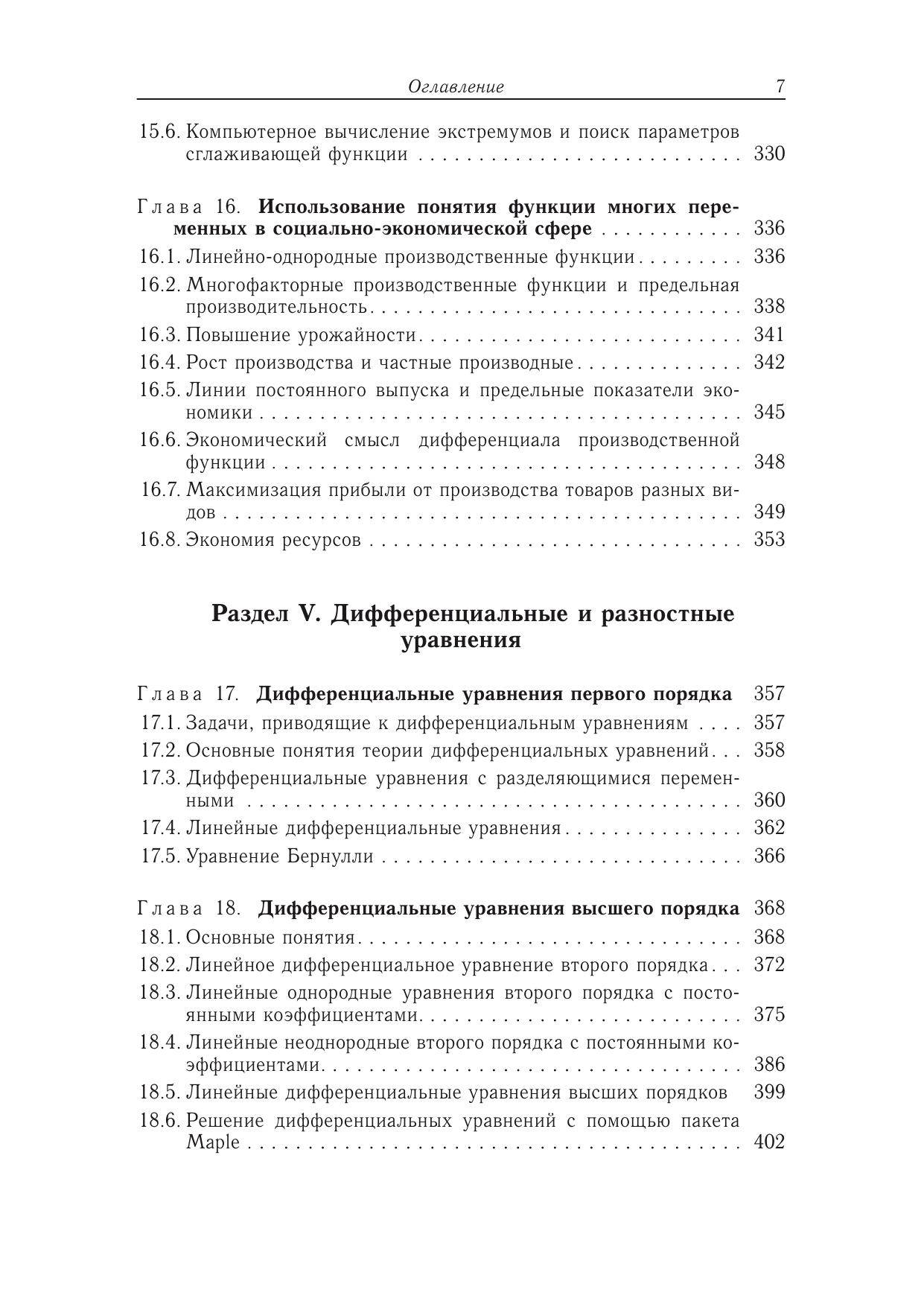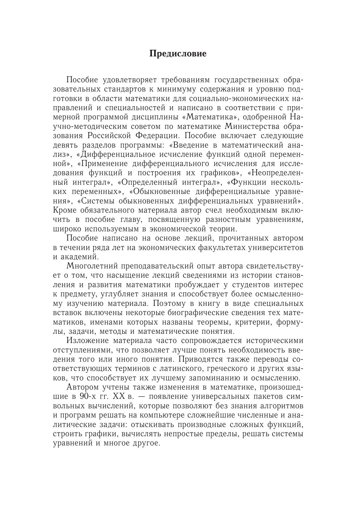 В пособии изложены основы математического анализа, математической логики, дифференциальных и разностных уравнений, сопровождаемые большим количеством примеров и задач. В конце каждой темы приведены соответствующие применения пакета символьных вычислений. Каждый раздел книги завершается главой, которая содержит применения теории данного раздела в социально-экономической сфере.Допущено Министерством образования Российской Федерации в качестве учебного пособия для студентов высших учебных заведений, обучающихся по социально-экономическим направлениям и специальностям.