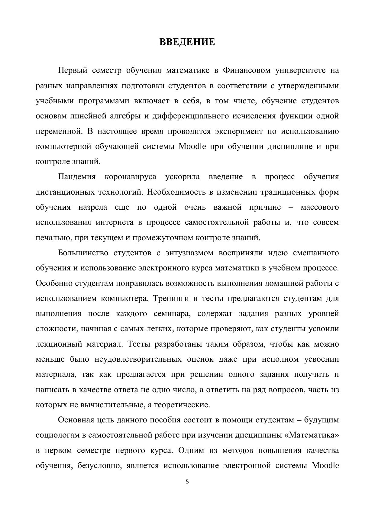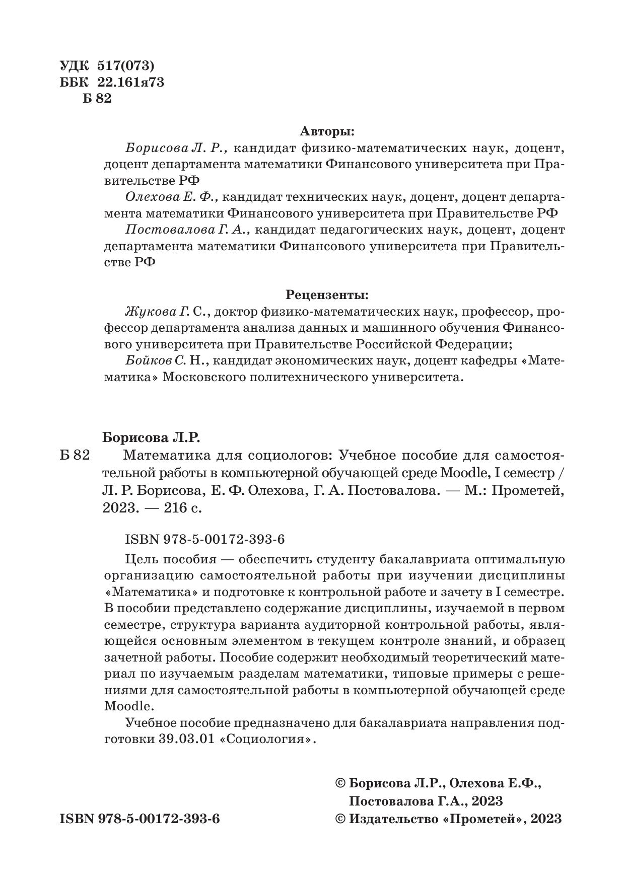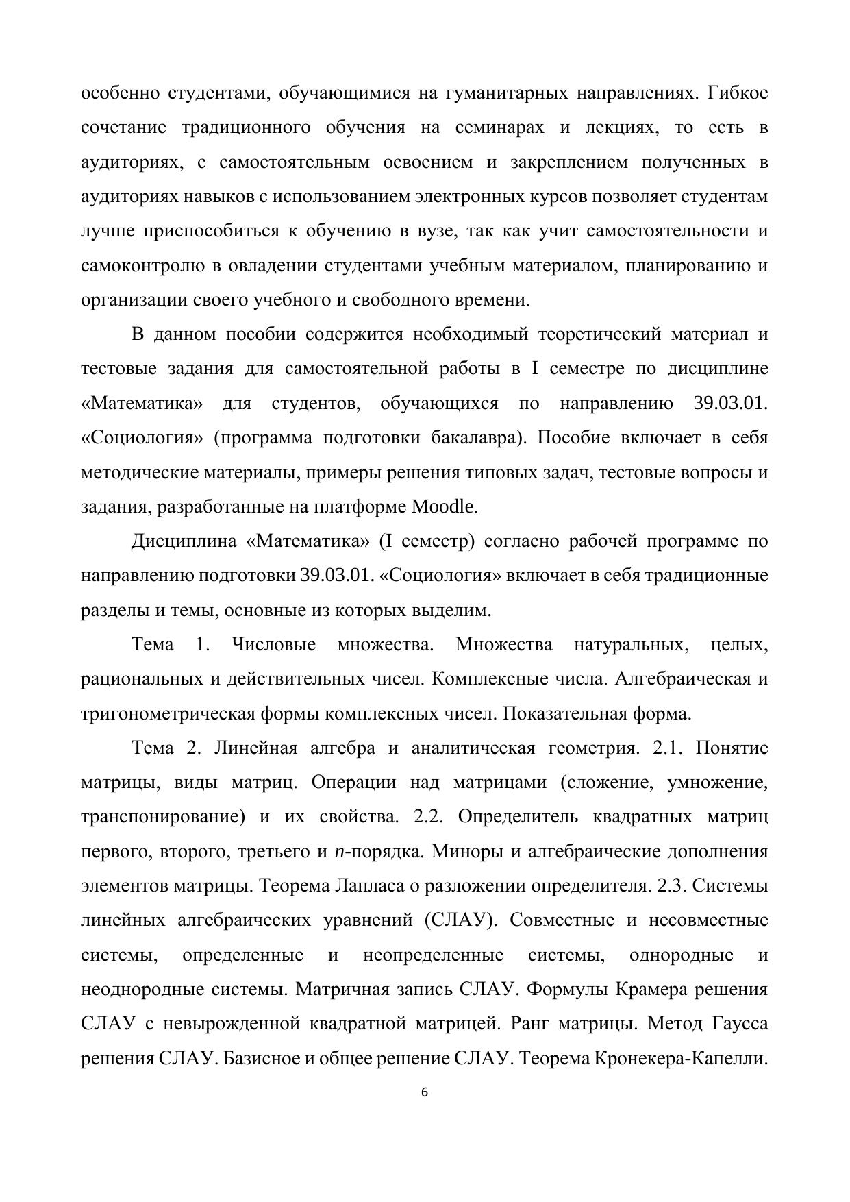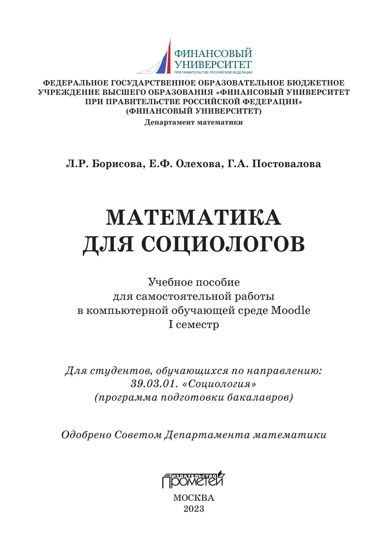 Цель пособия — обеспечить студенту бакалавриата оптимальную организацию самостоятельной работы при изучении дисциплины «Математика» и подготовке к контрольной работе и зачету в I семестре. В пособии представлено содержание дисциплины, изучаемой в первом семестре, структура варианта аудиторной контрольной работы, являющейся основным элементом в текущем контроле знаний, и образец зачетной работы. Пособие содержит необходимый теоретический материал по изучаемым разделам математики, типовые примеры с решениями для самостоятельной работы в компьютерной обучающей среде Moodle. Учебное пособие предназначено для бакалавриата направления подготовки 39.03.01 «Социология».