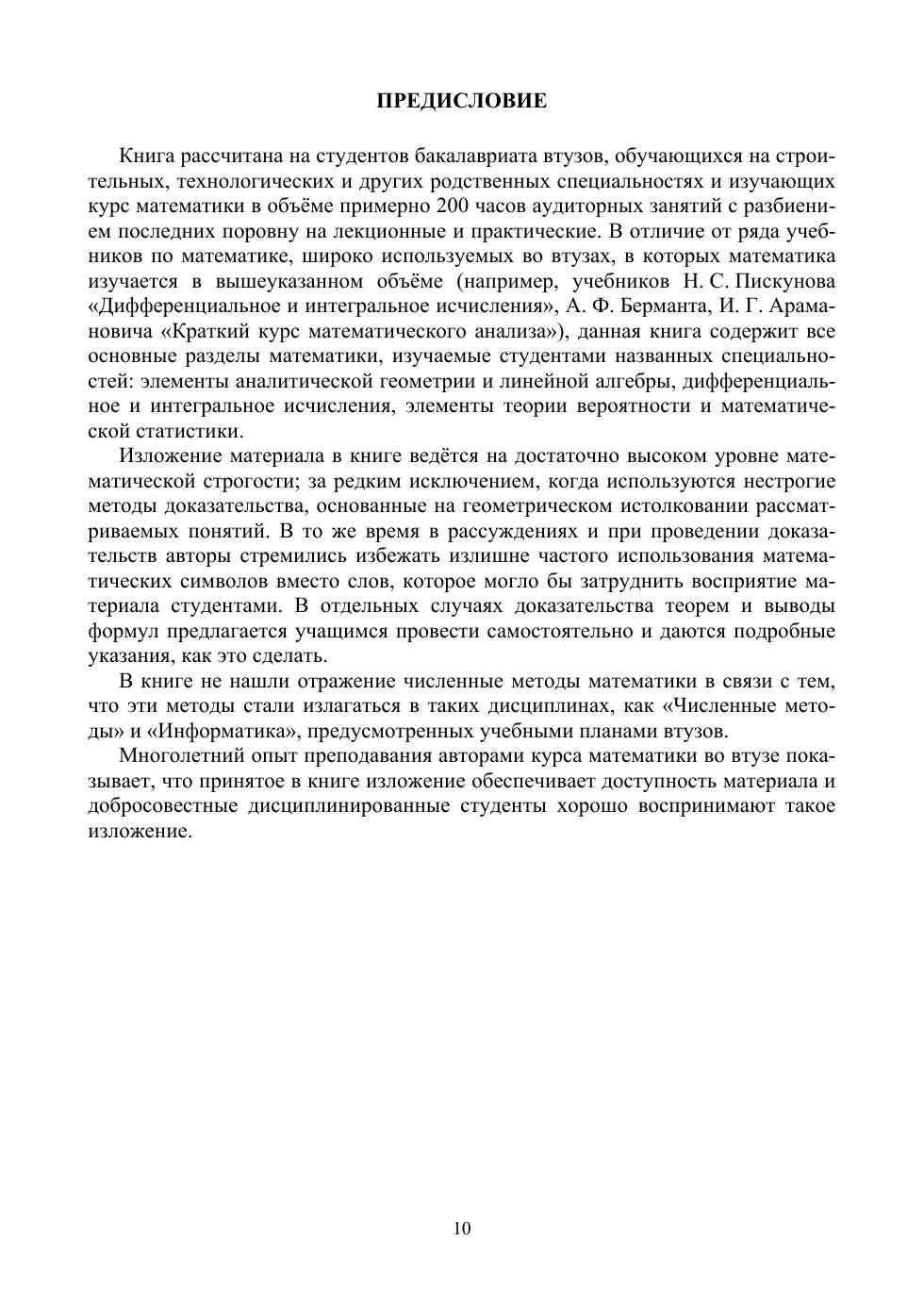 Книга содержит все основные разделы курса математики, изучаемого студентами вузов в объеме примерно 200 часов аудиторных занятий: элементы аналитической геометрии и линейной алгебры, дифференциальное и интегральное исчисления, элементы теории вероятностей и математической статистики. Предназначена для студентов вузов, обучающихся по направлениям подготовки, входящих в УГС: «Техника и технологии строительства», «Физико-технические науки и технологии», «Технологии материалов», и других технологических и родственных специальностей. Пособие также будет полезно для научных работников, преподавателей, аспирантов и студентов, специализирующихся в области математики и ее приложений.