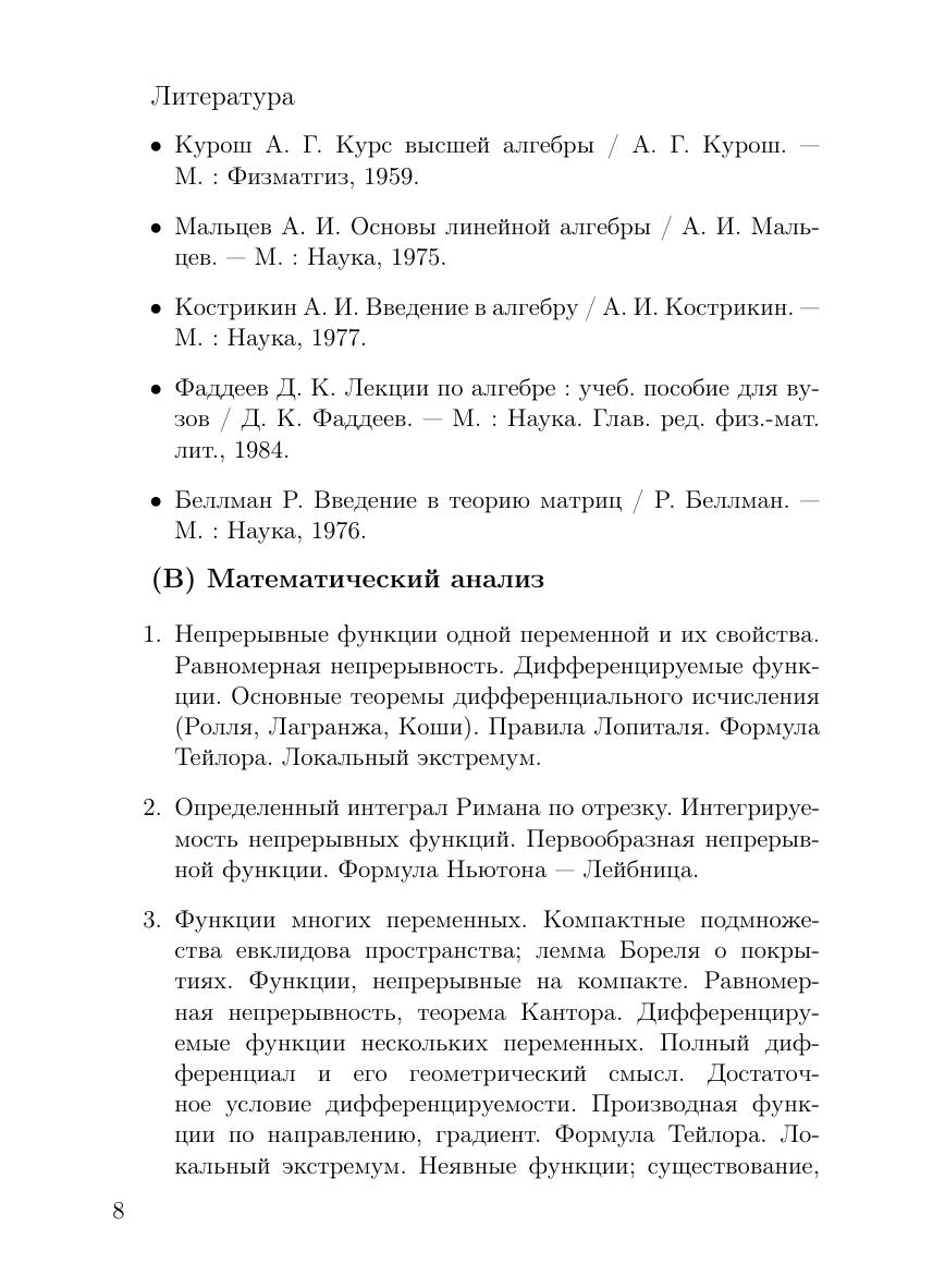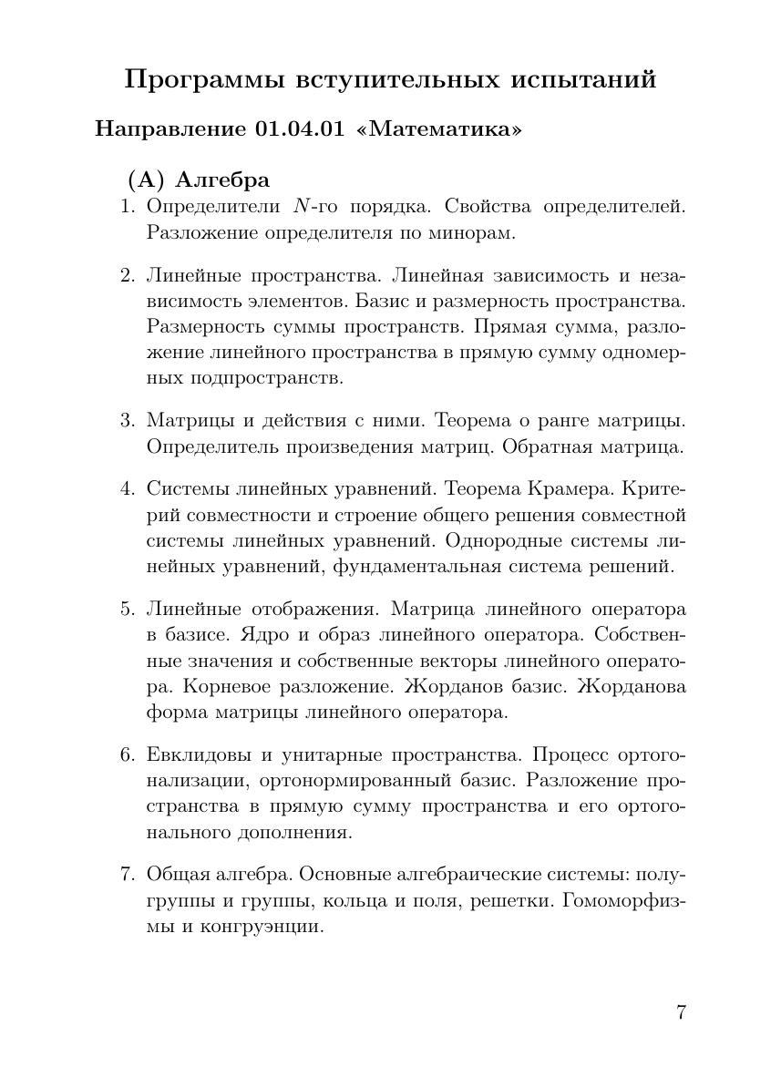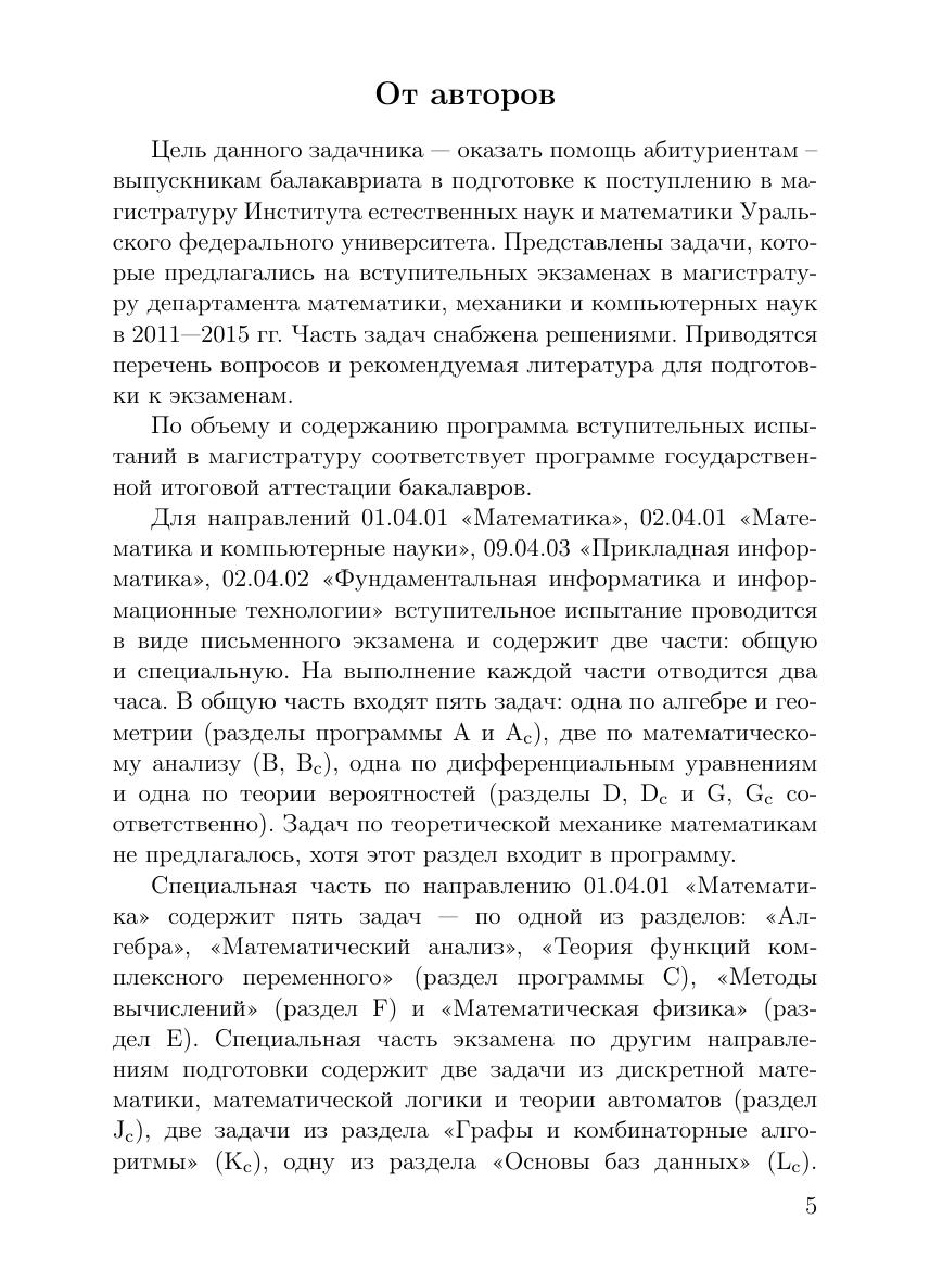 Даются задачи вступительных экзаменов в магистратуру департамента математики, механики и компьютерных наук с 2011 по 2015 г. Часть задач снабжена решениями. Приводятся перечень вопросов и рекомендуемая литература для подготовки к экзаменам. Для студентов, обучающихся по укрупненным группам направлений 010000 «Математика и механика», 020000 «Компьютерные и информационные науки», 090000 «Информатика и вычислительная техника».
