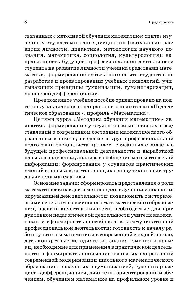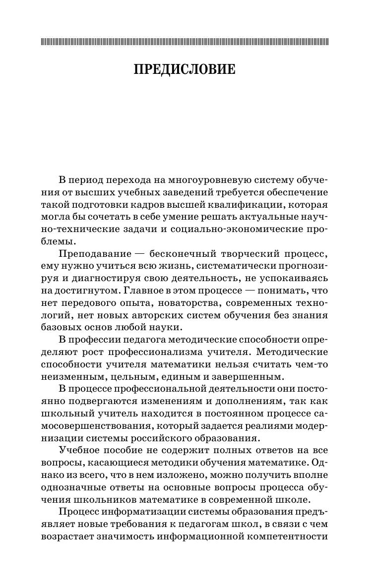 В учебном пособии рассматриваются пути решения актуальных проблем школьного математического образования, в обобщенном виде излагается материал по вопросам научно-методической организации профессиональной деятельности будущего учителя математики, по проектированию, разработке и применению современных технологий обучения, реализации различных дидактических методов, форм и средств обучения школьников математике. Учебное пособие адресовано студентам высших учебных заведений, обучающимся по направлению «Педагогическое образование», и преподавателям математических и физико-математических специальностей университетов и педагогических вузов, а также учителям школ, лицеев, гимназий с целью повышения их профессионального мастерства и формирования творческого подхода к процессу преподавания математики.