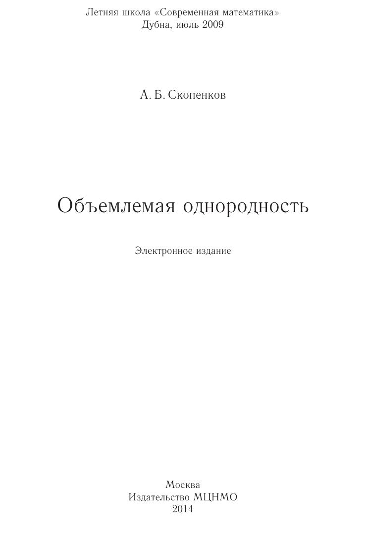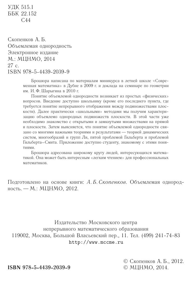 Брошюра написана по материалам миникурса в летней школе «Современная математика» в Дубне в 2009 г. и доклада на семинаре по геометрии им. И.Ф.Шарыгина в 2010 г. Понятие объемлемой однородности возникает из простых «физических»вопросов. Введение доступно школьнику (кроме его последнего пункта, где требуется понятие непрерывного отображения между подмножествами плоскости). Далее практически «школьными» методами мы получим характеризацию объемлемо однородных подмножеств плоскости. В этой части уже необходимо знакомство с открытыми и замкнутыми множествами на прямой и плоскости. Затем выясняется, что понятие объемлемой однородности связано со многими важными теориями и результатами —теорией динамических систем, многообразий и групп Ли, пятой проблемой Гильберта и проблемой Гильберта–Смита. Приложение доступно студенту, знакомому с этими понятиями. Брошюра адресована широкому кругу людей, интересующихся математикой. Она может быть интересным «легким чтением» для профессиональных математиков.