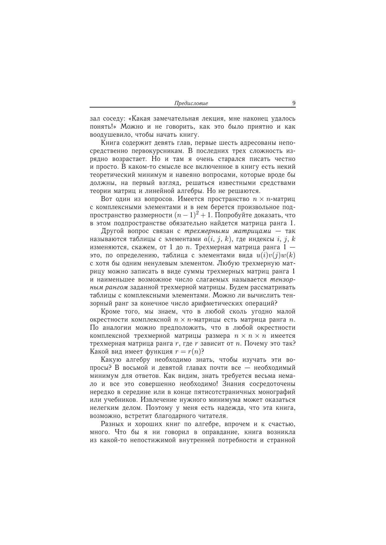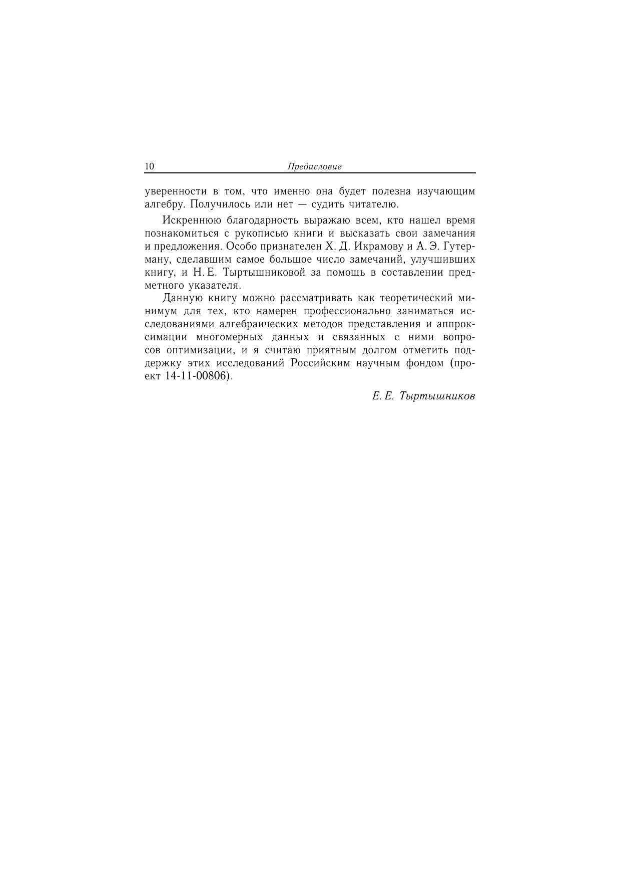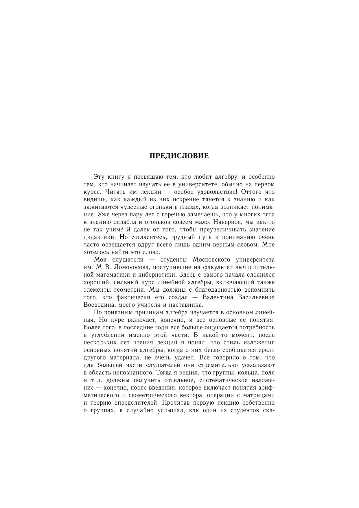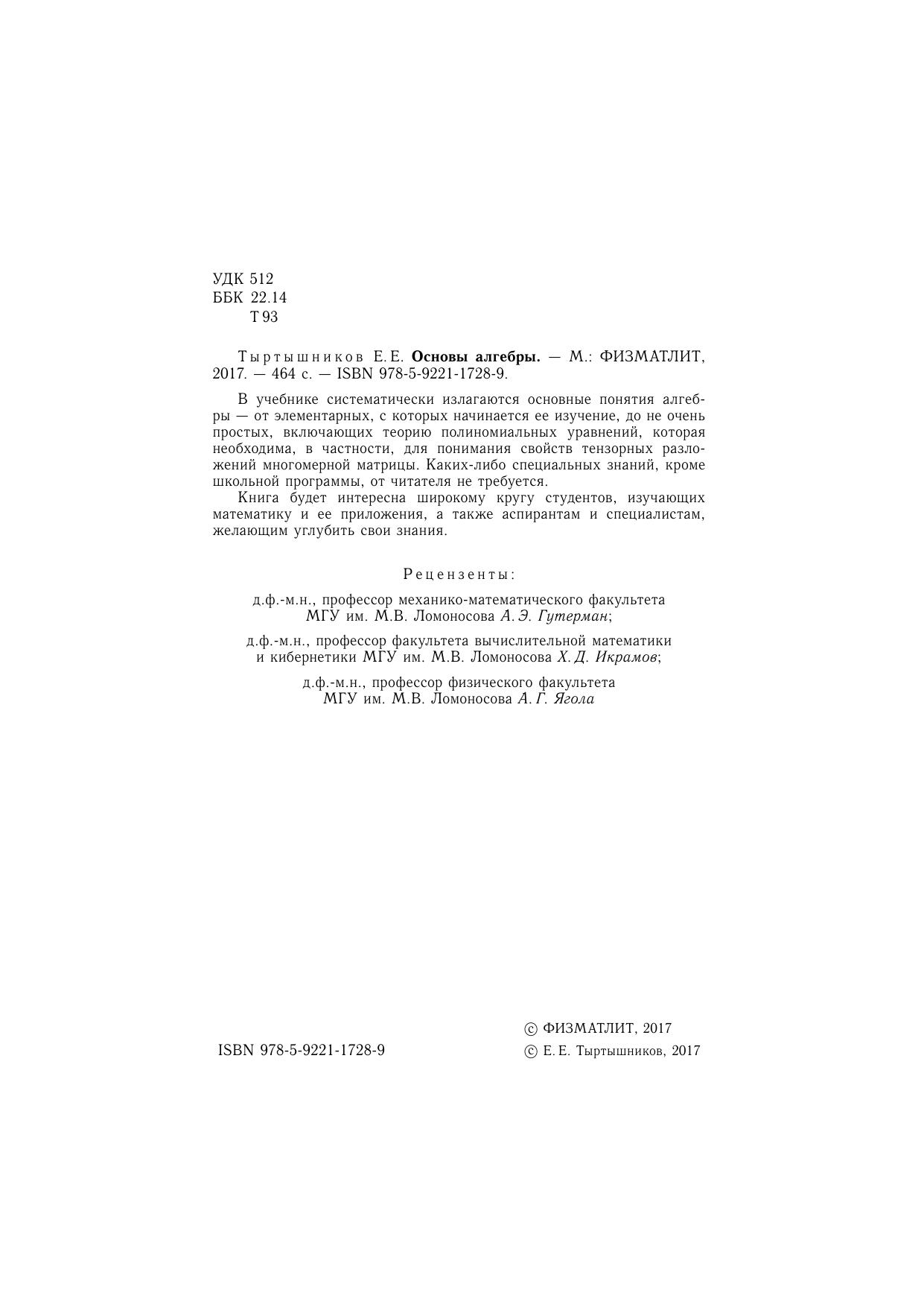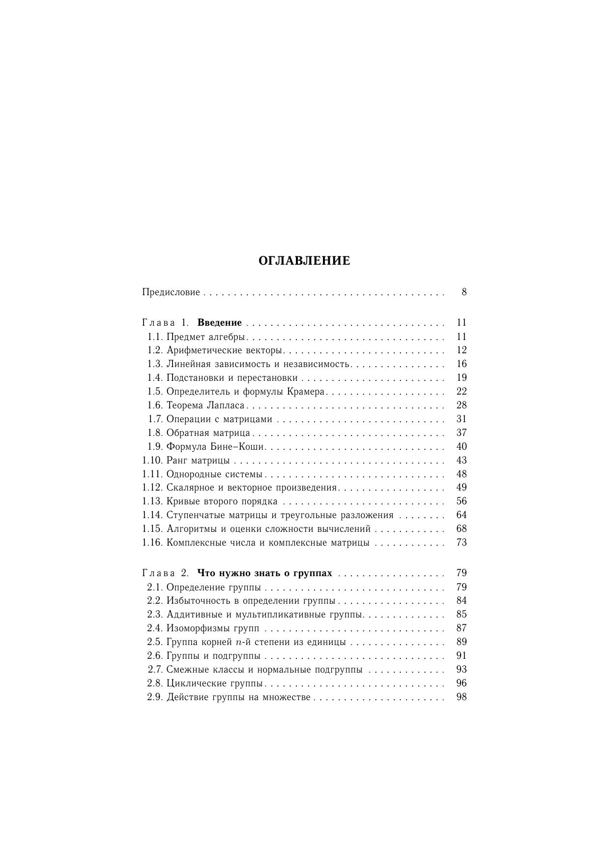 В учебнике систематически излагаются основные понятия алгебры — от элементарных, с которых начинается ее изучение, до не очень простых, включающих теорию полиномиальных уравнений, которая необходима, в частности, для понимания свойств тензорных разложений многомерной матрицы. Каких-либо специальных знаний, кроме школьной программы, от читателя не требуется. Книга будет интересна широкому кругу студентов, изучающих математику и ее приложения, а также аспирантам и специалистам, желающим углубить свои знания.
