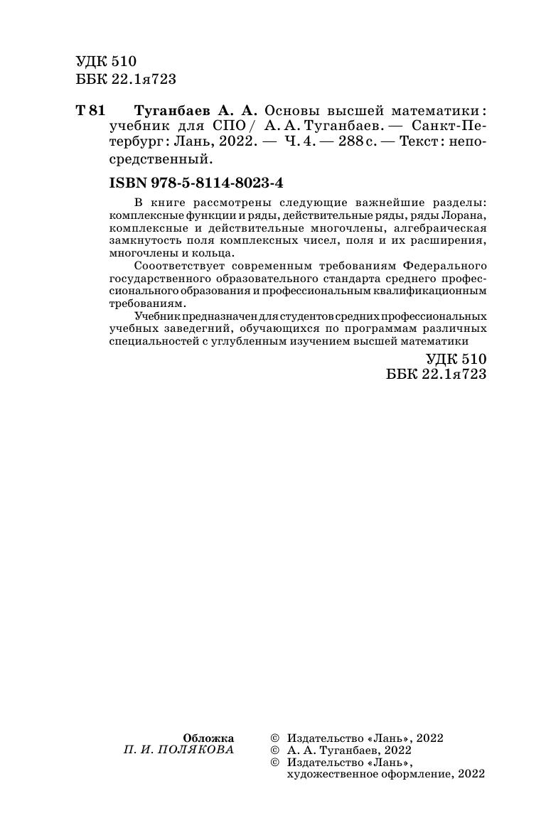 В книге рассмотрены следующие важнейшие разделы: комплексные функции и ряды, действительные ряды, ряды Лорана, комплексные и действительные многочлены, алгебраическая замкнутость поля комплексных чисел, поля и их расширения, многочлены и кольца. Сооответствует современным требованиям Федерального государственного образовательного стандарта среднего профессионального образования и профессиональным квалификационным требованиям. Учебник предназначен для студентов средних профессиональных учебных заведегний, обучающихся по программам различных специальностей с углубленным изучением высшей математики
