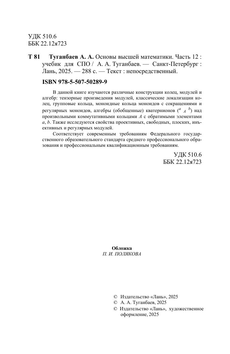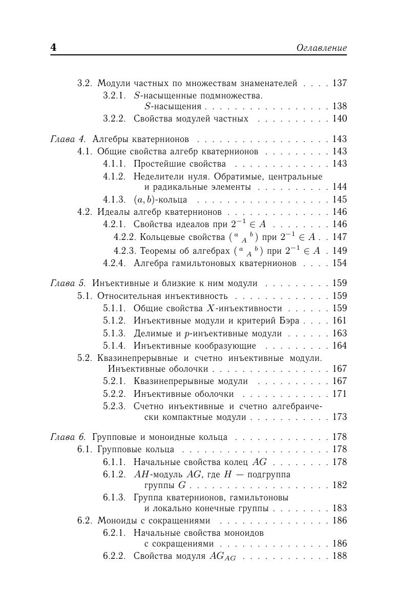 В данной книге изучаются различные конструкции колец, модулей и алгебр: тензорные произведения модулей, классические локализации колец, групповые кольца, моноидные кольца моноидов с сокращениями и регулярных моноидов, алгебры (обобщенные) кватернионов (a A b) над произвольными коммутативными кольцами A с обратимыми элементами a, b. Также исследуются свойства проективных, свободных, плоских, инъективных и регулярных модулей. Соответствует современным требованиям Федерального государственного образовательного стандарта среднего профессионального образования и профессиональным квалификационным требованиям.