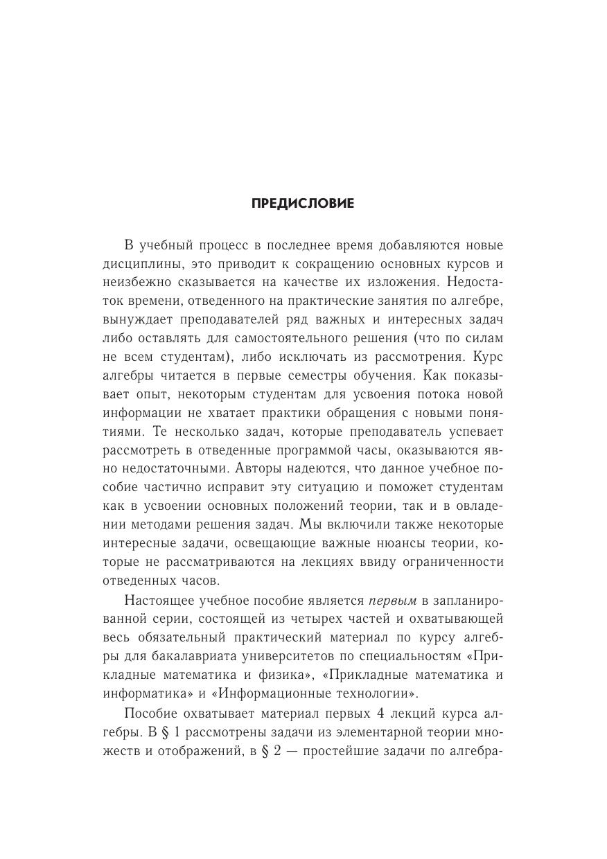 Книга охватывает материал первых лекций курса алгебры. В пособии рассмотрены задачи из элементарной теории множеств и отображений, простейшие задачи по алгебраическим структурам, задачи по элементарной теории чисел, комбинаторные задачи.