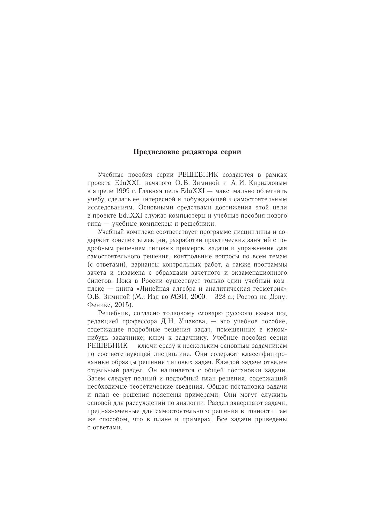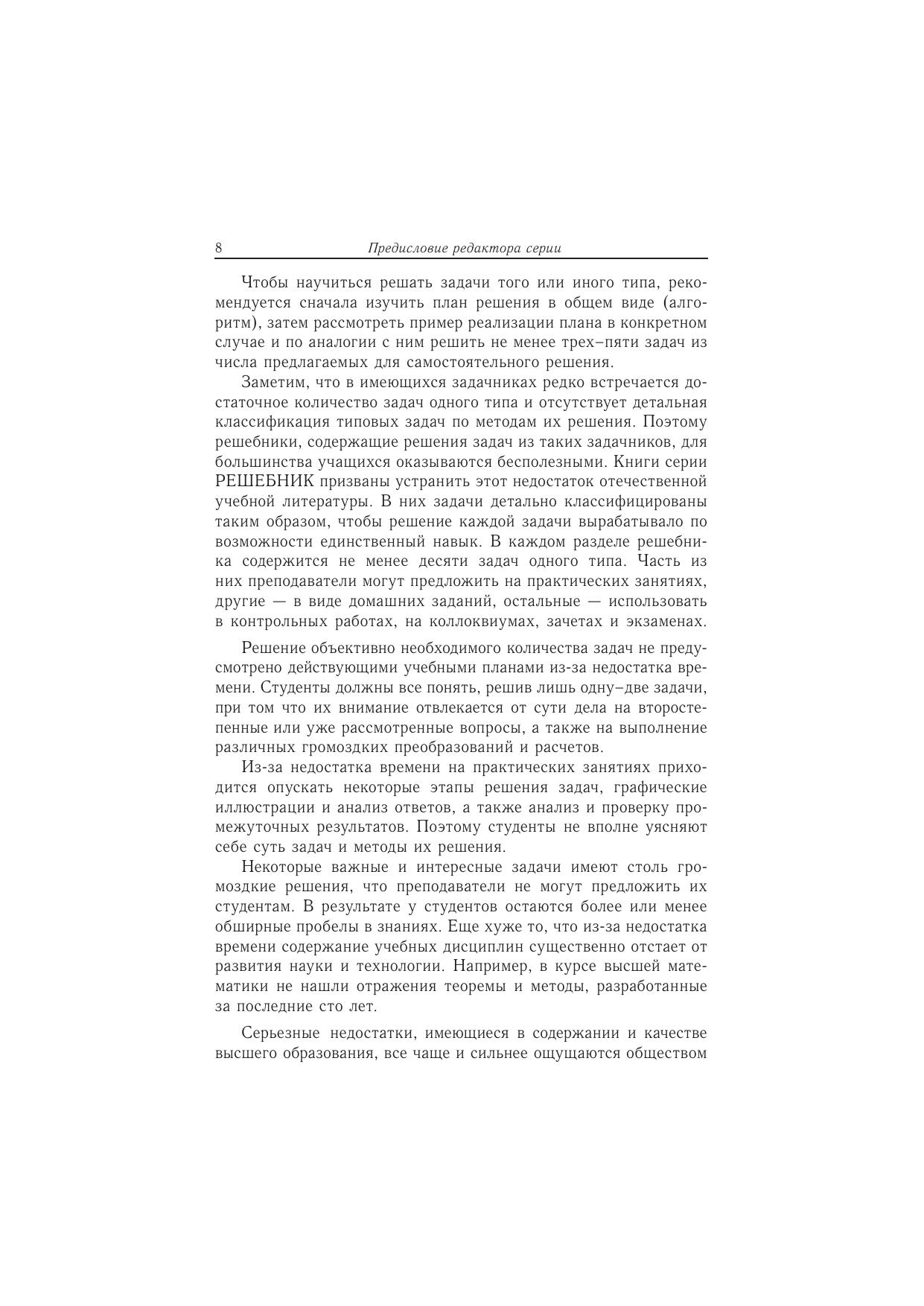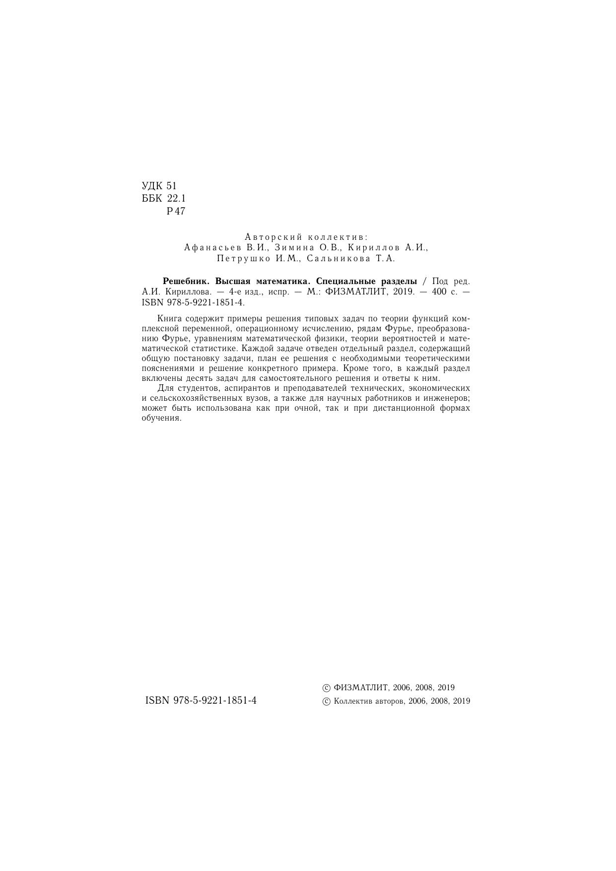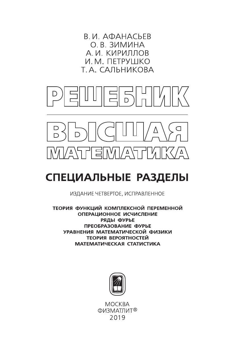 Книга содержит примеры решения типовых задач по теории функций комплексной переменной, операционному исчислению, рядам Фурье, преобразованию Фурье, уравнениям математической физики, теории вероятностей и математической статистике. Каждой задаче отведен отдельный раздел, содержащий общую постановку задачи, план ее решения с необходимыми теоретическими пояснениями и решение конкретного примера. Кроме того, в каждый раздел включены десять задач для самостоятельного решения и ответы к ним. Для студентов, аспирантов и преподавателей технических, экономических и сельскохозяйственных вузов, а также для научных работников и инженеров; может быть использована как при очной, так и при дистанционной формах обучения.