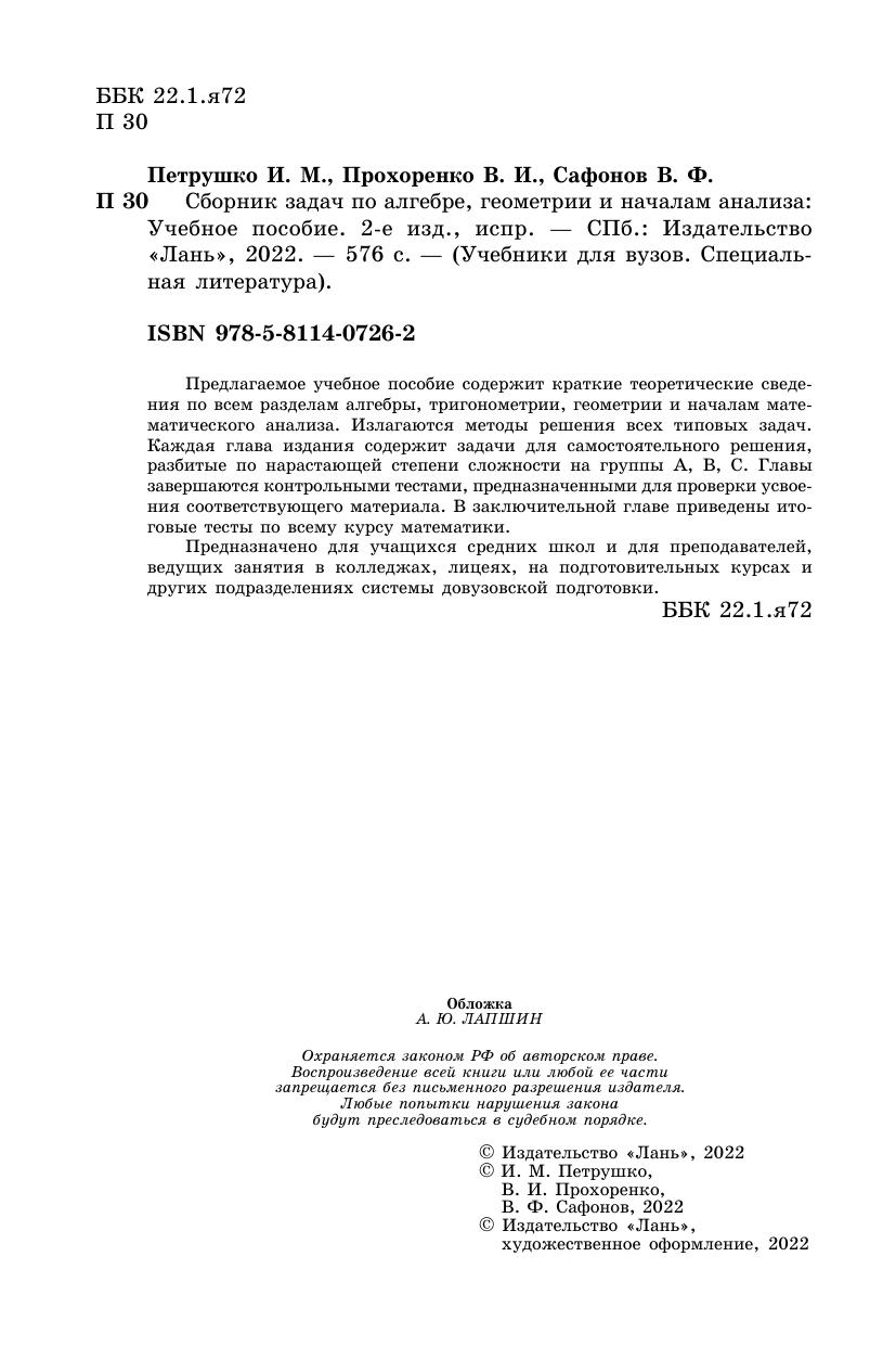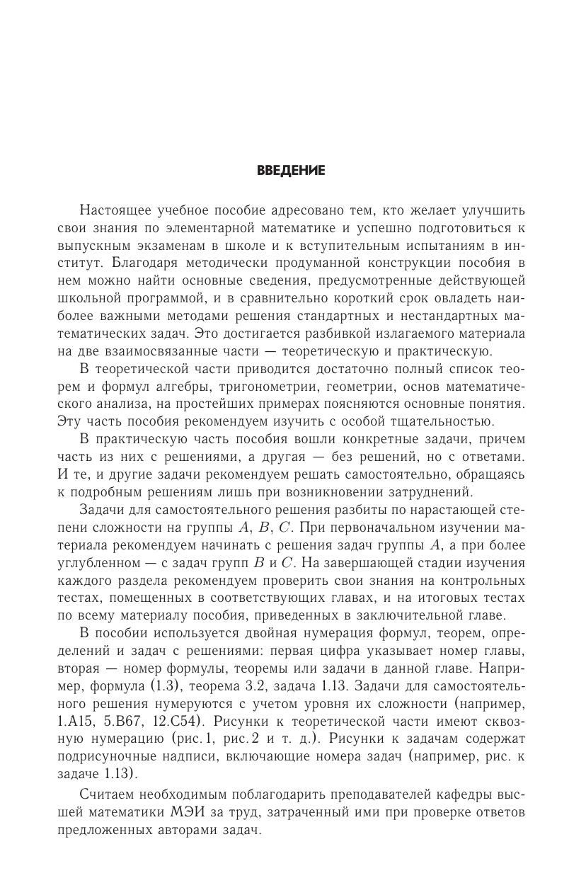 Предлагаемое учебное пособие содержит краткие теоретические сведения по всем разделам алгебры, тригонометрии, геометрии и началам математического анализа. Излагаются методы решения всех типовых задач. Каждая глава издания содержит задачи для самостоятельного решения, разбитые по нарастающей степени сложности на группы A,B,C. Главы завершаются контрольными тестами, предназначенными для проверки усвоения соответствующего материала. В заключительной главе приведены итоговые тесты по всему курсу математики. Предназначено для учащихся средних школ и для преподавателей, ведущих занятия в колледжах, лицеях, на подготовительных курсах и других подразделениях системы довузовской подготовки.