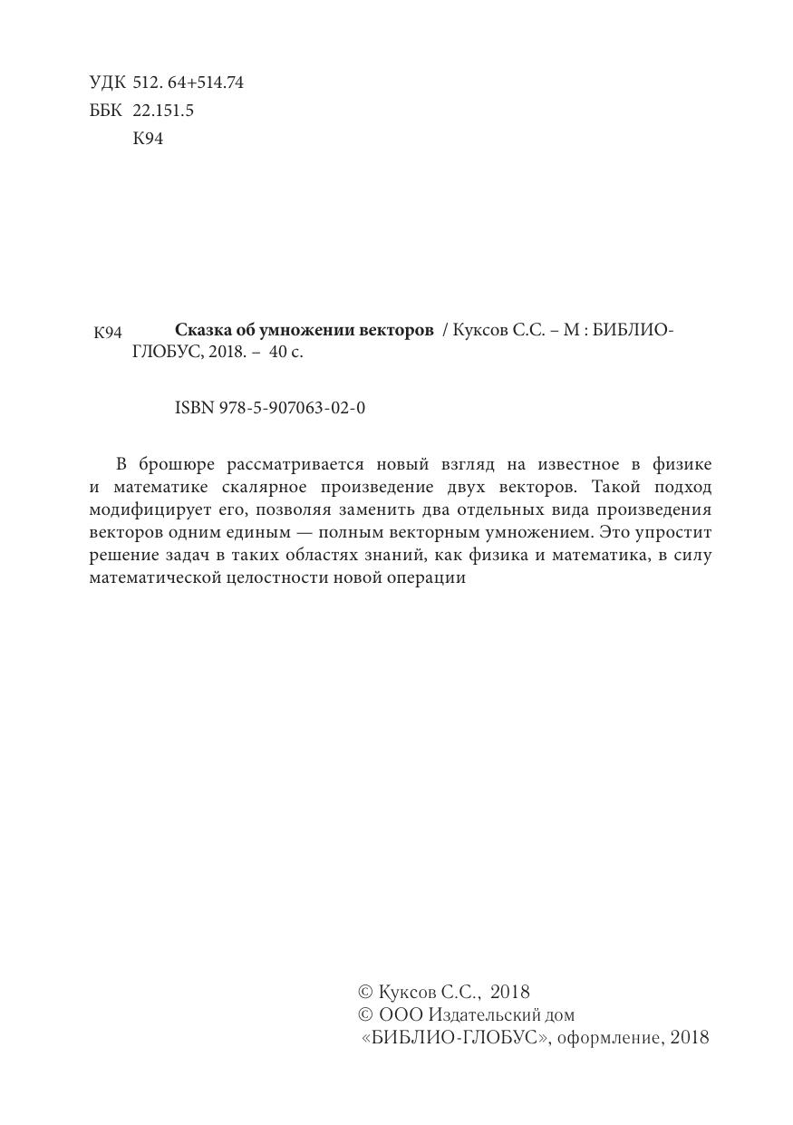 В брошюре рассматривается новый взгляд на известное в физике и математике скалярное произведение двух векторов. Такой подход модифицирует его, позволяя заменить два отдельных вида произведения векторов одним единым — полным векторным умножением. Это упростит решение задач в таких областях знаний, как физика и математика, в силу математической целостности новой операции.