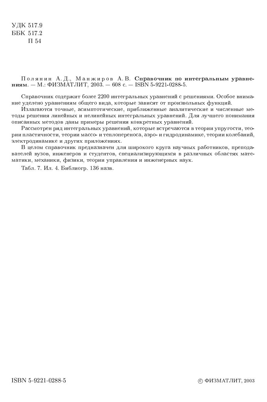 Справочник содержит более 2200 интегральных уравнений с решениями. Особое внимание уделено уравнениям общего вида, которые зависят от производных функций.Излагаются точные, асимпотические, приближенные аналитические и численные методы решения линейных и нелинейных унтегральных уравнений. Для лучшего понимания описанных методов даны примеры решения конкретных уравнений.рассмотрен ряд интегральных уравнений, которые встречаются в теории упругости, теории пластичности, теории массо- и теплопереноса, аэро- и гидродинамики, теории колебаний, электродинамике и других приложениях. В целом справочник предназначен для широкого круга научных работников, преподавателей вузов, инженеров и студентов, специализирующихся в различных областях математики, механики, физики, теории управления и инженерных наук.