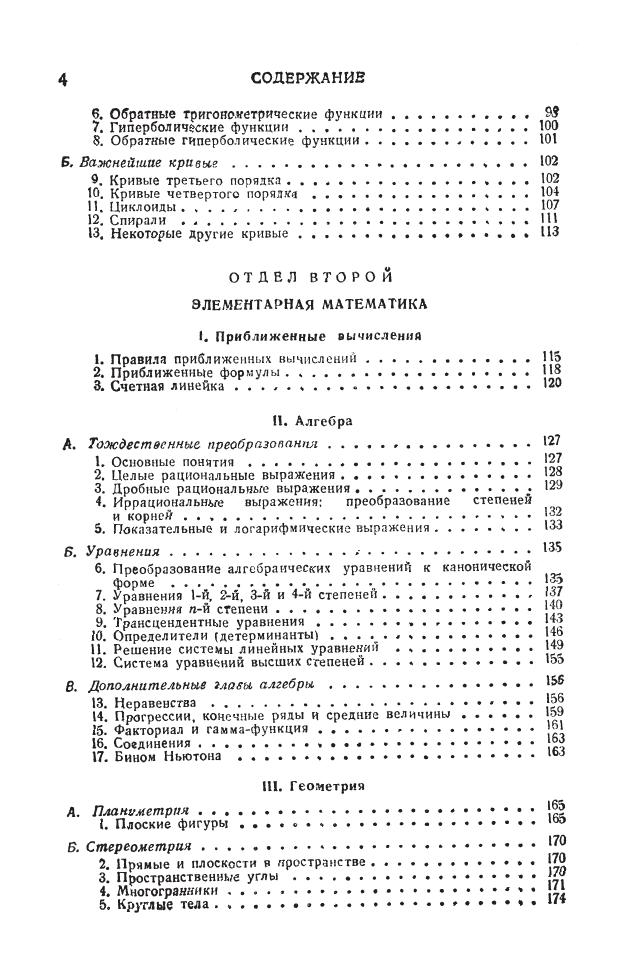 Справочник по математике И. Н. Бронштейна и К. А. Семендяева выдержал множество изданий. Благодаря краткости изложения, полноте и удачному построению материала он прочно завоевал популярность не только в России, но и за рубежом. Приведены сведения по алгебре, планиметрии, стереометрии, тригонометрии, аналитической и дифференциальной геометрии на плоскости и в пространстве, дифференциальному и интегральному исчислению, дифференциальным уравнениям, функциям комплексной переменной, рядам Фурье, векторной алгебре, теории поля, приближенным вычислениям, теории вероятностей. В книге также содержатся таблицы элементарных и специальных функций, графики алгебраических и трансцендентных функций и важнейших кривых. Справочник предназначен студентам технических вузов, инженерам и всем, кто серьезно изучает математику.