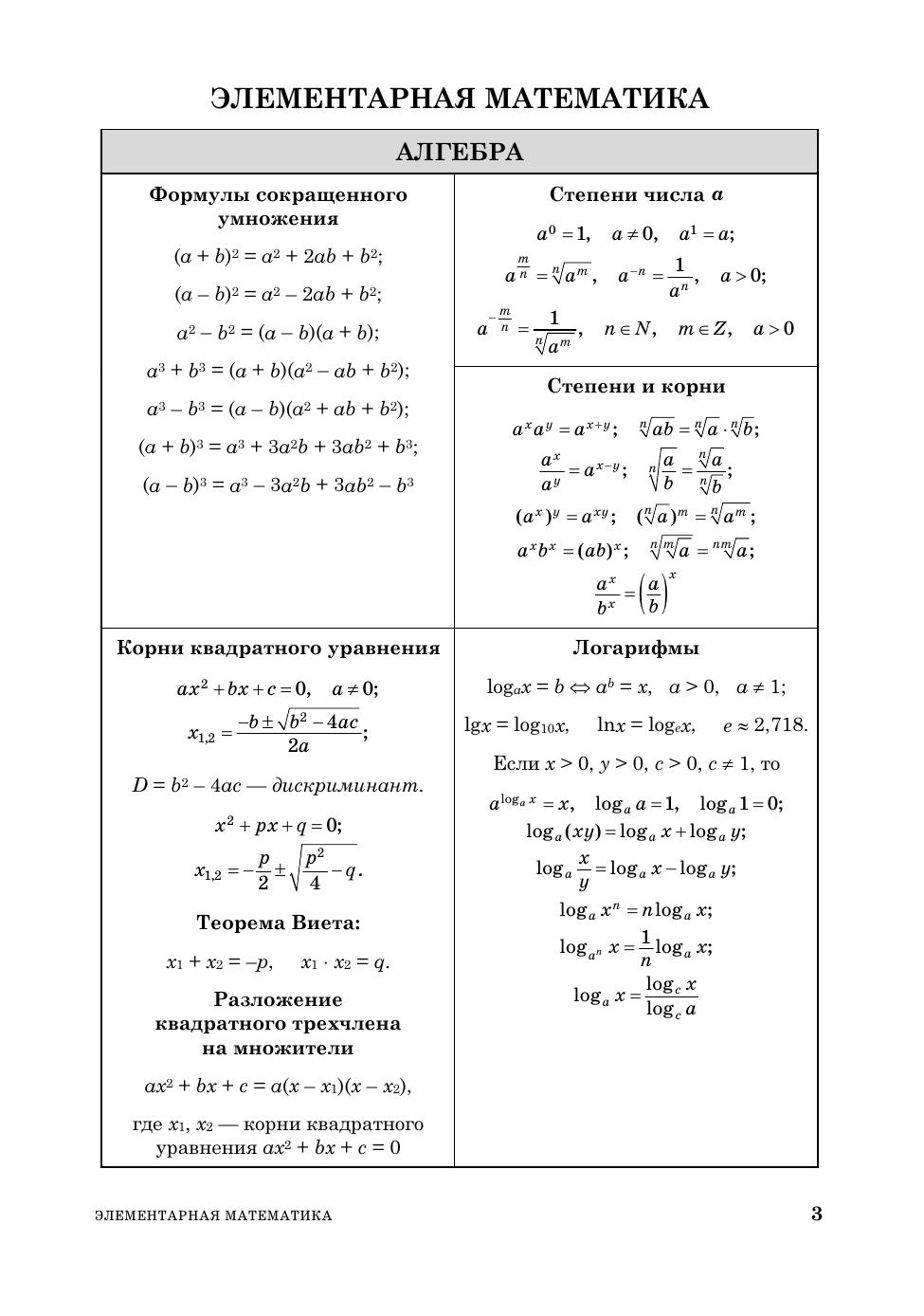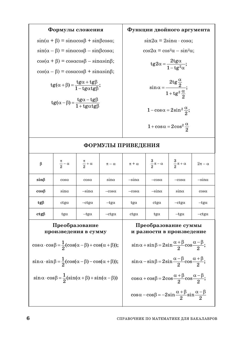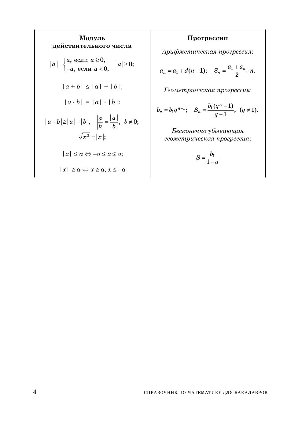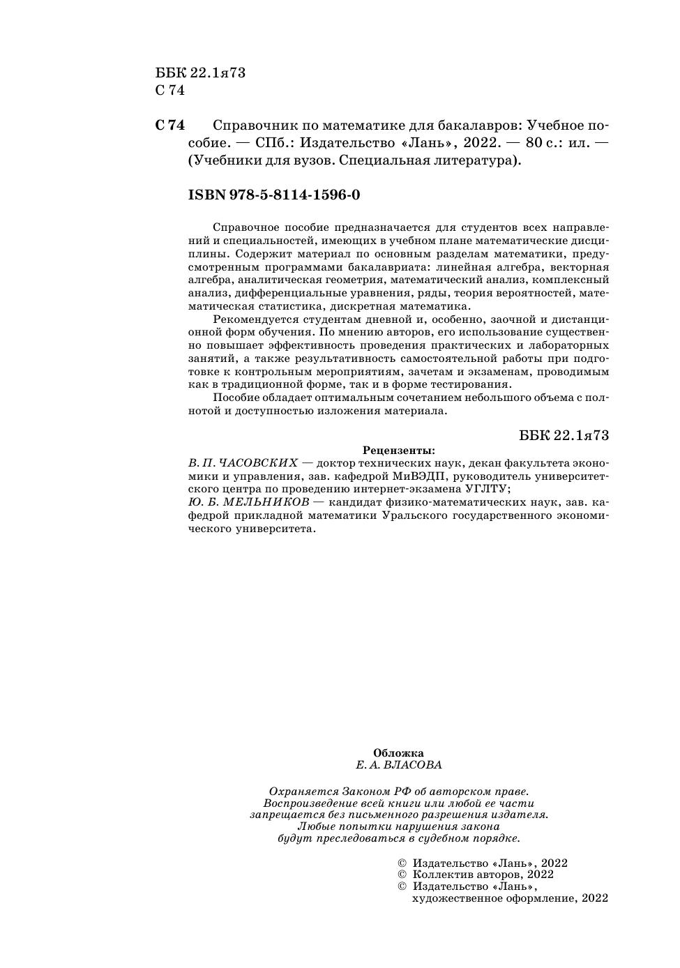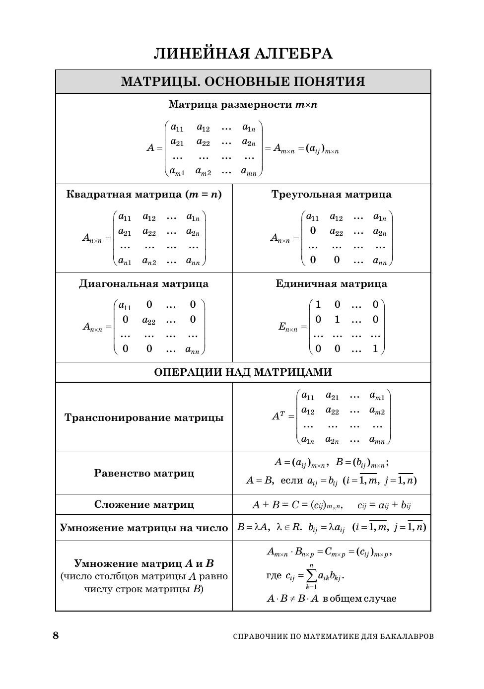 Справочное пособие предназначается для студентов всех направлений и специальностей, имеющих в учебном плане математические дисциплины. Содержит материал по основным разделам математики, предусмотренным программами бакалавриата: линейная алгебра, векторная алгебра, аналитическая геометрия, математический анализ, комплексный анализ, дифференциальные уравнения, ряды, теория вероятностей, математическая статистика, дискретная математика. Рекомендуется студентам дневной и, особенно, заочной и дистанционной форм обучения. По мнению авторов, его использование существенно повышает эффективность проведения практических и лабораторных занятий, а также результативность самостоятельной работы при подготовке к контрольным мероприятиям, зачетам и экзаменам, проводимым как в традиционной форме, так и в форме тестирования. Пособие обладает оптимальным сочетанием небольшого объема с полнотой и доступностью изложения материала.