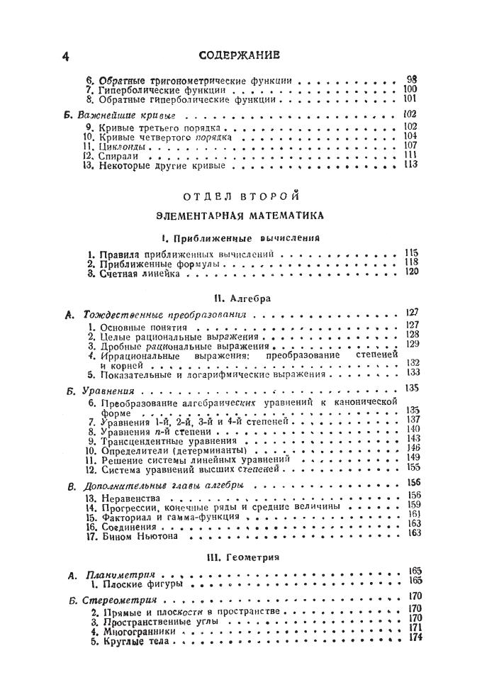 Справочник по математике И. Н. Бронштейна и К. А. Семендяева выдержал множество изданий. Благодаря краткости изложения, полноте и удачному построению материала он прочно завоевал популярность не только в России, но и за рубежом. Приведены сведения по алгебре, планиметрии, стереометрии, тригонометрии, аналитической и дифференциальной геометрии на плоскости и в пространстве, дифференциальному и интегральному исчислению, дифференциальным уравнениям, функциям комплексной переменной, рядам Фурье, векторной алгебре, теории поля, приближенным вычислениям, теории вероятностей. В книге также содержатся таблицы элементарных и специальных функций, графики алгебраических и трансцендентных функций и важнейших кривых. Справочник предназначен студентам технических вузов, инженерам и всем, кто серьезно изучает математику.