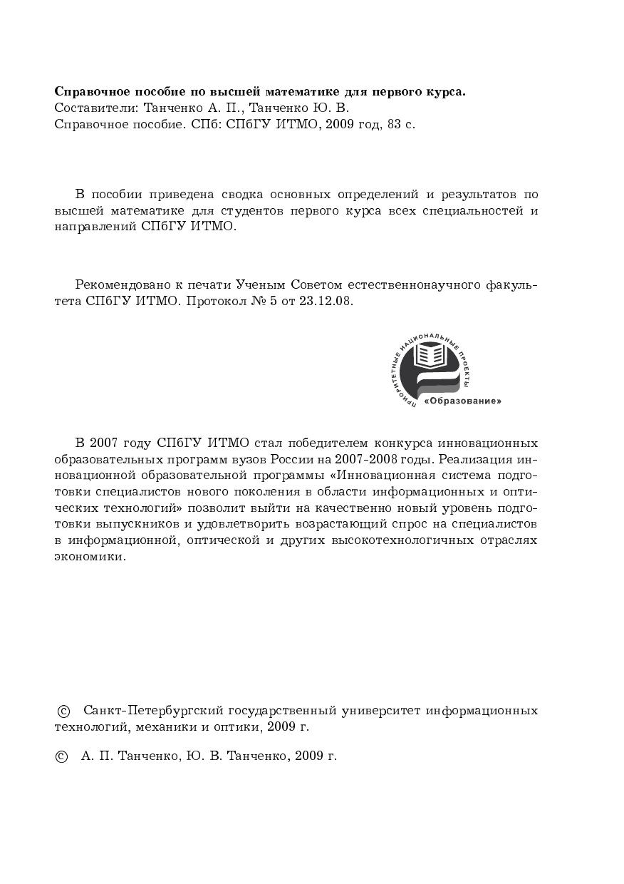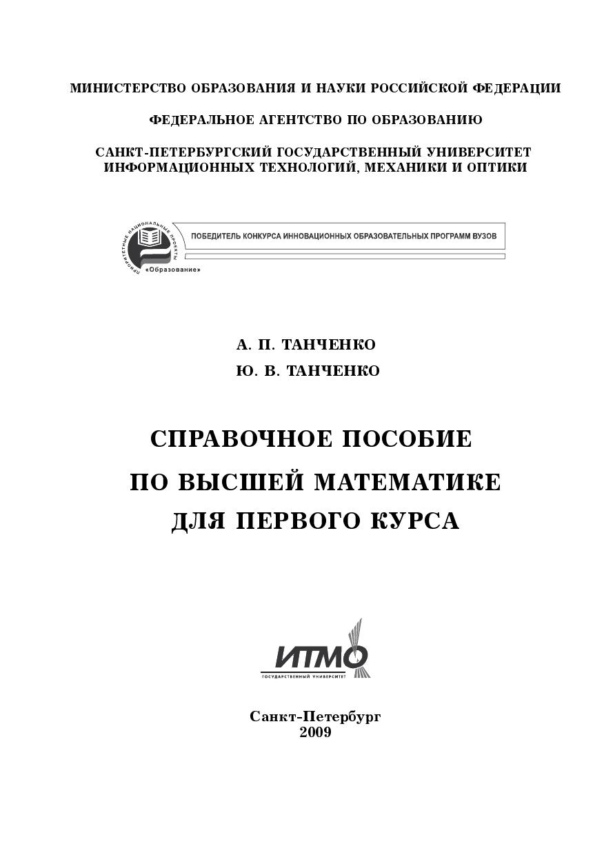 В пособии приведена сводка основных определений и результатов по высшей математике для студентов первого курса всех специальностей и направлений СПбГУ ИТМО.