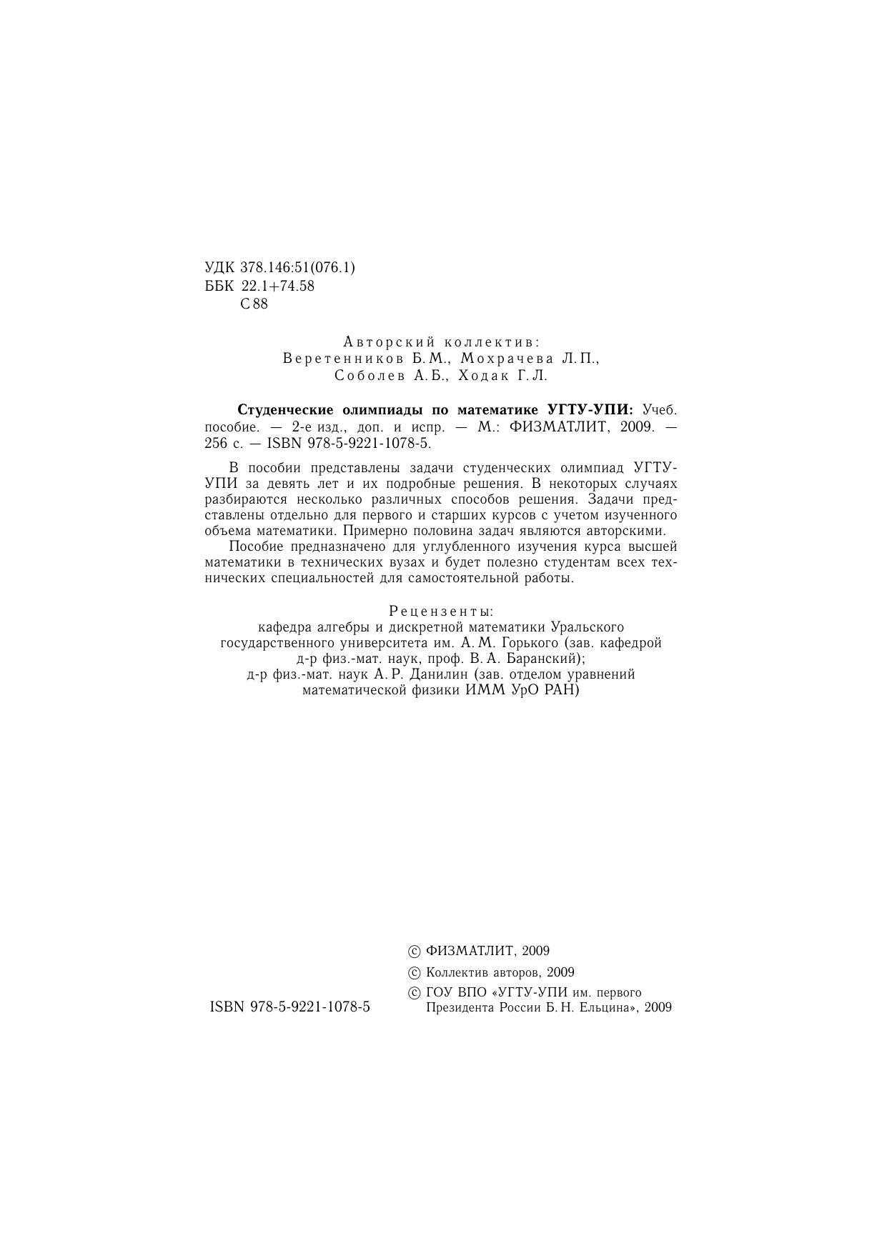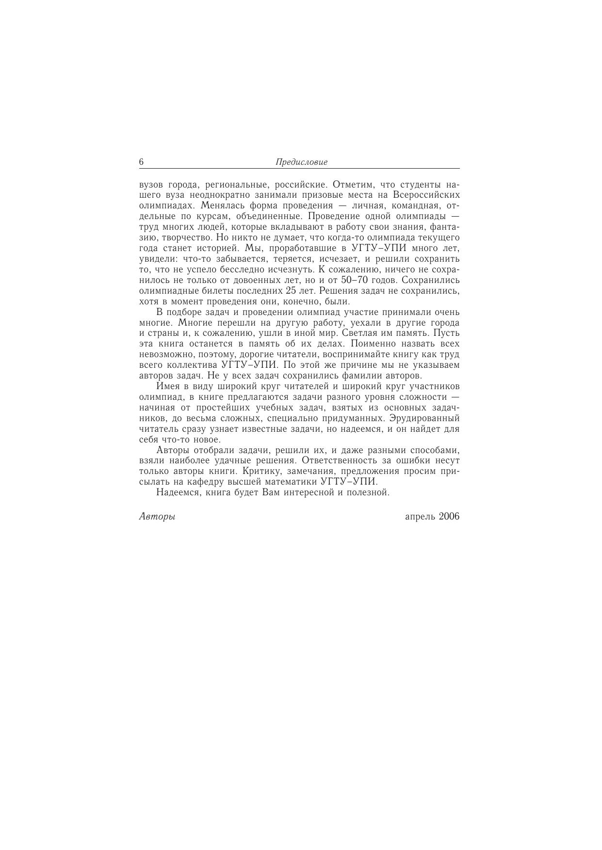 В пособии представлены задачи студенческих олимпиад УГТУ-УПИ за девять лет и их подробные решения. В некоторых случаях разбираются несколько различных способов решения. Задачи представлены отдельно для первого и старших курсов с учетом изученного объема математики. Примерно половина задач являются авторскими. Пособие предназначено для углубленного изучения курса высшей математики в технических вузах и будет полезно студентам всех технических специальностей для самостоятельной работы.