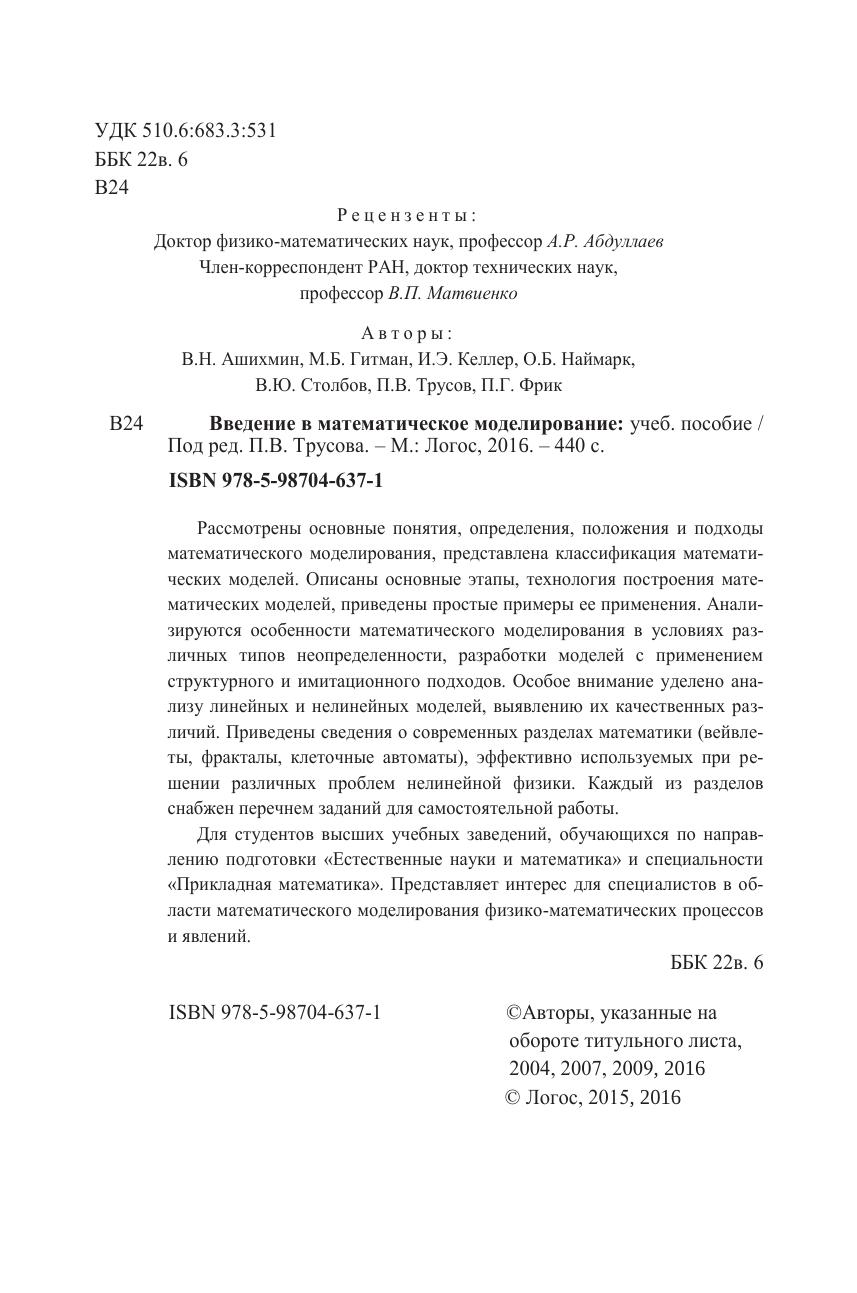 Рассмотрены основные понятия, определения, положения и подходы математического моделирования, представлена классификация математических моделей. Описаны основные этапы, технология построения математических моделей, приведены простые примеры ее применения. Анализируются особенности математического моделирования в условиях различных типов неопределенности, разработки моделей с применением структурного и имитационного подходов. Особое внимание уделено анализу линейных и нелинейных моделей, выявлению их качественных различий. Приведены сведения о современных разделах математики (вейвлеты, фракталы, клеточные автоматы), эффективно используемых при решении различных проблем нелинейной физики. Каждый из разделов снабжен перечнем заданий для самостоятельной работы. Для студентов высших учебных заведений, обучающихся по направлению подготовки "Естественные науки и математика" и специальности "Прикладная математика". Представляет интерес для специалистов в области математического моделирования физико-математических процессов и явлений.