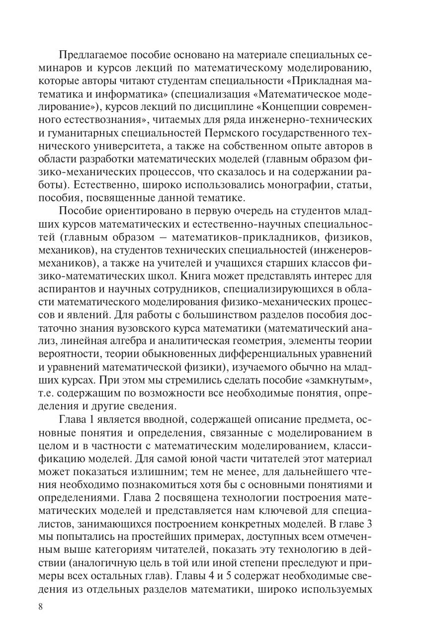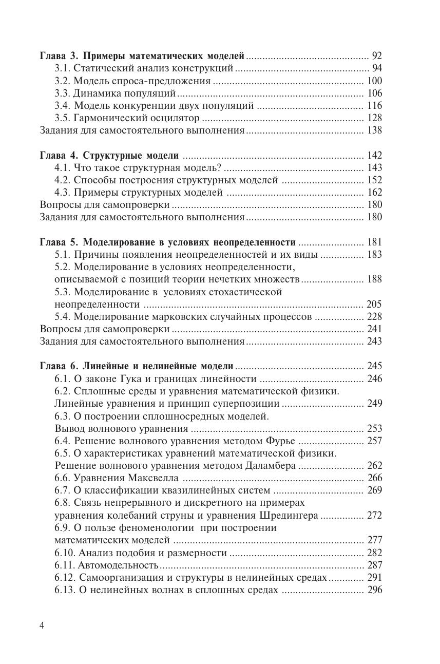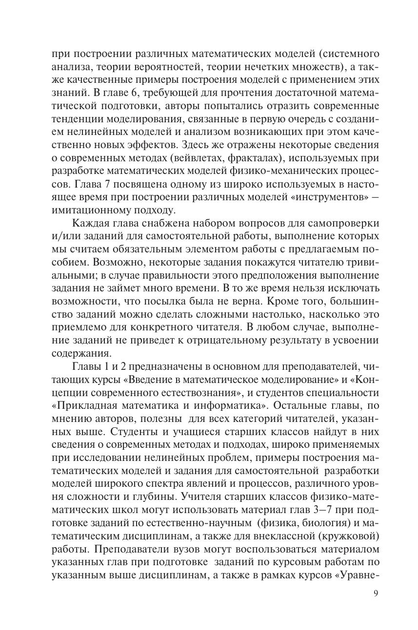 Рассмотрены основные понятия, определения, положения и подходы математического моделирования, представлена классификация математических моделей. Описаны основные этапы, технология построения математических моделей, приведены простые примеры ее применения. Анализируются особенности математического моделирования в условиях различных типов неопределенности, разработки моделей с применением структурного и имитационного подходов. Особое внимание уделено анализу линейных и нелинейных моделей, выявлению их качественных различий. Приведены сведения о современных разделах математики (вейвлеты, фракталы, клеточные автоматы), эффективно используемых при решении различных проблем нелинейной физики. Каждый из разделов снабжен перечнем заданий для самостоятельной работы. Для студентов высших учебных заведений обучающихся по направлению подготовки «Естественные науки и математика» и специальности «Прикладная математика». Представляет интерес для специалистов в области математического моделирования физико-математических процессов и явлений.
