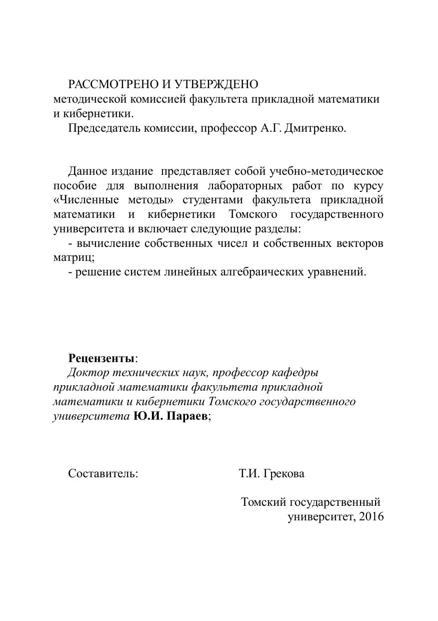 Данное издание представляет собой учебно-методическое пособие для выполнения лабораторных работ по курсу «Численные методы» студентами факультета прикладной математики и кибернетики Томского государственного университета и включает следующие разделы: - вычисление собственных чисел и собственных векторов матриц, - решение систем линейных алгебраических уравнений.