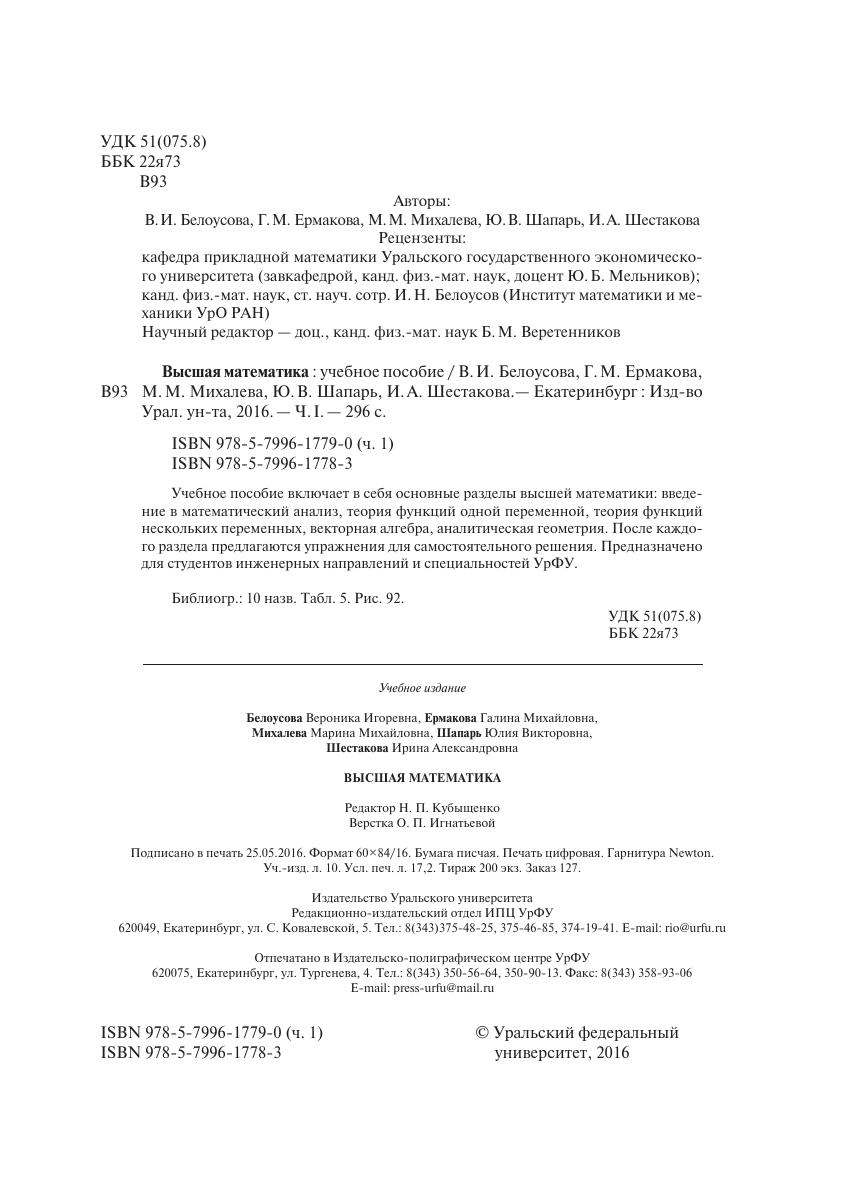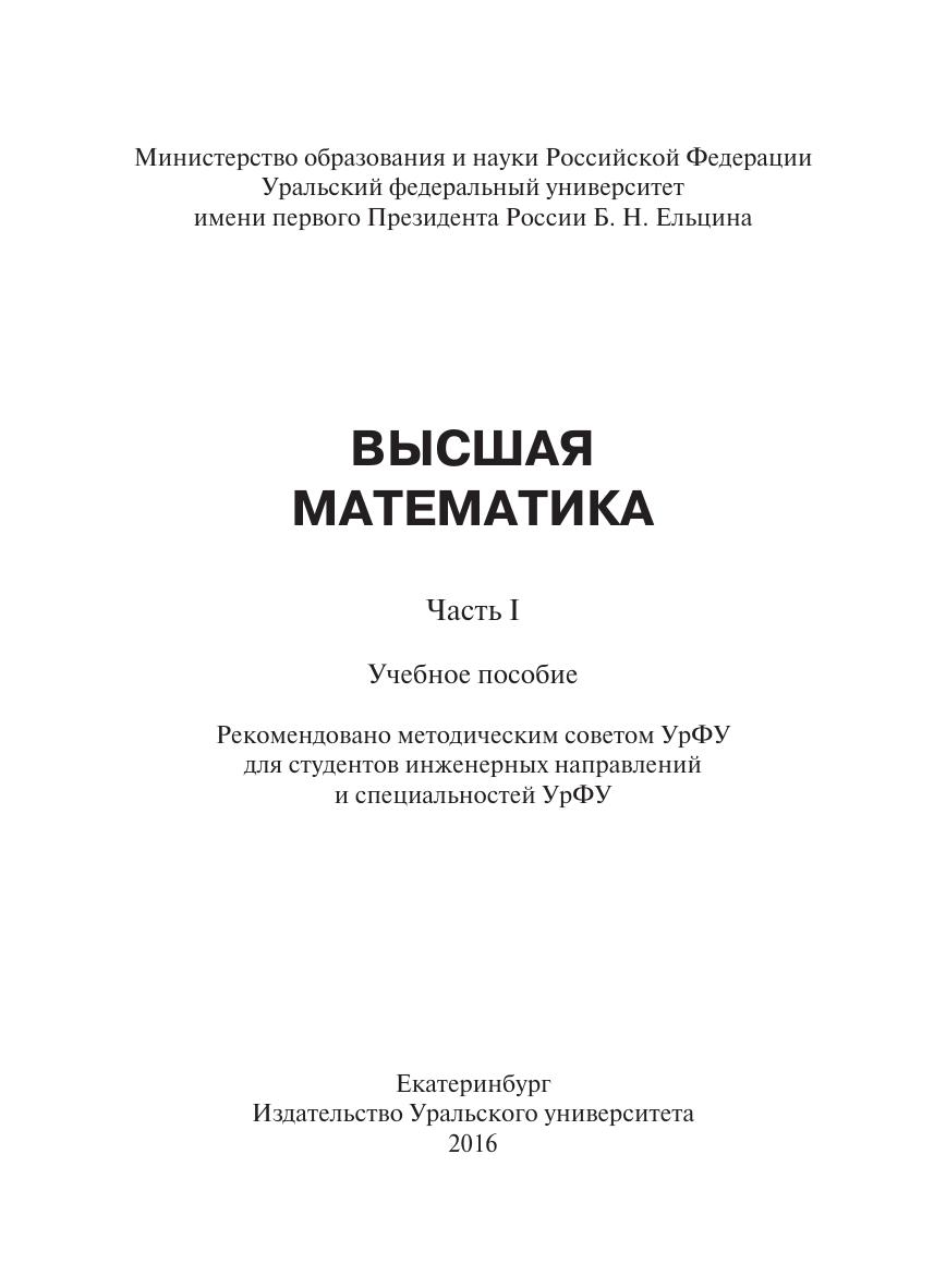Учебное пособие включает в себя основные разделы высшей математики: введение в математический анализ, теория функций одной переменной, теория функций нескольких переменных, векторная алгебра, аналитическая геометрия. После каждого раздела предлагаются упражнения для самостоятельного решения. Предназначено для студентов инженерных направлений и специальностей УрФУ.