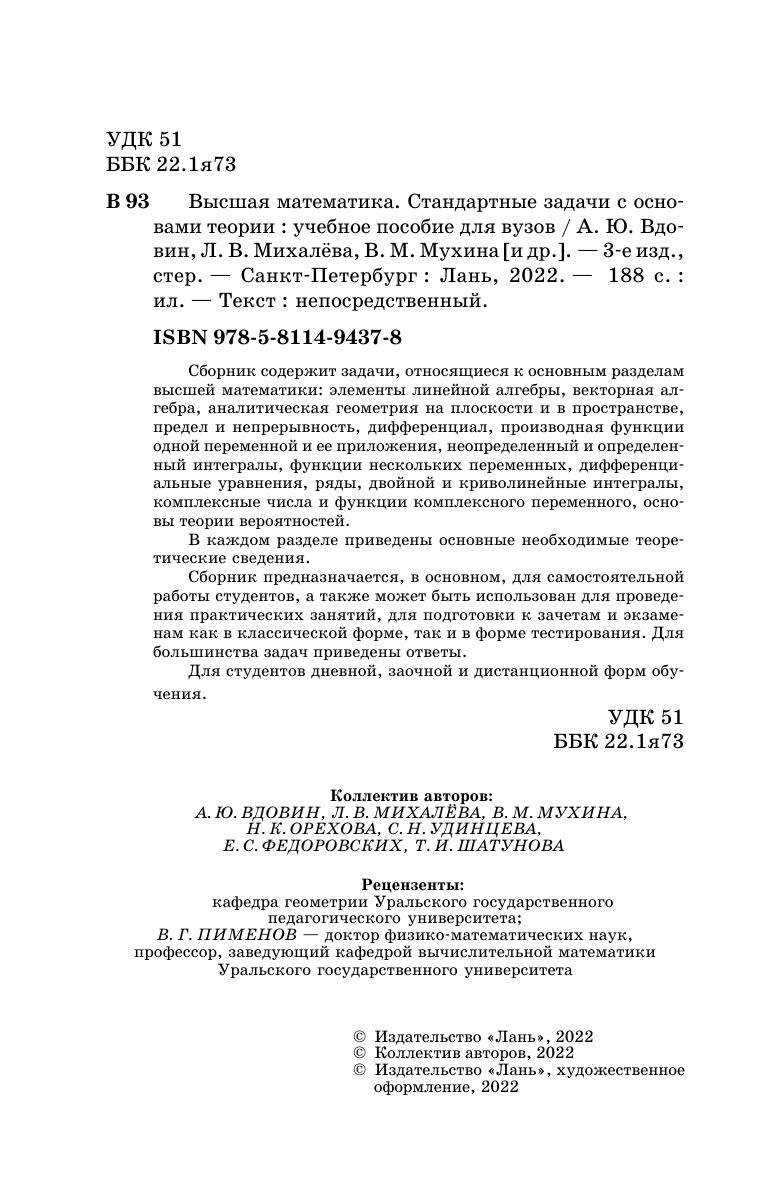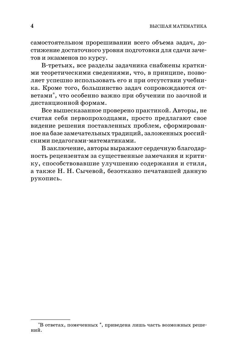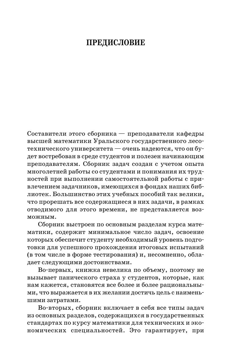 Сборник содержит задачи, относящиеся к основным разделам высшей математики: элементы линейной алгебры, векторная алгебра, аналитическая геометрия на плоскости и в пространстве, предел и непрерывность, дифференциал, производная функции одной переменной и ее приложения, неопределенный и определенный интегралы, функции нескольких переменных, дифференциальные уравнения, ряды, двойной и криволинейные интегралы, комплексные числа и функции комплексного переменного, основы теории вероятностей.