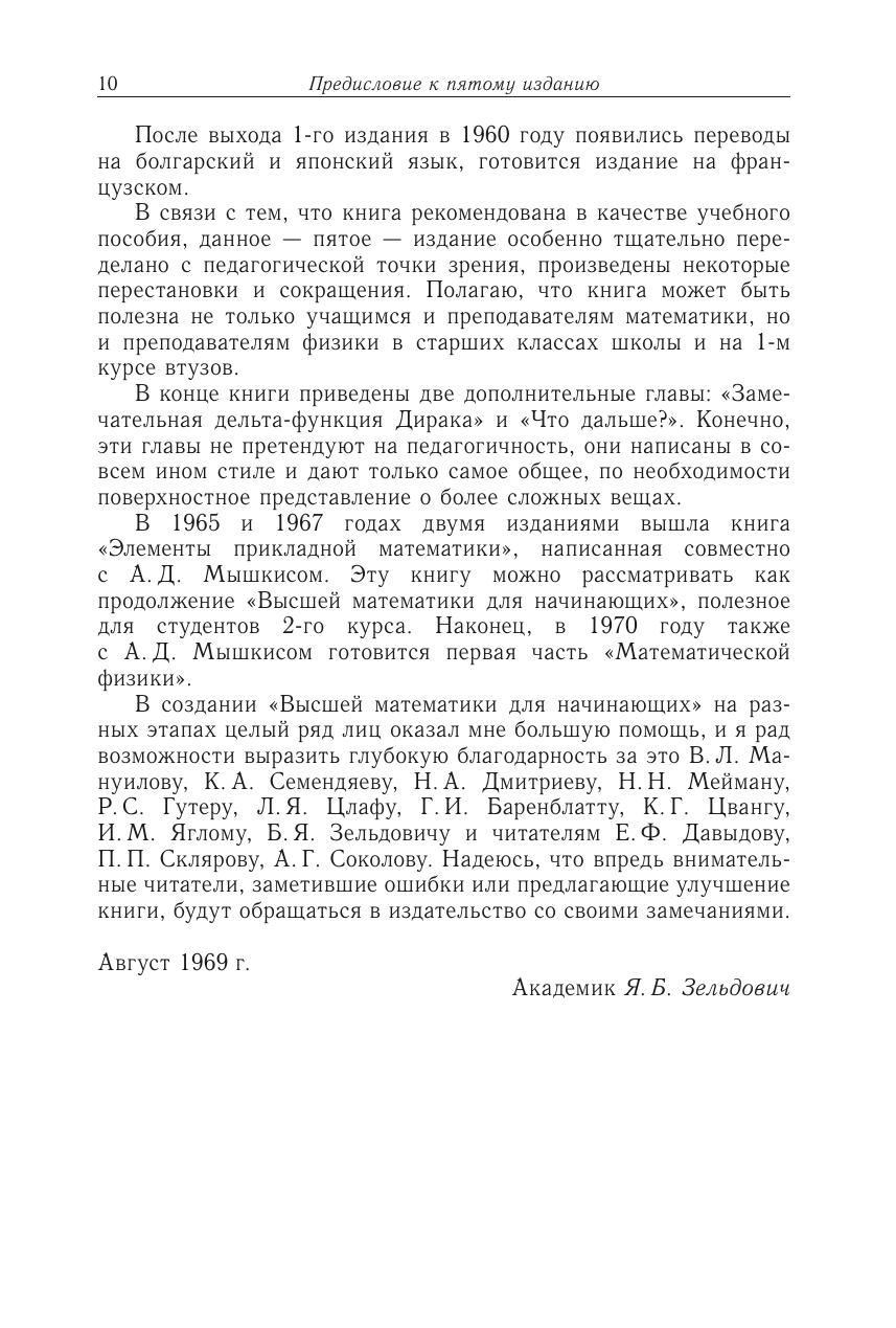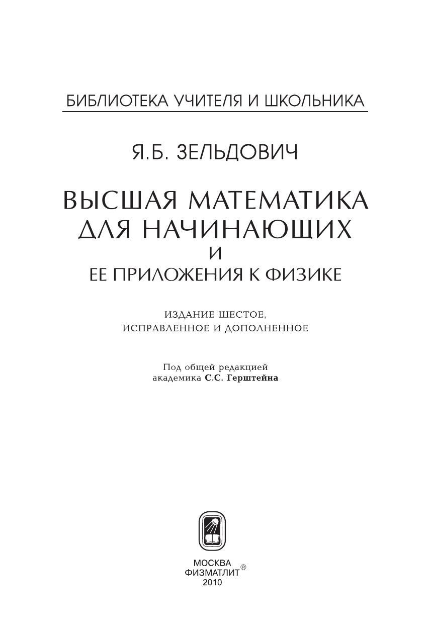 Книга «Высшая математика для начинающих и ее приложения к физике», написанная физиком-теоретиком академиком Я. Б. Зельдовичем, рассчитана на школьников старших классов, учащихся техникумов и лиц, занимающихся самообразованием, она может быть полезна и студентам 1-го курса вузов. В книге в наиболее простой, наглядной и доступной форме объясняются основные понятия дифференциального и интегрального исчисления. Далее даются сведения, необходимые для практического применения высшей математики к задачам физики и техники. На основе высшей математики рассмотрено большое число физических вопросов, в частности: радиоактивный распад, ядерная цепная реакция, законы механики, реактивное движение и космическая скорость, молекулярное движение, электрические явления, теория колебаний, основы радиотехники. Наряду с математическим исследованием очень подробно изложена физическая сущность рассматриваемых явлений. Была допущена Министерством просвещения СССР в качестве учебного пособия для физико-математических средних школ и проведения факультативных занятий.
