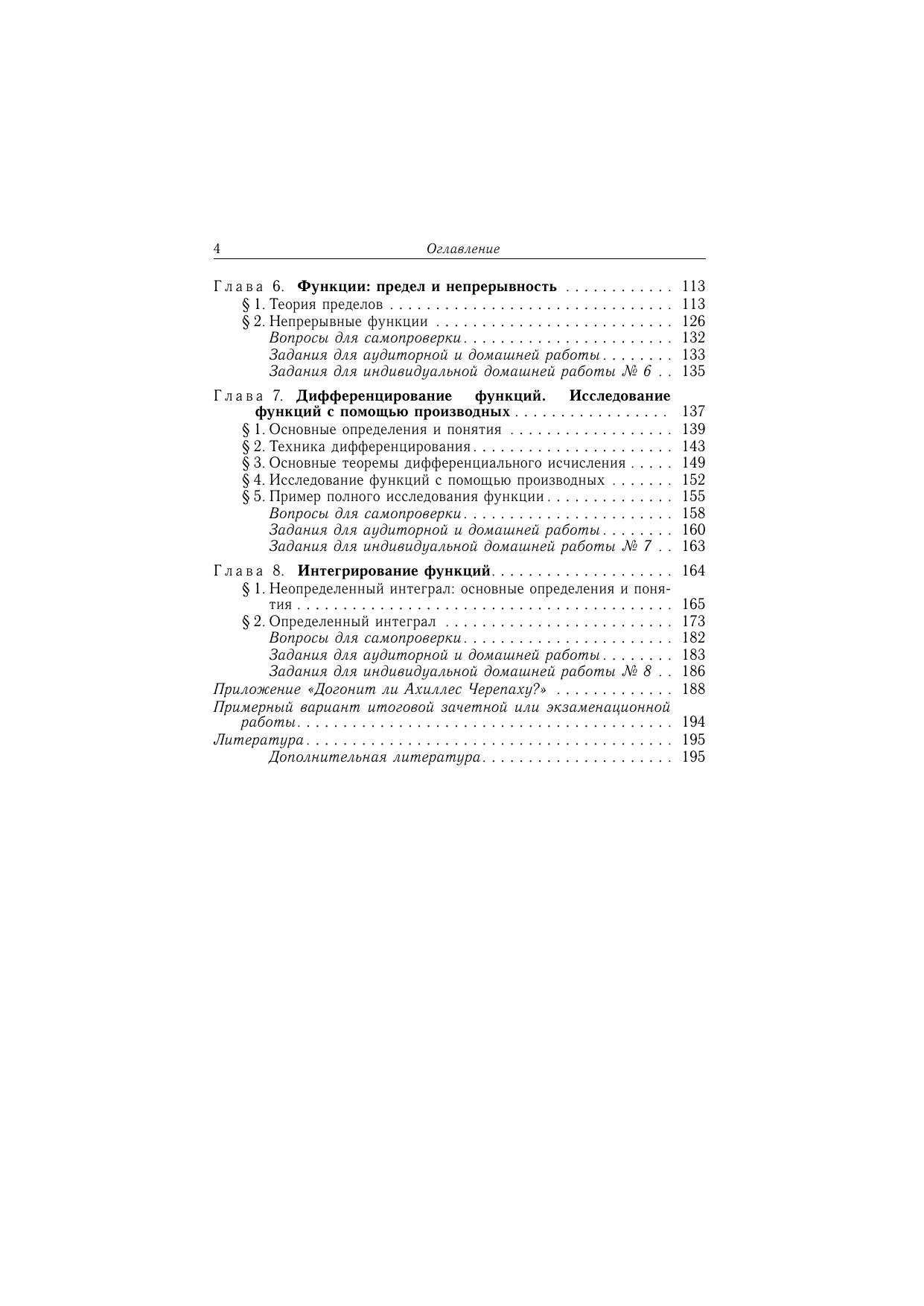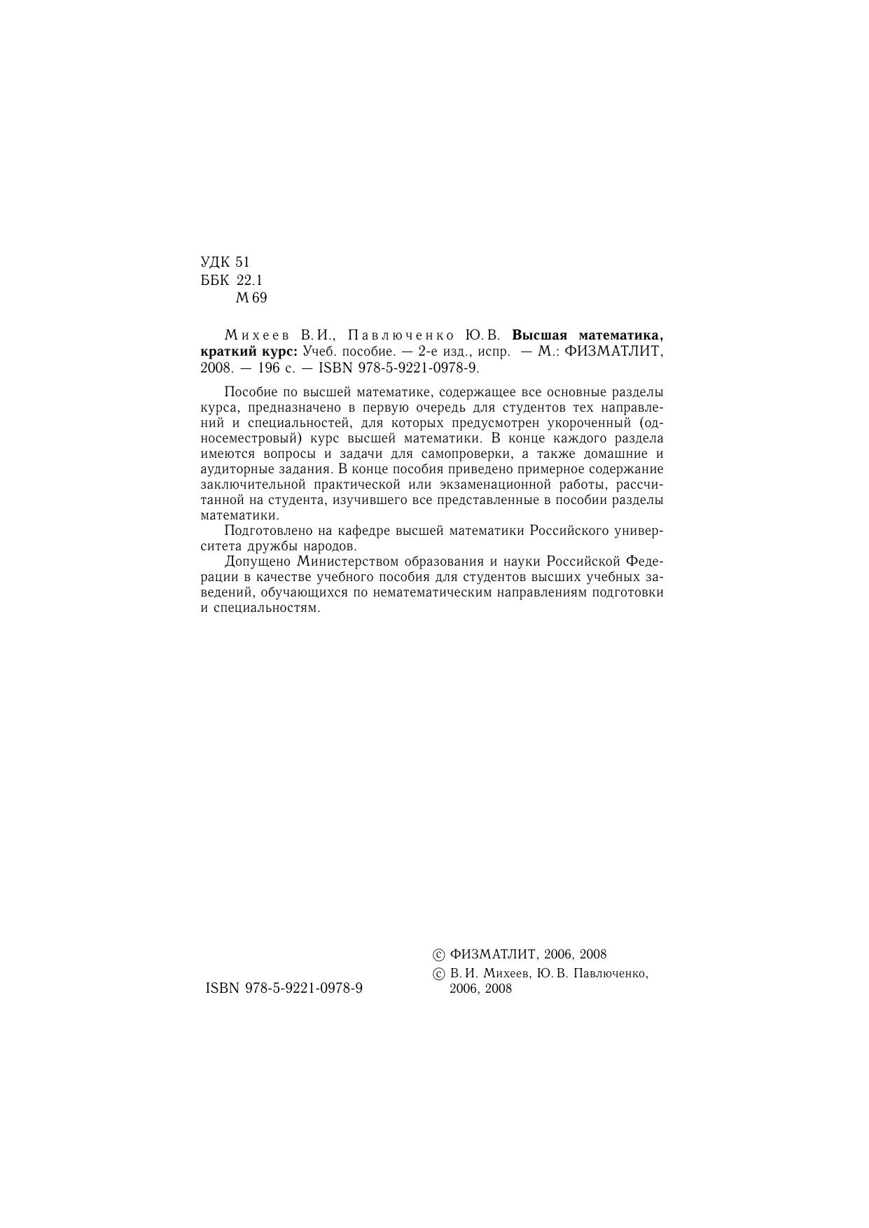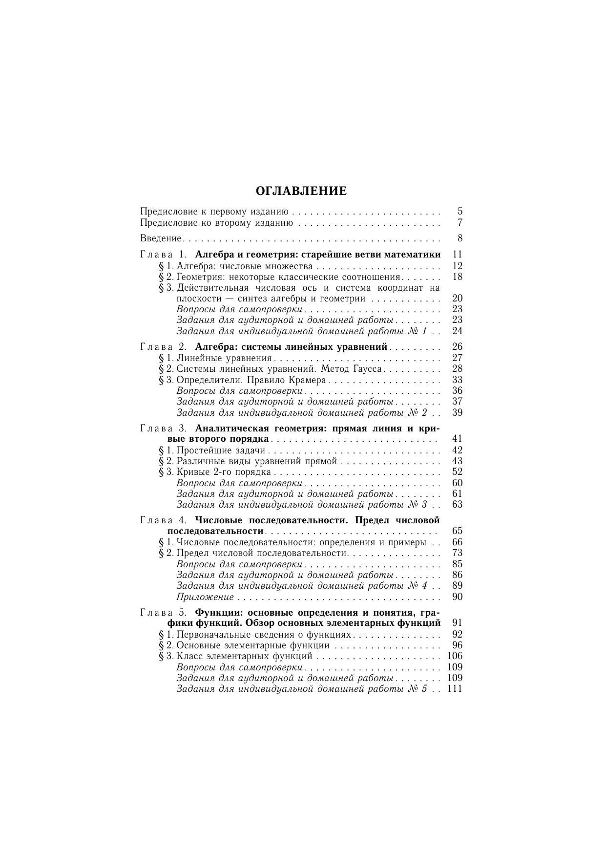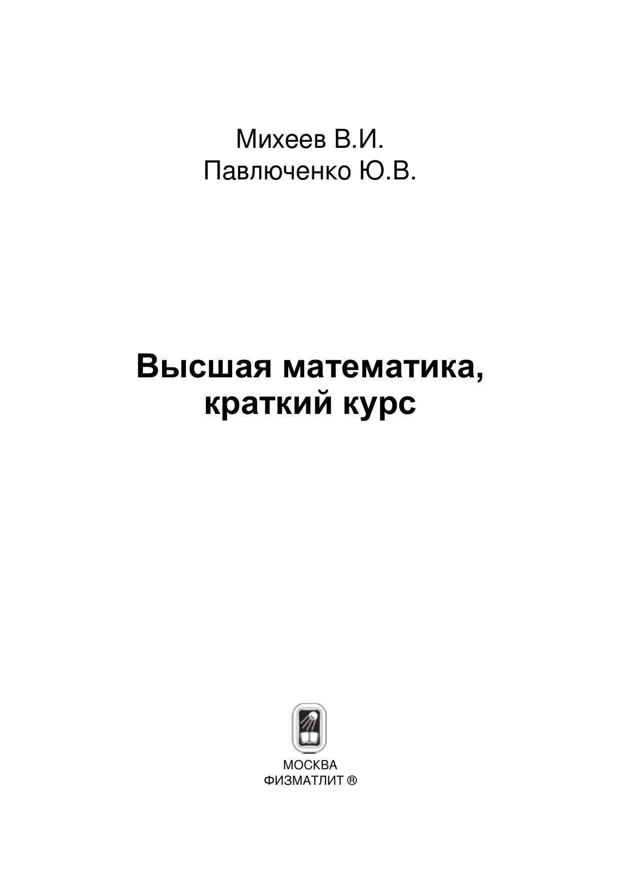 Пособие по высшей математике, содержащее все основные разделы курса, предназначено в первую очередь для студентов тех направлений и специальностей, для которых предусмотрен укороченный (односеместровый) курс высшей математики. В конце каждого раздела имеются вопросы и задачи для самопроверки, а также домашние и аудиторные задания. В конце пособия приведено примерное содержание заключительной практической или экзаменационной работы, рассчитанной на студента, изучившего все представленные в пособии разделы математики. Подготовлено на кафедре высшей математики Российского университета дружбы народов. Допущено Министерством образования и науки Российской Федерации в качестве учебного пособия для студентов высших учебных заведений, обучающихся по нематематическим направлениям подготовки и специальностям.