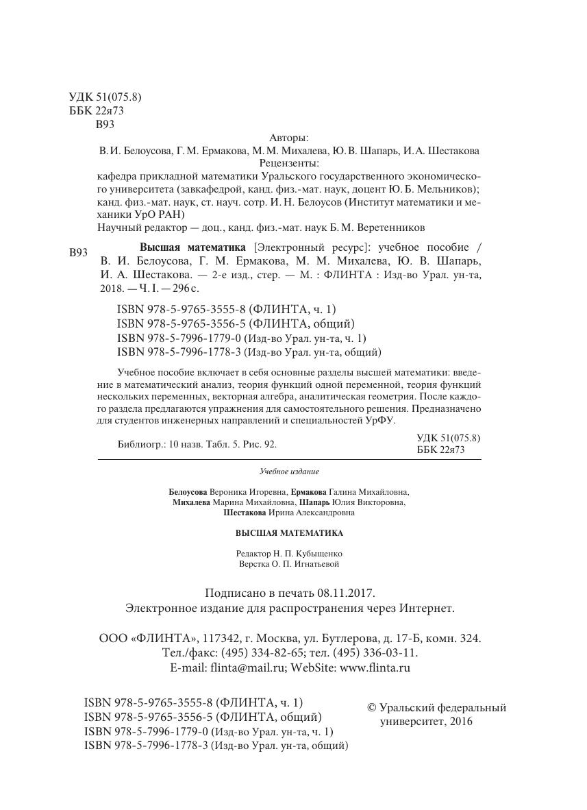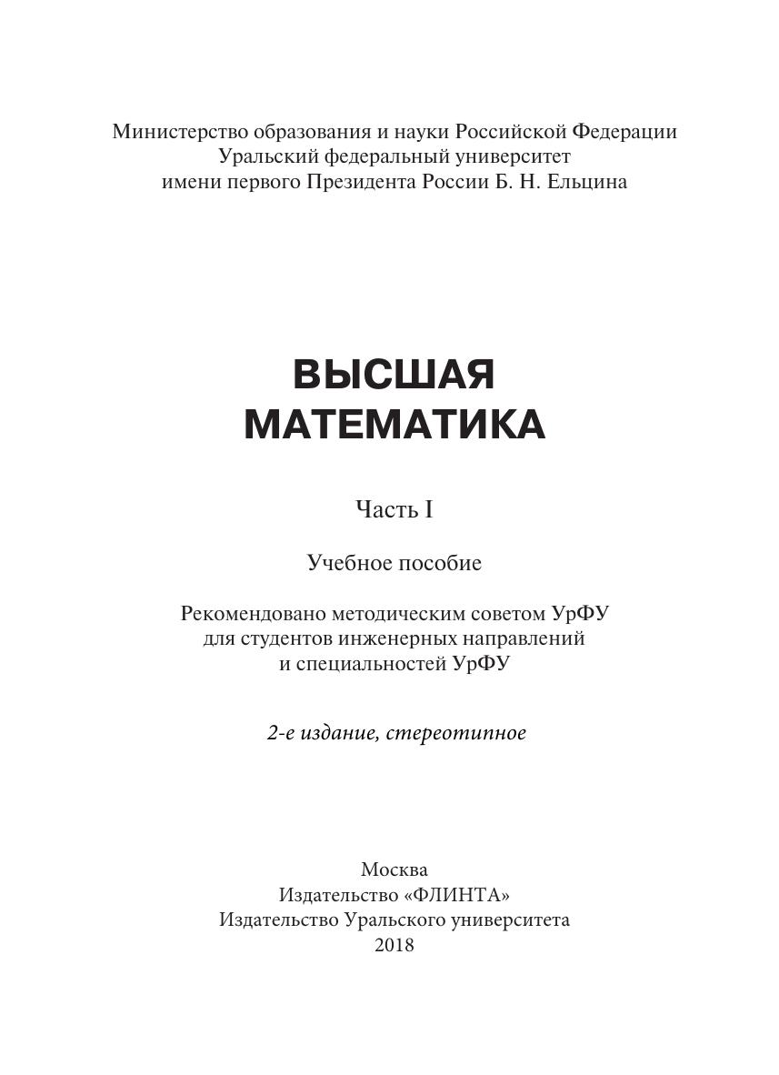Учебное пособие включает в себя основные разделы высшей математики: введение в математический анализ, теория функций одной переменной, теория функций нескольких переменных, векторная алгебра, аналитическая геометрия. После каждого раздела предлагаются упражнения для самостоятельного решения. Предназначено для студентов инженерных направлений и специальностей УрФУ.