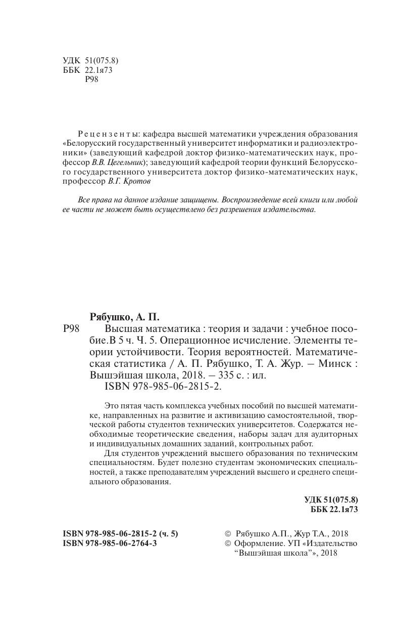 Высшая математика : теория и задачи. Часть 5. Операционное исчисление. Элементы теории устойчивости. Теория вероятностей. Математическая статистика