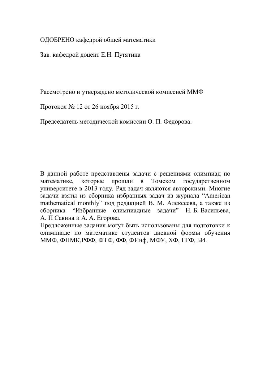 В данной работе представлены задачи с решениями олимпиад по математике, которые прошли в Томском государственном университете в 2013 году. Ряд задач являются авторскими. Многие задачи взяты из сборника избранных задач из журнала “American mathematical monthly” под редакцией В. М. Алексеева, а также из сборника “Избранные олимпиадные задачи” Н. Б. Васильева, А. П Савина и А. А. Егорова. Предложенные задания могут быть использованы для подготовки к олимпиаде по математике студентов дневной формы обучения ММФ, ФПМК,РФФ, ФТФ, ФФ, ФИнф, МФУ, ХФ, ГГФ, БИ.