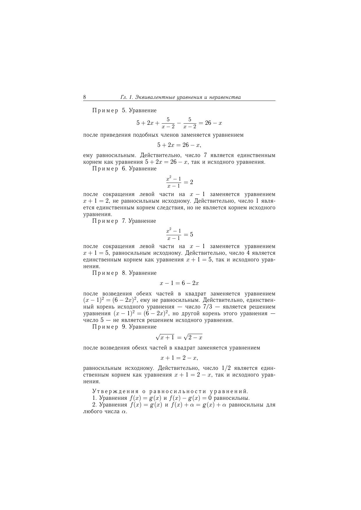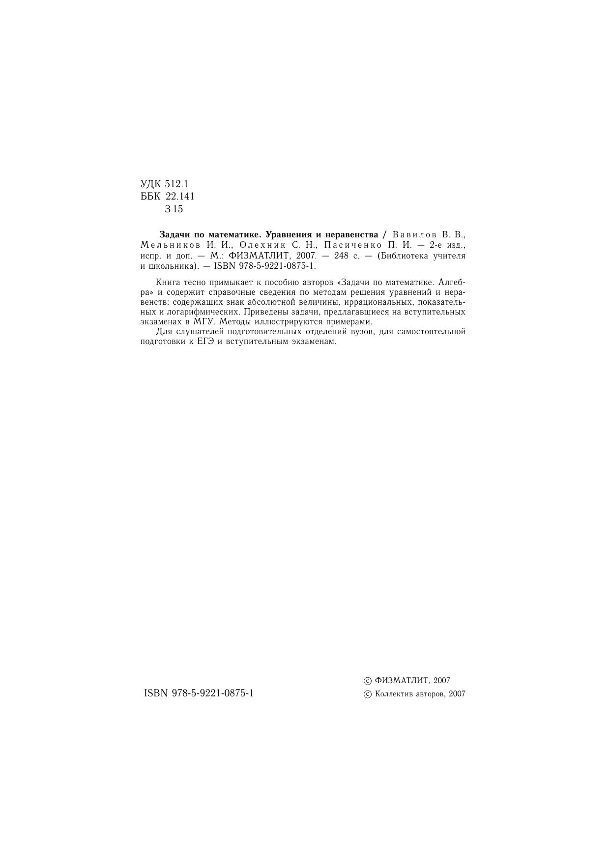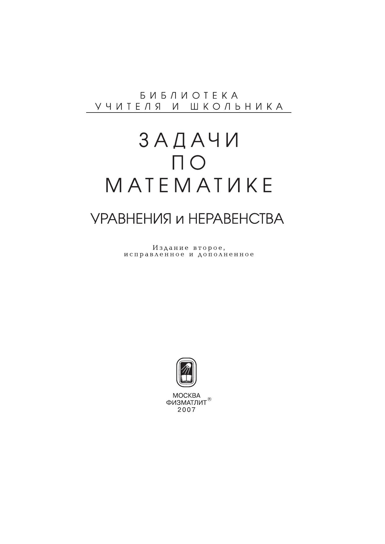 Книга тесно примыкает к пособию авторов «Задачи по математике. Алгебра» и содержит справочные сведения по методам решения уравнений и неравенств: содержащих знак абсолютной величины, иррациональных, показательных и логарифмических. Приведены задачи, предлагавшиеся на вступительных экзаменах в МГУ. Методы иллюстрируются примерами. Для слушателей подготовительных отделений вузов, для самостоятельной подготовки к ЕГЭ и вступительным экзаменам.