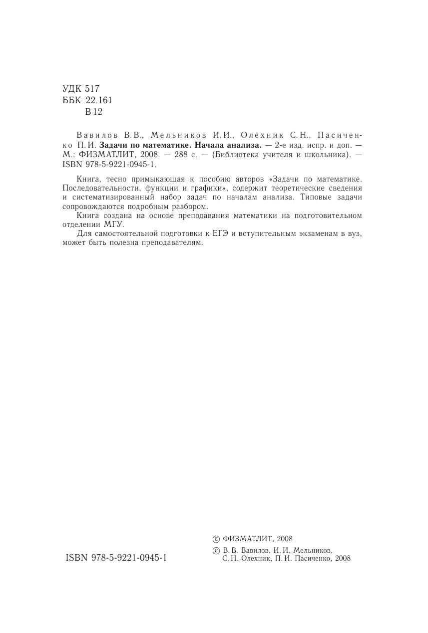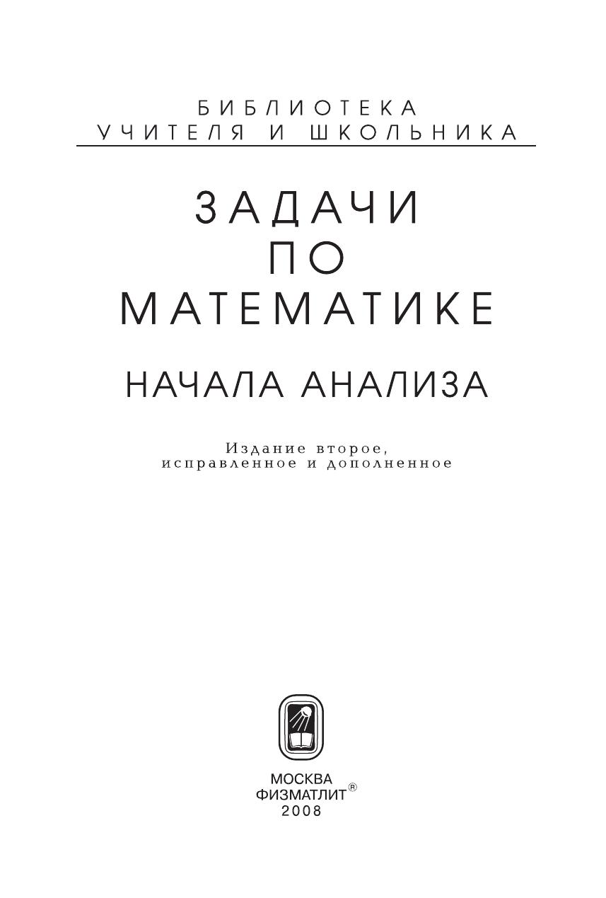 Книга, тесно примыкающая к пособию авторов «Задачи по математике. Последовательности, функции и графики», содержит теоретические сведения и систематизированный набор задач по началам анализа. Типовые задачи сопровождаются подробным разбором. Книга создана на основе преподавания математики на подготовительном отделении МГУ. Для самостоятельной подготовки к ЕГЭ и вступительным экзаменам в вуз, может быть полезна преподавателям.