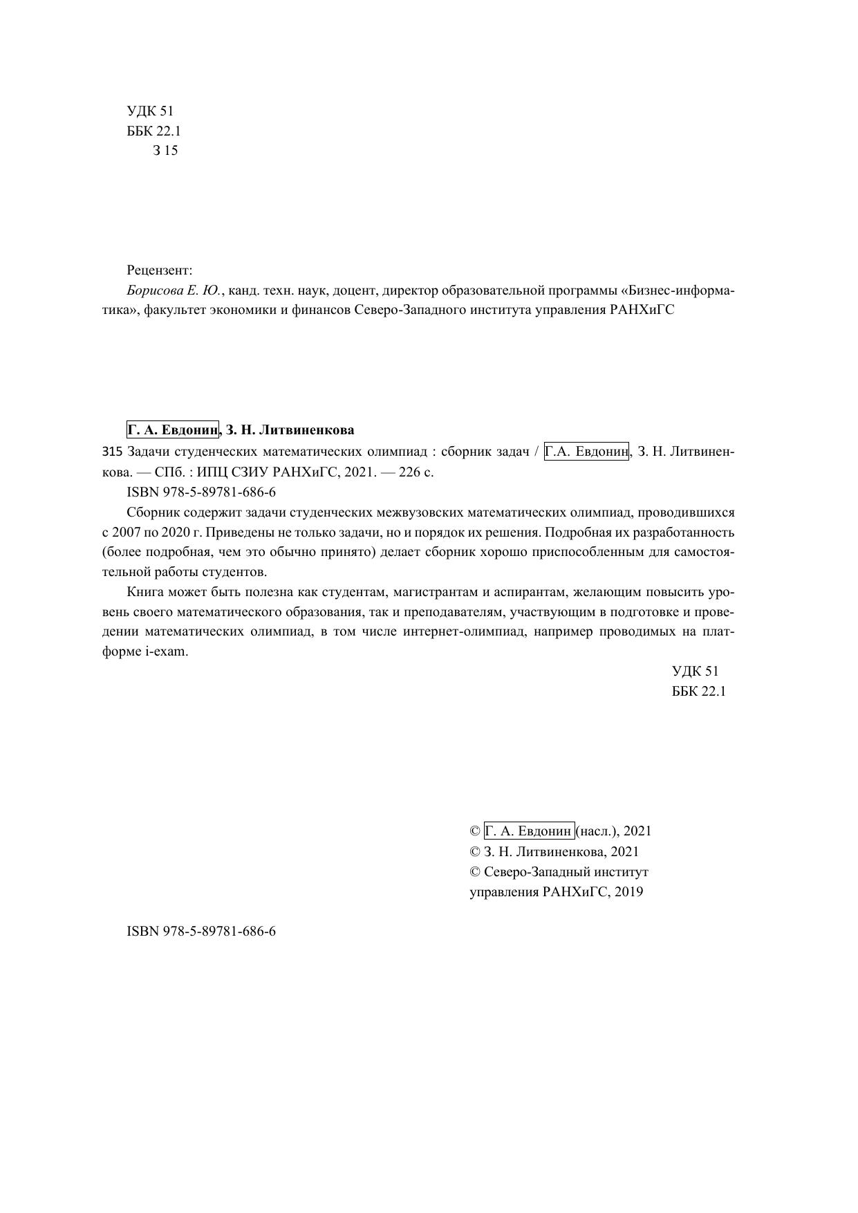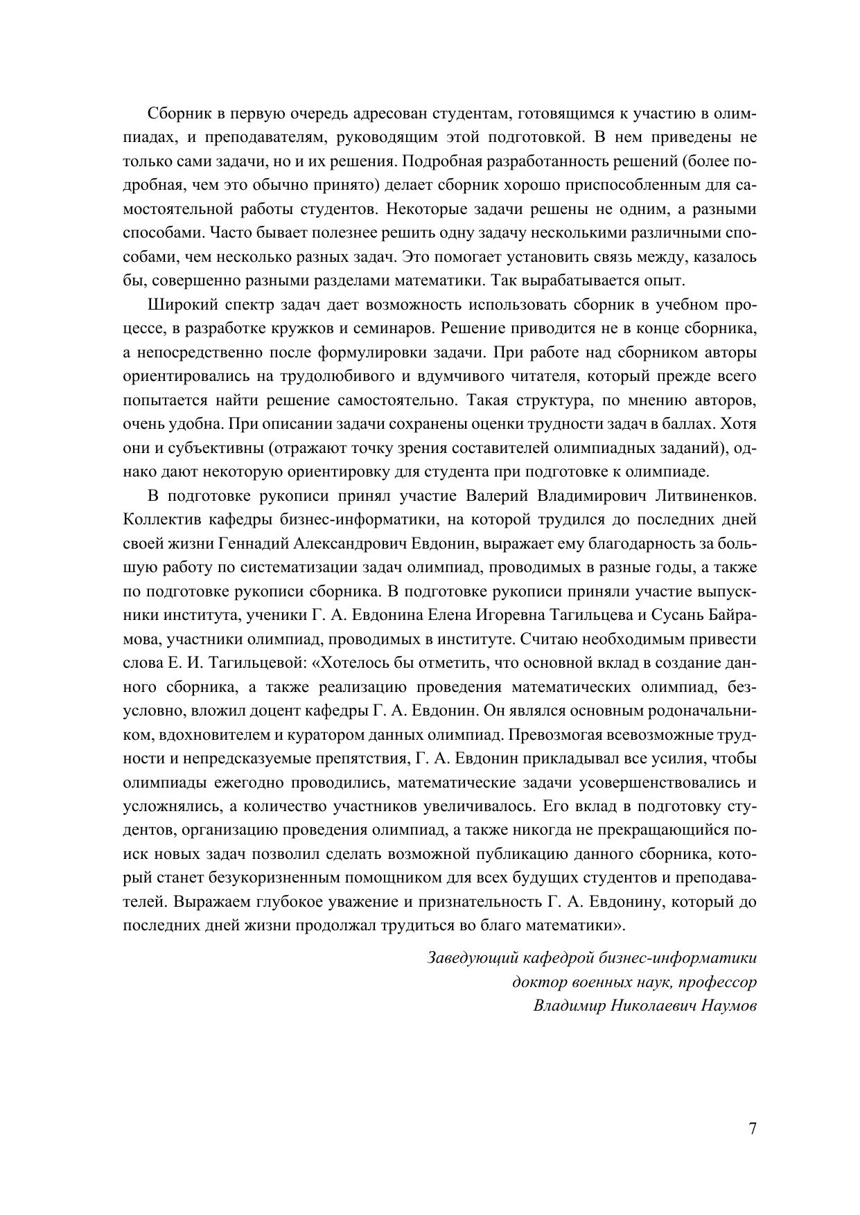 Сборник содержит задачи студенческих межвузовских математических олимпиад, проводившихся с 2007 по 2020 г. Приведены не только задачи, но и порядок их решения. Подробная их разработанность (более подробная, чем это обычно принято) делает сборник хорошо приспособленным для самостоя-тельной работы студентов. Книга может быть полезна как студентам, магистрантам и аспирантам, желающим повысить уро-вень своего математического образования, так и преподавателям, участвующим в подготовке и прове-дении математических олимпиад, в том числе интернет-олимпиад, например проводимых на плат-форме i-exam.