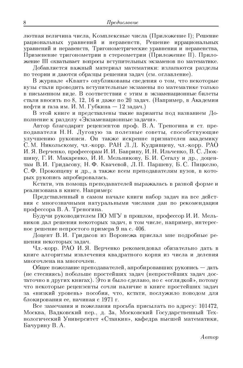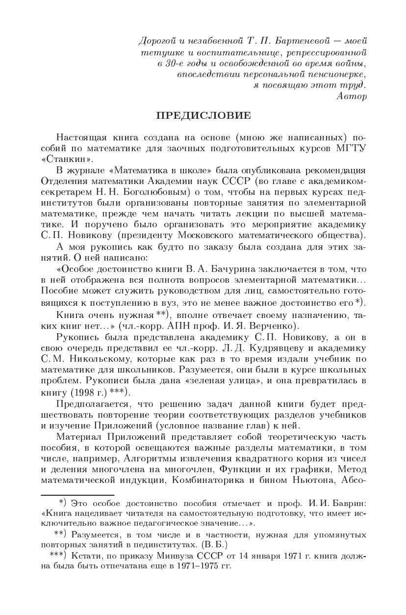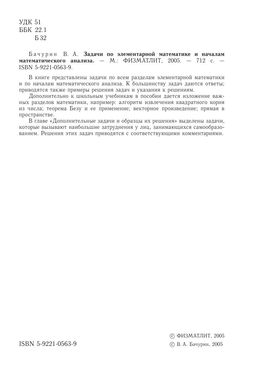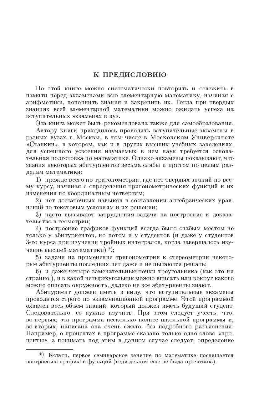В книге представлены задачи по всем разделам элементарной математики и по началам математического анализа. К большинству задач даются ответы приводятся также примеры решения задач и указания к решениям.Дополнительно к школьным учебникам в пособии дается изложение важных разделов математики, например: алгоритм извлечения квадратного корня из числа теорема Безу и ее применение векторное произведение прямая в пространстве.В главе «Дополнительные задачи и образцы их решения» выделены задачи, которые вызывают наибольшие затруднения у лиц, занимающихся самообразованием. Решения этих задач приводятся с соответствующими комментариями.