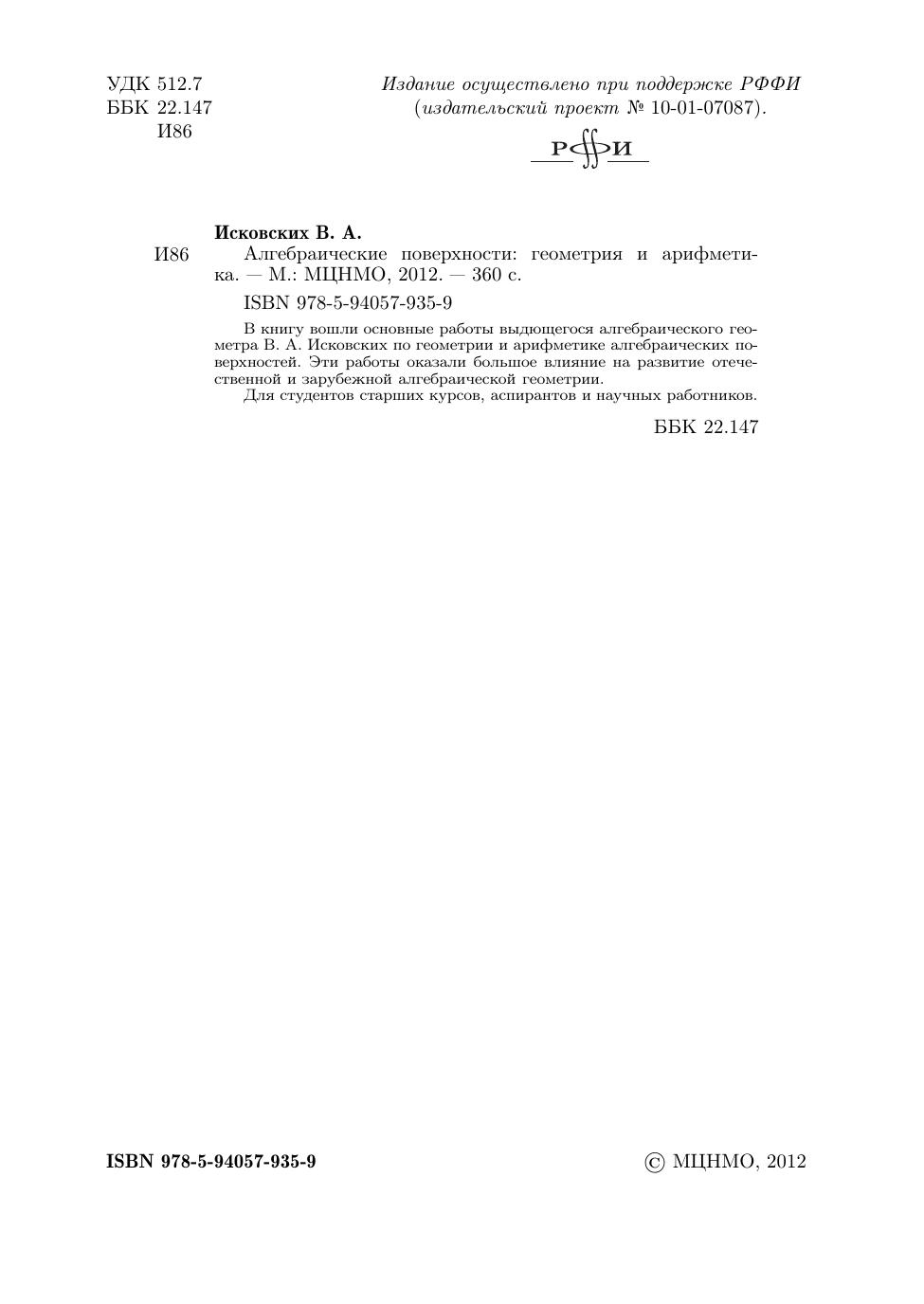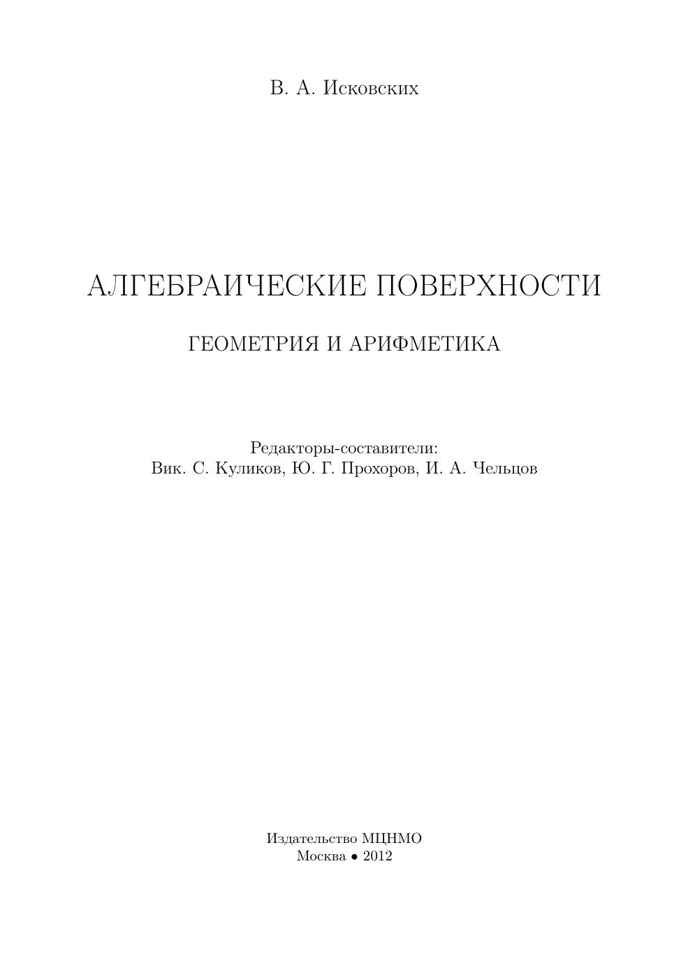В книгу вошли основные работы выдающегося алгебраического геометра В. А. Исковских по геометрии и арифметике алгебраических поверхностей. Эти работы оказали большое влияние на развитие отечественной и зарубежной алгебраической геометрии. Для студентов старших курсов, аспирантов и научных работников.