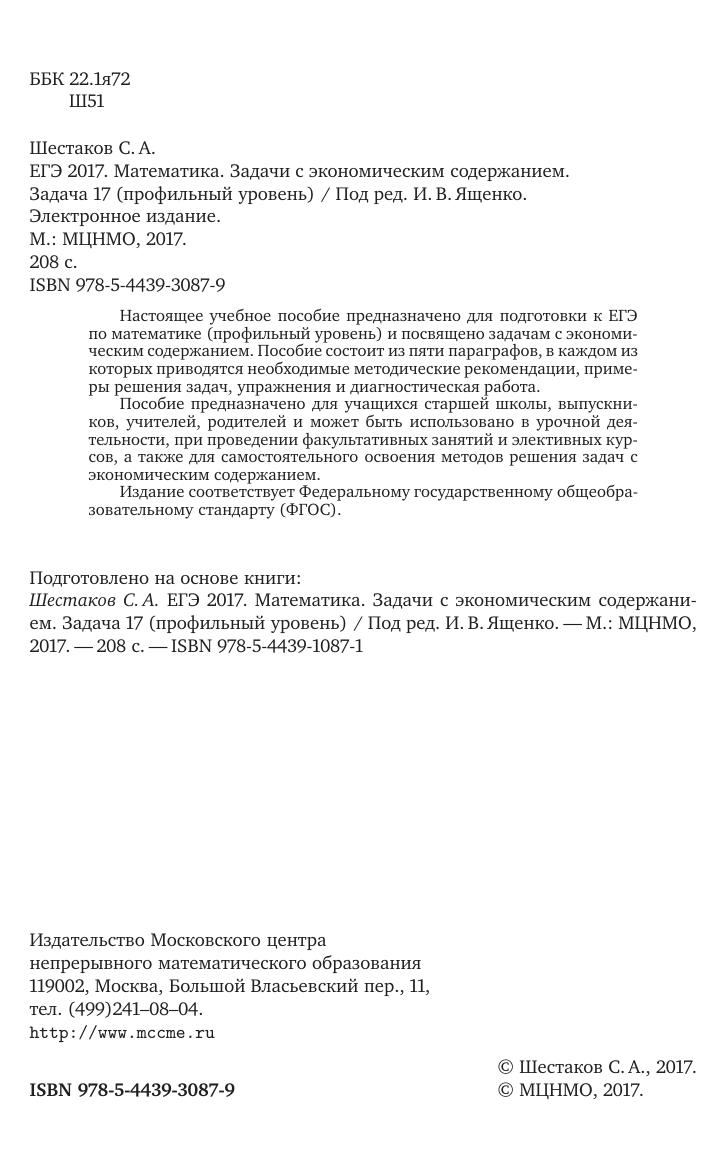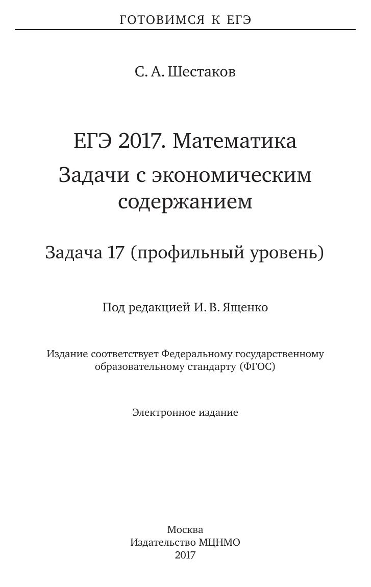 Настоящее учебное пособие предназначено для подготовки к ЕГЭ по математике (профильный уровень) и посвящено задачам с экономическим содержанием. Пособие состоит из пяти параграфов, в каждом из которых приводятся необходимые методические рекомендации, примеры решения задач, упражнения и диагностическая работа. Пособие предназначено для учащихся старшей школы, выпускников, учителей, родителей и может быть использовано в урочной деятельности, при проведении факультативных занятий и элективных курсов, а также для самостоятельного освоения методов решения задач с экономическим содержанием. Издание соответствует Федеральному государственному общеобразовательному стандарту (ФГОС).