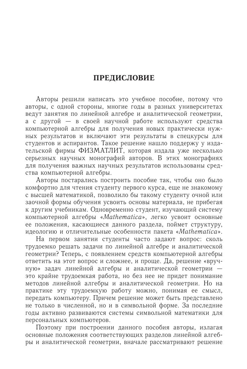 Пособие в первую очередь предназначено для студентов первого курса различных нематематических специальностей, а также для студентов старших курсов, аспирантов, инженеров, использующих в своей научной работе пакет символьной математики «Mathematica» . Пособие поможет освоить те разделы пакета, которые надо знать для решения задач линейной алгебры. Каждый раздел заканчивается заданиями для самостоятельной работы. Раздел «Ответы» содержит ответы для всех задач на основе их решения с помощью системы символьной математики «Mathematica».