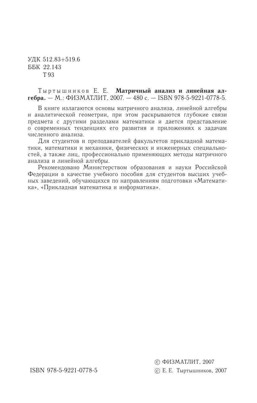 В книге излагаются основы матричного анализа, линейной алгебры и аналитической геометрии, при этом раскрываются глубокие связи предмета с другими разделами математики и дается представление о современных тенденциях его развития и приложениях к задачам численного анализа.Для студентов и преподавателей факультетов прикладной математики, математики и механики, физических и инженерных специальностей, а также лиц, профессионально применяющих м етоды матричногоанализа и линейной алгебры.