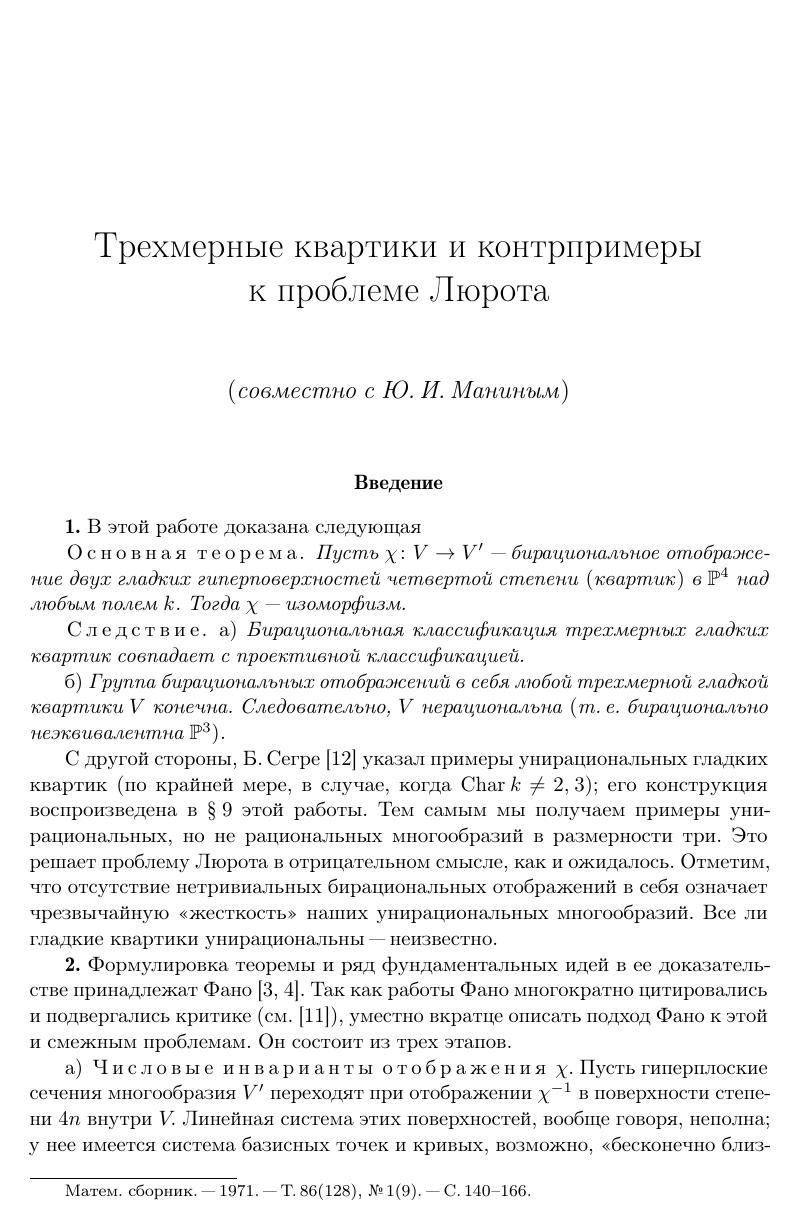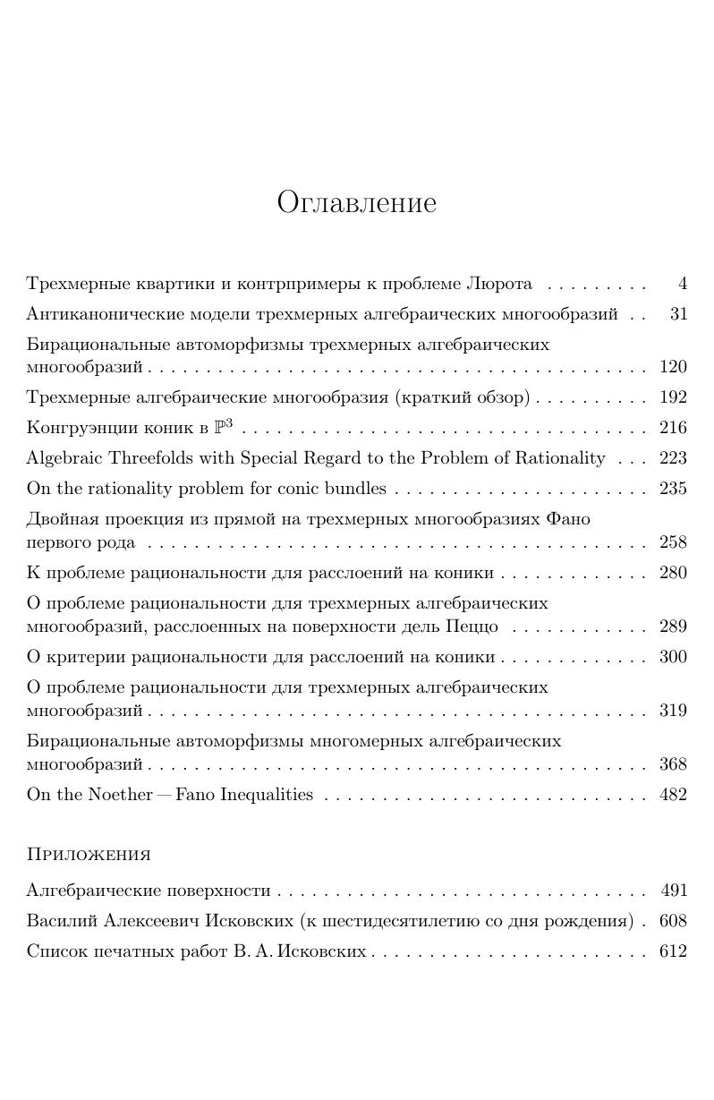 Книга является продолжением издания собрания математических трудов выдающегося русского математика, специалиста в области бирациональной алгебраической геометрии Василия Алексеевича Исковских. В нее включены работы по трехмерной бирациональной геометрии и классификации многообразий Фано, а также его совместная с И.Р. Шафаревичем обзорная статья по алгебраическим поверхностям. Первый том собрания трудов вышел в 2012 году под названием «Алгебраические поверхности: геометрия и арифметика». Для студентов старших курсов, аспирантов и научных работников.