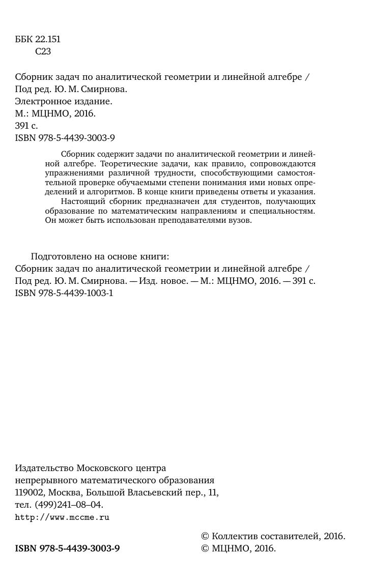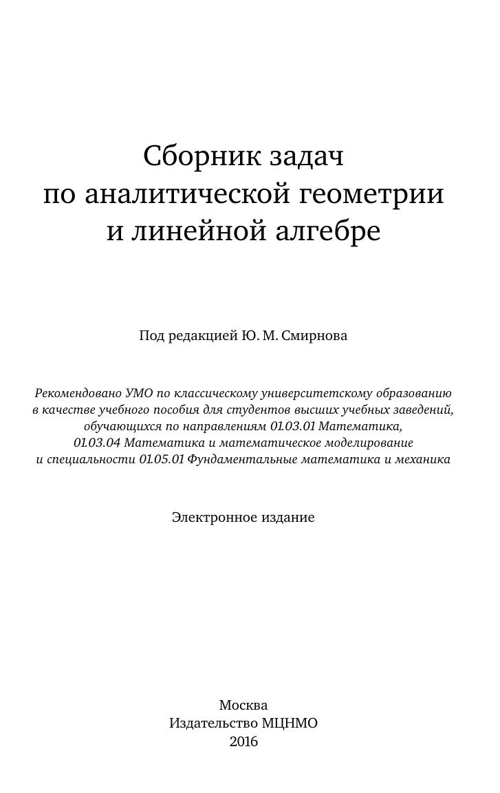 Сборник содержит задачи по аналитической геометрии и линейной алгебре. Теоретические задачи, как правило, сопровождаются упражнениями различной трудности, способствующими самостоятельной проверке обучаемыми степени понимания ими новых определений и алгоритмов. В конце книги приведены ответы и указания. Настоящий сборник предназначен для студентов, получающих образование по математическим направлениям и специальностям. Он может быть использован преподавателями вузов.
