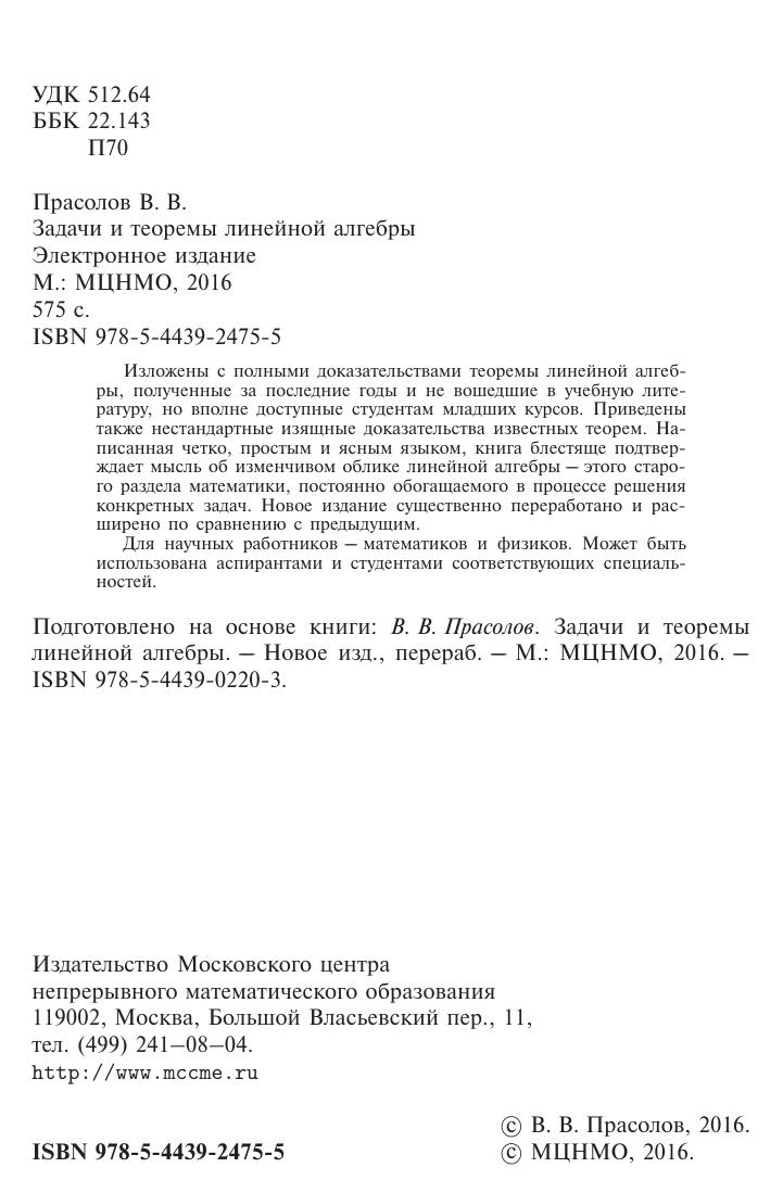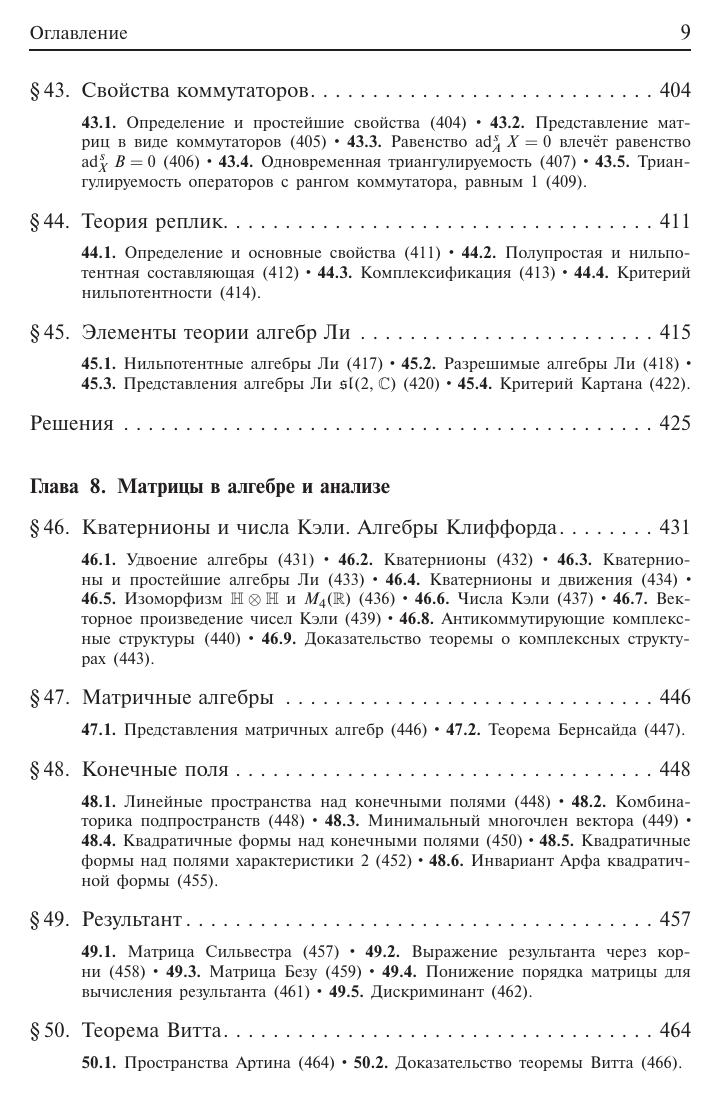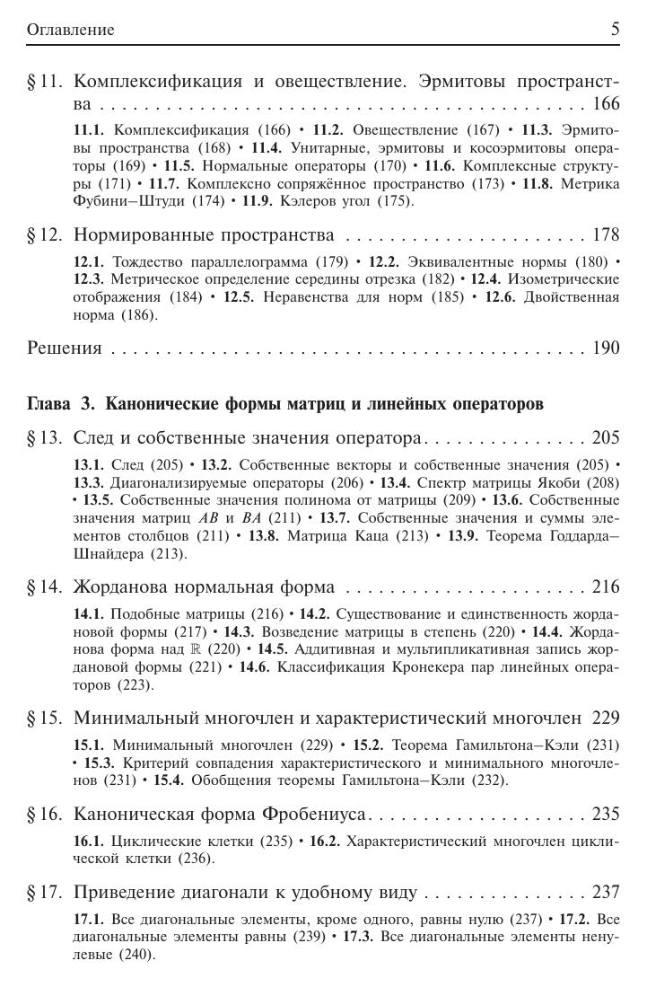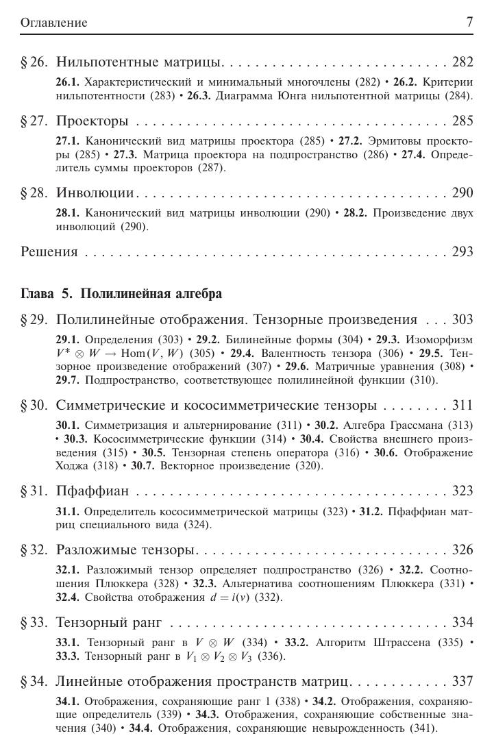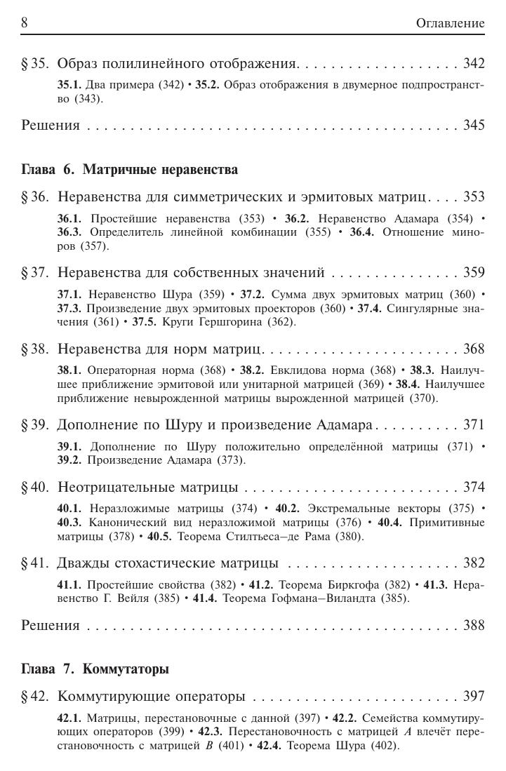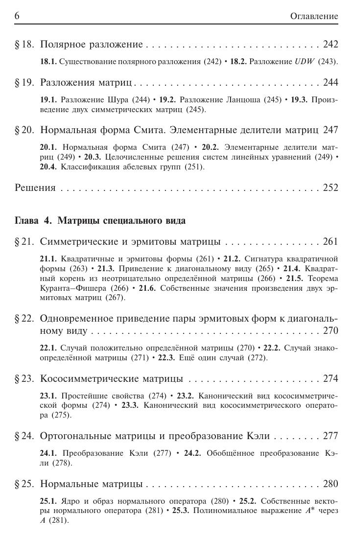 Изложены с полными доказательствами теоремы линейной алгебры, полученные за последние годы и не вошедшие в учебную литературу, но вполне доступные студентам младших курсов. Приведены также нестандартные изящные доказательства известных теорем. Написанная четко, простым и ясным языком, книга блестяще подтверждает мысль об изменчивом облике линейной алгебры –– этого старого раздела математики, постоянно обогащаемого в процессе решения конкретных задач. Новое издание существенно переработано и расширено по сравнению с предыдущим. Для научных работников –– математиков и физиков. Может быть использована аспирантами и студентами соответствующих специальностей.