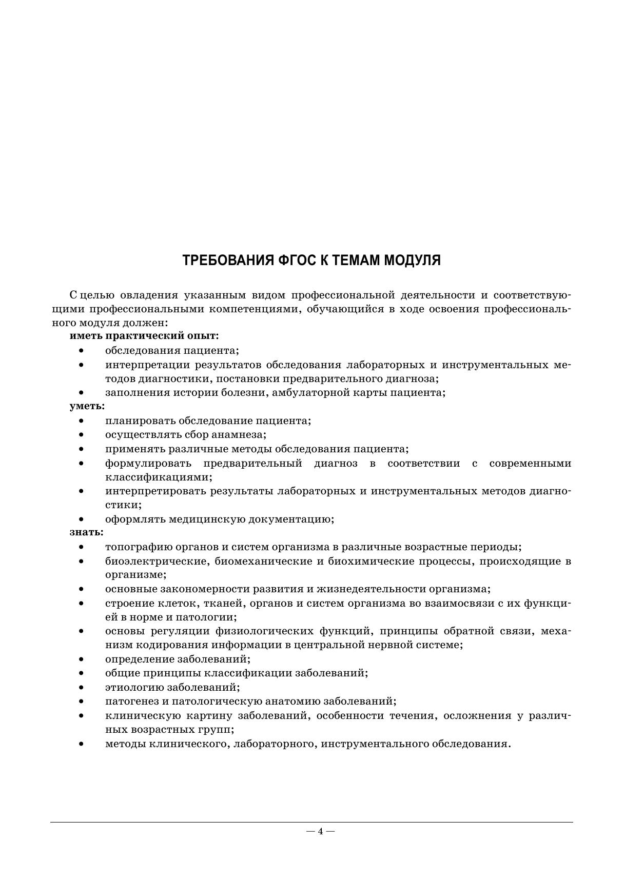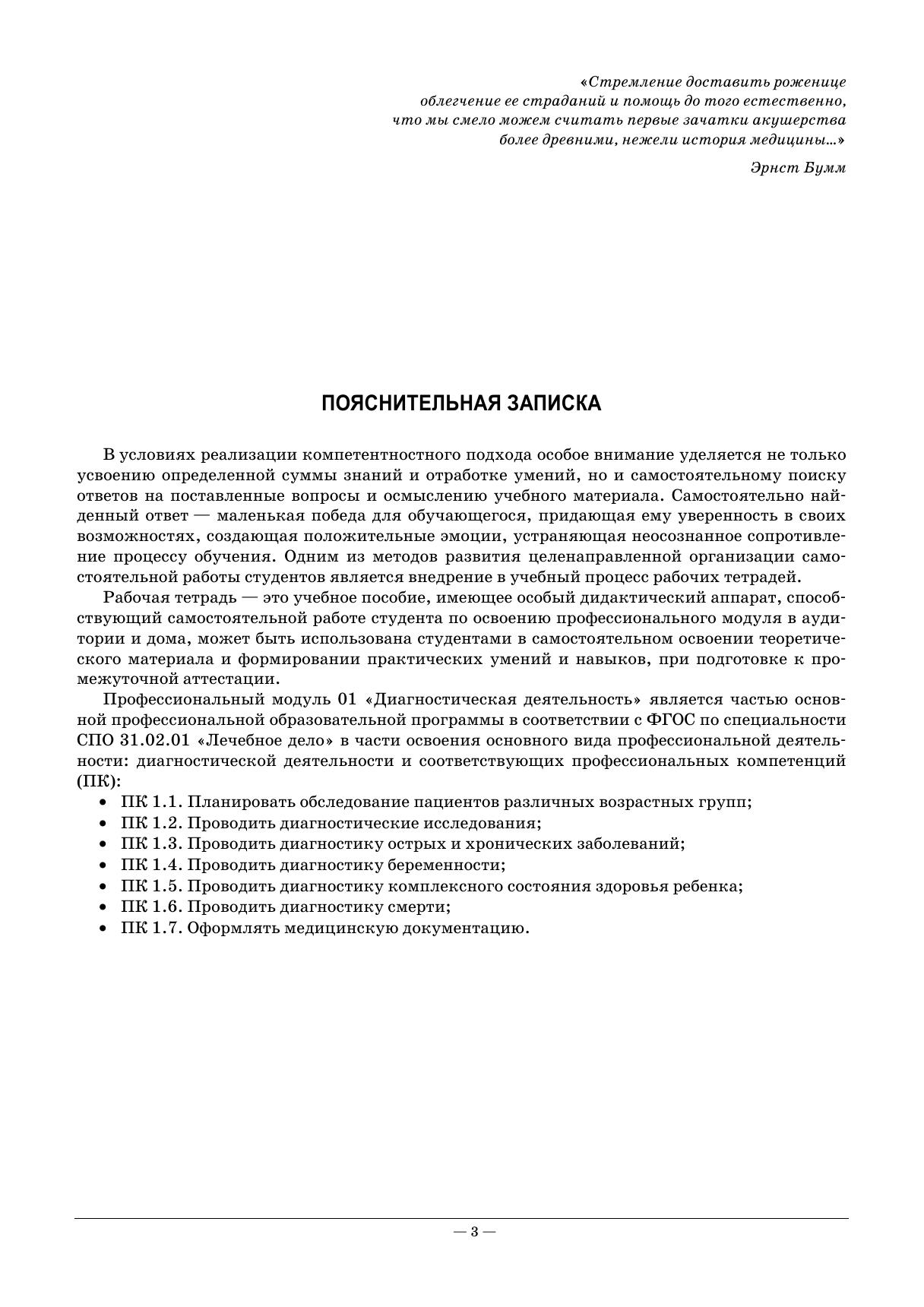 Рабочая тетрадь подготовлена в соответствии с действующим Федеральным государственным образовательным стандартом для студентов среднего профессионального образования по специальности «Лечебное дело» и примерной программой ПМ 01 «Диагностическая деятельность» МДК 01.01 «Пропедевтика клинических дисциплин». Она содержит требования ФГОС по профессиональному модулю, перечень компетенций и основных изучаемых вопросов. Каждое практическое занятие содержит разнохарактерные задания для всех его этапов: проверка исходного уровня знаний, актуализация и закрепление учебного материала — вопросы, тестовые задания, алгоритмы выполнения манипуляций, ситуационные задачи, домашнее задание. Тетрадь включает богатый иллюстративный материал, таблицы, схемы, латинскую терминологию, эталоны ответов к тестовым заданиям. Соответствует современным требованиям Федерального государственного образовательного стандарта среднего профессионального образования и профессиональным квалификационным требованиям. Издание предназначено для студентов медицинских училищ и колледжей.
