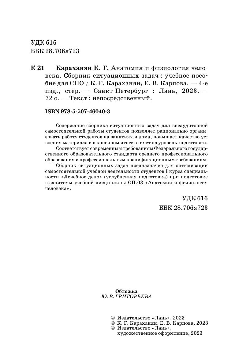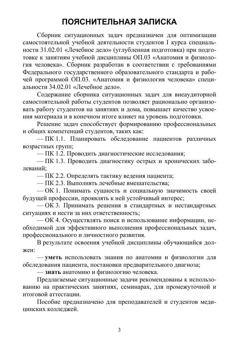 Сборник разработан в соответствии с требованиями Федерального государственного образовательного стандарта. Содержание сборника ситуационных задач для внеаудиторной самостоятельной работы студентов позволяет рационально организовать работу студентов на занятиях и дома, повышает качество усвоения материала и, в конечном итоге, влияет на уровень подготовки.Сборник ситуационных задач предназначен для оптимизации самостоятельной учебной деятельности студентов 1 курса специальности Лечебное дело, углубленная подготовка, при подготовке к занятиям учебной дисциплины ОП.03 Анатомия и физиология человека. Соответствует современным требованиям Федерального государственного образовательного стандарта среднего профессионального образования и профессиональным квалификационным требованиям.