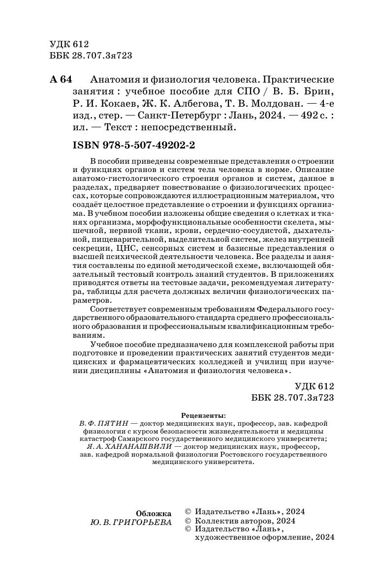 В пособии приведены современные представления о строении и функциях органов и систем тела человека в норме. Описание анатомо-гистологического строения органов и систем, данное в разделах, предваряет повествование о физиологических процессах, которые сопровождаются иллюстрационным материалом, что создаёт целостное представление о строении и функциях организма. В учебном пособии изложены общие сведения о клетках и тканях организма, морфофункциональные особенности скелета, мышечной, нервной ткани, крови, сердечно-сосудистой, дыхательной, пищеварительной, выделительной систем, желез внутренней секреции, ЦНС, сенсорных систем и базисные представления о высшей психической деятельности человека. Все разделы и занятия составлены по единой методической схеме, включающей обязательный тестовый контроль знаний студентов. В приложениях приводятся ответы на тестовые задачи, рекомендуемая литература, таблицы для расчета должных величин физиологических параметров. Соответствует современным требованиям Федерального государственного образовательного стандарта среднего профессионального образования и профессиональным квалификационным требованиям. Учебное пособие предназначено для комплексной работы при подготовке и проведении практических занятий студентов медицинских и фармацевтических колледжей и училищ при изучении дисциплины «Анатомия и физиология человека».