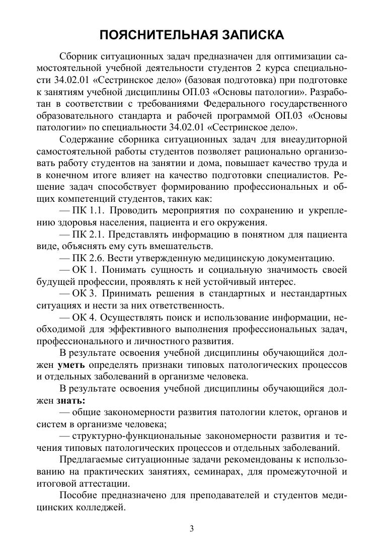 Сборник ситуационных задач предназначен для оптимизации самостоятельной учебной деятельности студентов 2 курса специальности «Сестринское дело» (базовая подготовка) при подготовке к занятиям учебной дисциплины ОП.03 «Основы патологии».