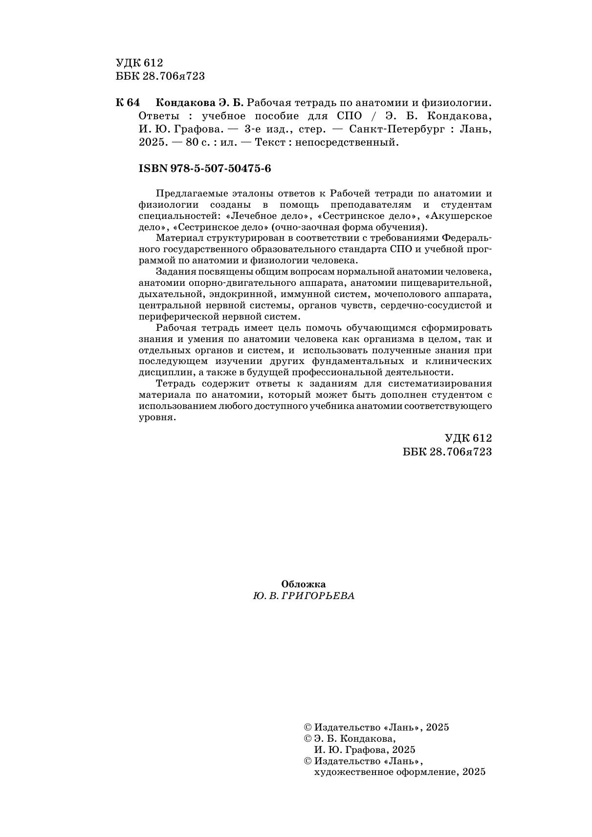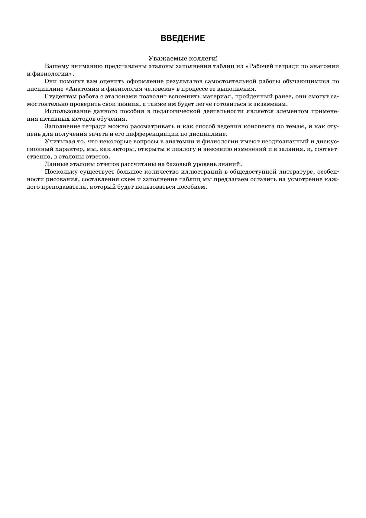 Предлагаемые эталоны ответов к Рабочей тетради по анатомии и физиологии созданы в помощь преподавателям и студентам специальностей: «Лечебное дело», «Сестринское дело», «Акушерское дело», «Сестринское дело» (очно-заочная форма обучения). Материал структурирован в соответствии с требованиями Федерального Государственного образовательного стандарта СПО и учебной программой по анатомии и физиологии человека. Задания посвящены общим вопросам нормальной анатомии человека, анатомии опорно-двигательного аппарата, анатомии пищеварительной, дыхательной, эндокринной, иммунной систем, мочеполового аппарата, центральной нервной системы, органов чувств, сердечно-сосудистой и периферической нервной систем. Рабочая тетрадь имеет целью помочь обучающимся сформировать знания и умения по анатомии человека, как организма в целом, так и отдельных органов и систем и использовать полученные знания при последующем изучении других фундаментальных и клинических дисциплин, а также в будущей профессиональной деятельности. Тетрадь содержит ответы к заданиям для систематизирования материала по анатомии, который может быть дополнен студентом с использованием любого доступного учебника анатомии соответствующего уровня.