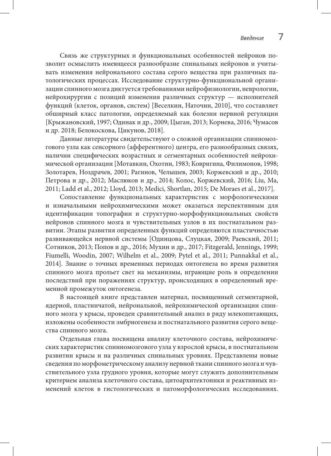 В монографии формулируется необходимость морфофункциональных исследований по идентификации групп спинальных нейронов. Подробно освещаются вопросы топографии интернейронов, критерии идентификации их по клеточному составу, ориентации отростков нервных клеток, нейрохимической характеристике. Особое внимание уделено описанию структурно-функционального разнообразия спинальных нейронов. в издании также обобщаются результаты морфологических, гистохимических и иммуногистохимических исследований нейронов спинномозговых узлов различного сегментарного уровня. Представленные результаты наблюдений за нейронами конкретных спинномозговых узлов белой крысы в различные возрастные периоды ее жизни способствуют пониманию динамики развития центров чувствительной иннервации, уточнению структурно-функциональной характеристики их нейронов, выявлению изменений нейронов чувствительных узлов под влиянием антропогенных факторов.