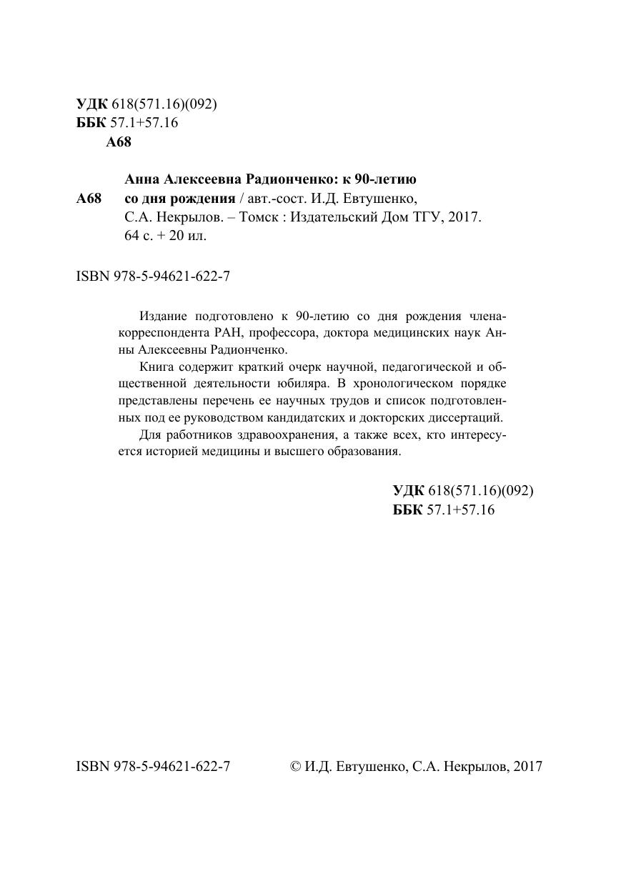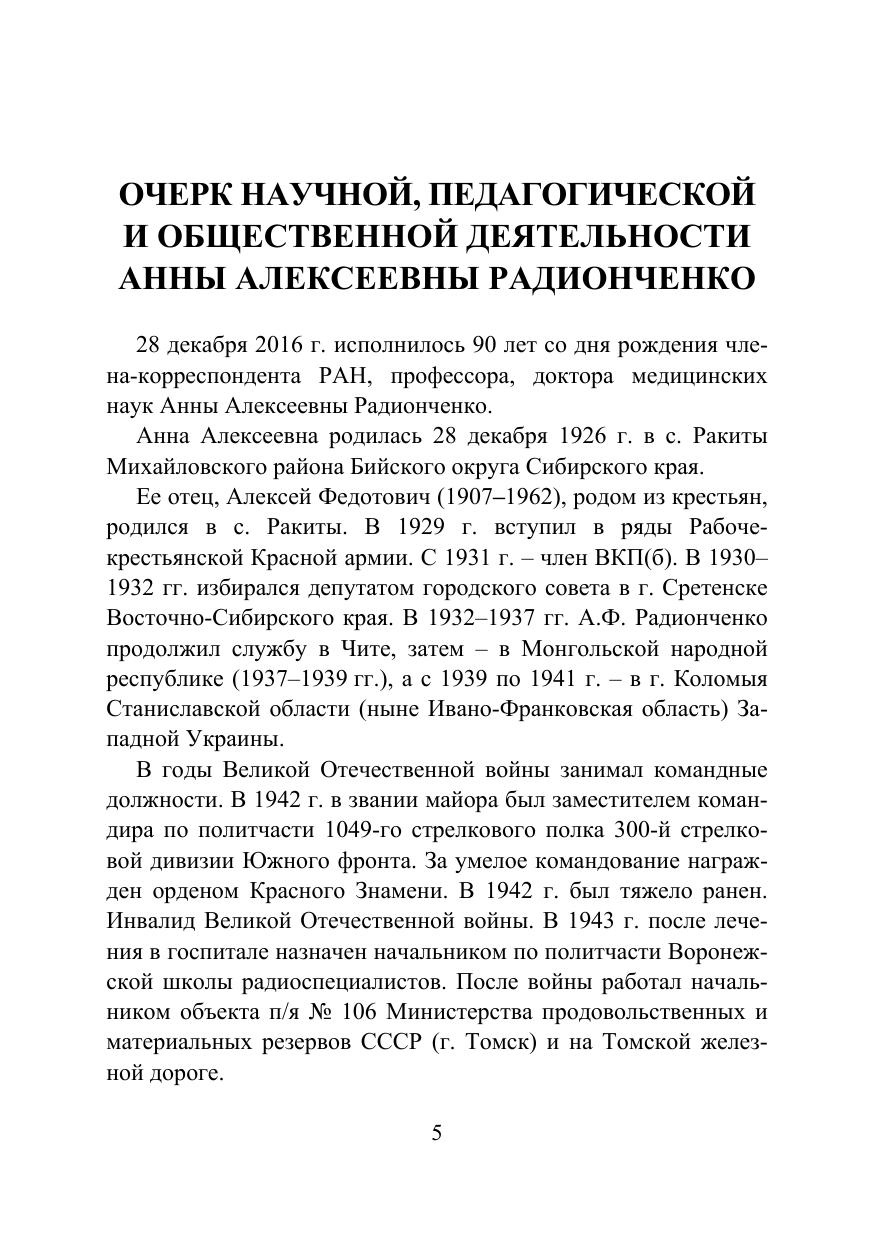 Издание подготовлено к 90-летию со дня рождения члена-корреспондента РАН, профессора, доктора медицинских наук Анны Алексеевны Радионченко.Книга содержит краткий очерк научной, педагогической и общественной деятельности юбиляра. В хронологическом порядке представлены перечень ее научных трудов и список подготовленных под ее руководством кандидатских и докторских диссертаций. Для работников здравоохранения, а также всех, кто интересуется историей медицины и высшего образования.